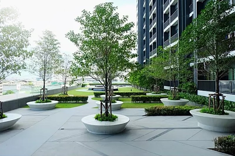 The east wings residential rooms are the Sky Garden, which has large trees planted. and open green space with seating.