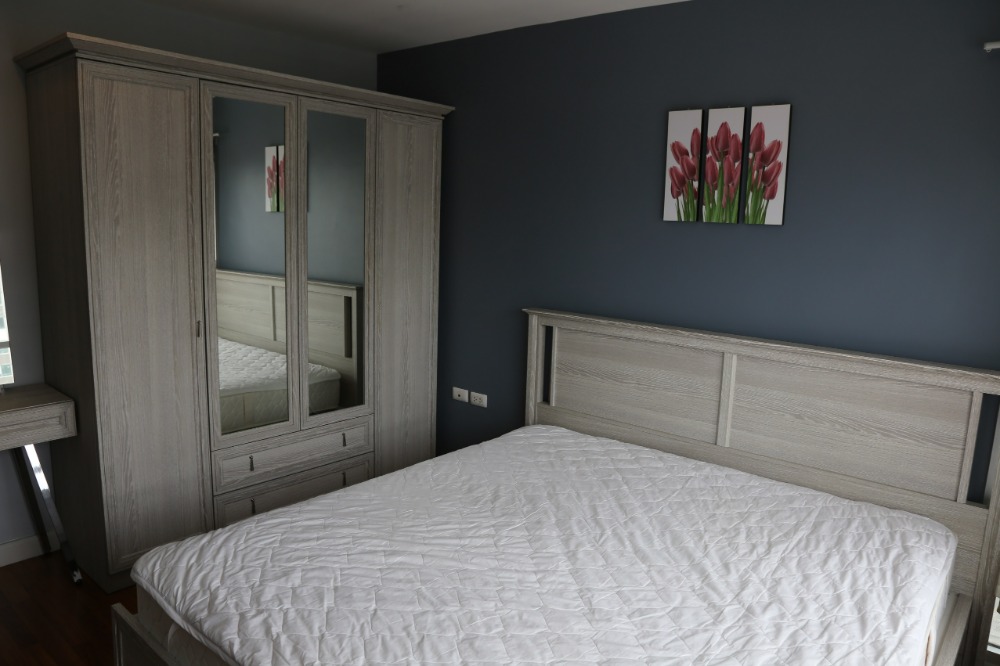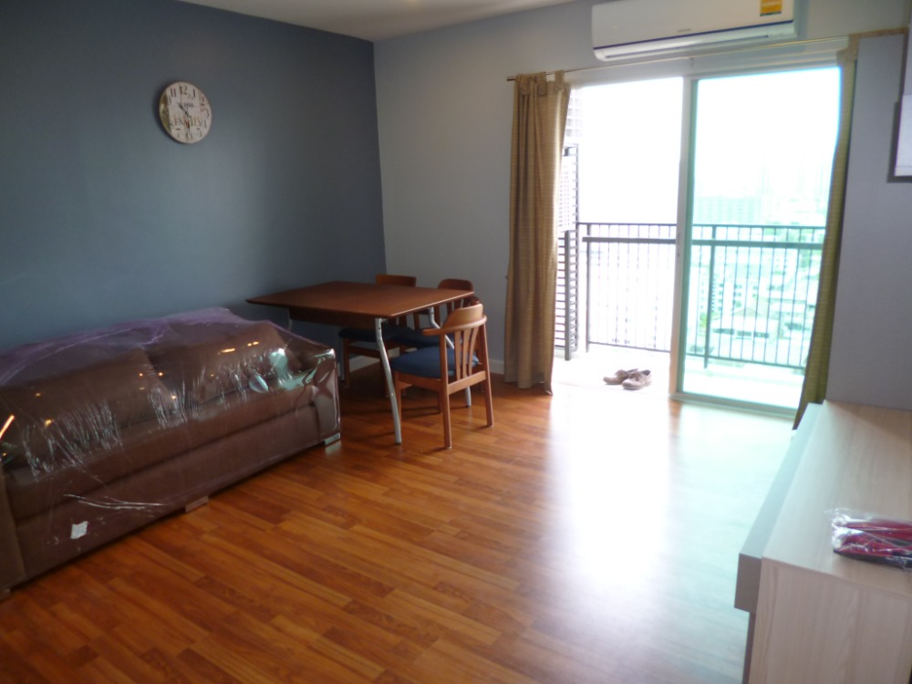 43 square meter furnished corner unit on 19th floor is available for sale. Rama 8 bridge can be seen from bedroom windows. The project consists of 244 units, decorated in European style. It is located