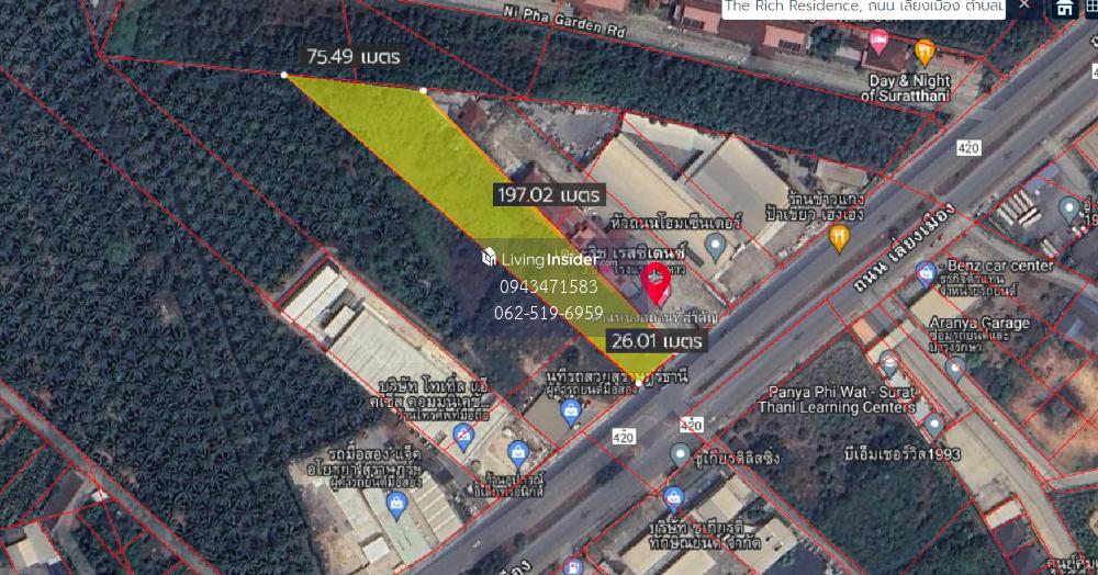 Land for sale, potential location, good investment price, By pass road, bypassing Surat Thani city. Next to The Rich Hotel Suitable for hotels, photo shows, department stores. Can be divided or sold together Land size 5 rai Width 26 meters, depth 255 meters near Tapan intersection , Central Department Store , Lotus Department Store Bang Yai Intersection Contact Khun To Contact number Line kc_bangkok