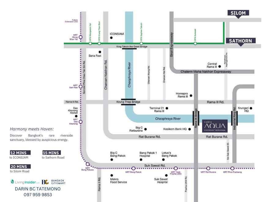 Noble Aqua Riverfront Ratburana - Icon Siam 12 mins - Sathorn Road 15 mins - Kings College, Shrewsbury International school 15 mins - Silom Road 20 mins House information Type: 5 bedrooms, 7 bathrooms (VUE)Usable area: 658 square meters House area: 83.3 square meters Number of floors: 4 floors Number of parking spaces: 5 parking spaces 1 MULTI PURPOSE 1 MAID'S QUARTER PRIVATE LIFT ELDERLY SUPPORT Price: 105,000,000 baht Note: Price is negotiable. -------------------------------- Contact for more information at (you can contact us 24 hours a day, no holidays). ) Line ID: Juthamartlim Phone number: Contact number Bangkok Citismart (Professional Property Agent)