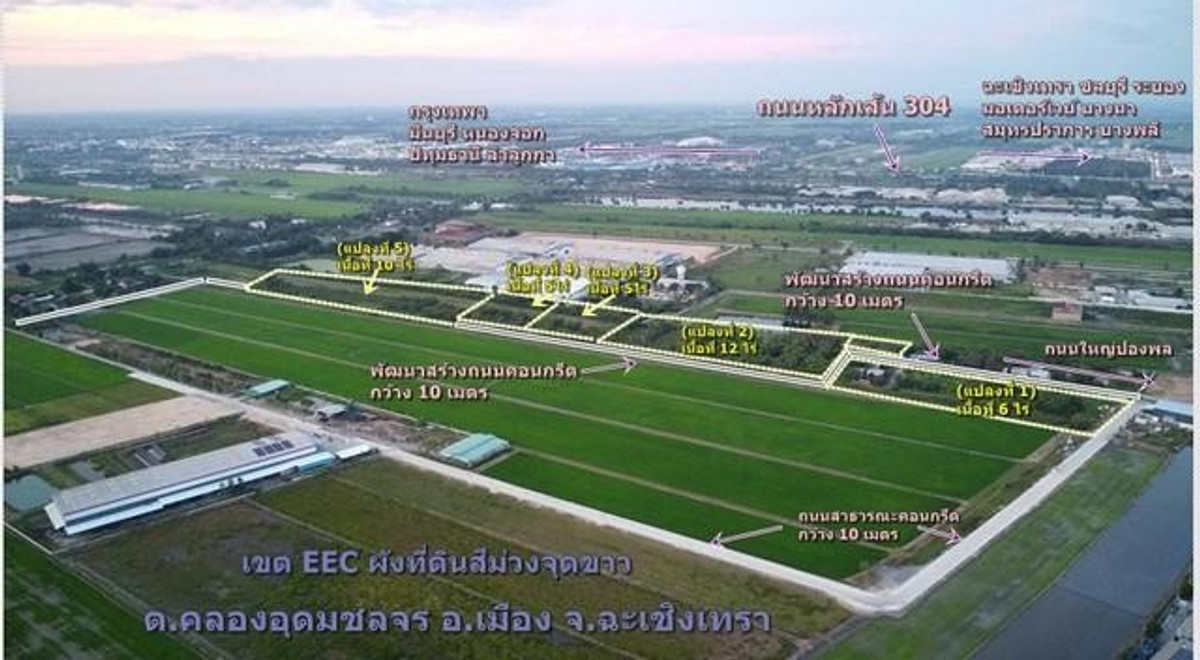 Land for sale in prime location in EEC area 5-40 rai, free filling to the same level as the road, Khlong Udom Chonlajorn, Mueang Chachoengsao Purple land plan with white dots suitable for building all types of factories, 10-meter wide concrete road in front of the plot Suitable for factories or warehouses, industrial businesses, distribution centers (Logistics Hub) Selling price 3,500,000 baht/rai (average only 8,750 baht/sq.w.) with filling to the same level as the road Location: Pongpol Road, Khlong Udom Chonlajorn Subdistrict, Mueang Chachoengsao District, Chachoengsao Province Contact: Mr. Phasapong Contact number, Contact number Line: deedaa23 Area 5-40 rai, width 120 meters, depth approximately 450 meters Light purple city plan with white dots EEC project area supports business and industry expansion Suitable for industry, warehouse, factory - The land is only 2 kilometers from Suwinthawong Road - Pongpol Road can connect to important roads such as Suwinthawong Road, Theparat-Lat Krabang Road, Rattanakosin 200 Years Road, and Bangna-Trad - Located in the Eastern Economic Corridor (EEC) - Supports the expansion of logistics, industry, and trade businesses - 12-meter wide concrete road - Electric poles - Water supply system Selling price 3,500,000 baht/rai (average only 8,750 baht/sq.w.) with soil filled to the same level as the road Location: Pongpol Road, Khlong Udom Chonlacharoen Subdistrict, Mueang Chachoengsao District, Chachoengsao Province Contact: Mr. Phasapong Contact number, Contact number Line: deedaa23 PL. Real Estate Broker http://www.kaibaanteedin.com Service for selling condos, houses, land, all types of real estate