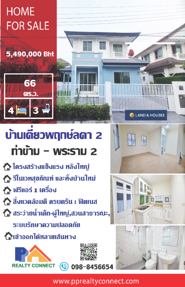 Single detached house for sale, Pruek Lada 2, Tha Kham, Rama 2, Anamai Ngam Charoen. Along the Golden Jubilee Ring near Suankularb School Single house, Prueklada 2 (Tha Kham-Rama 2), 2 floors, 4 bedrooms, 3 bathrooms, 1 air conditioners, 2 parking spaces. Location : Phrueklada Village 2, Along the Industrial Ring Road, Tha Kham Subdistrict, Bang Khun Thian District, Bangkok 10150 Area: 66 sq.w. Direction of the property: North Decoration : Curtain, Air conditioner Year built : 2007 The floor below is lined with granite tiles, and the upper floor on the 2nd floor is laminated wood. Facilities: 1. Clubhouse 2. Swimming pool, separate children's pool, adult pool 3. Fitness room 4. A common garden and a large pond 5. Playground 6. 24-hour security system with CCTV cameras throughout the project Nearby landmarks: 1. Suankularb Thonburi School, Royce Royal International School, Basis International School 2. Nakornthon Hospital, Bang Khun Thian Elderly Hospital 3. Central Rama 2, Big C, Home Pro, Lotus 4. Convenience stores: 7Eleven, Mini Big C, Lotus Express ====== How to go: from Sanitary Ngam Charoen Road Heading along the Kanchanaburi Ring Road When you see a red light intersection, turn left and go straight for about 900 meters, Phrueklada 2 Village is on the left. Price 5,490,000 baht and the total cost of the transfer is responsibled 50:50 between the seller and the buyer. Appointment or additional information Contact Suwapun Srisangsuk Thai Real Estate Broker Association : # Contact number PP.Realty Connect Tell : Contact number Line : suwapun.0701 https://line.me/ti/p/yzcKsudWHs