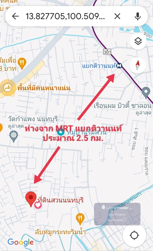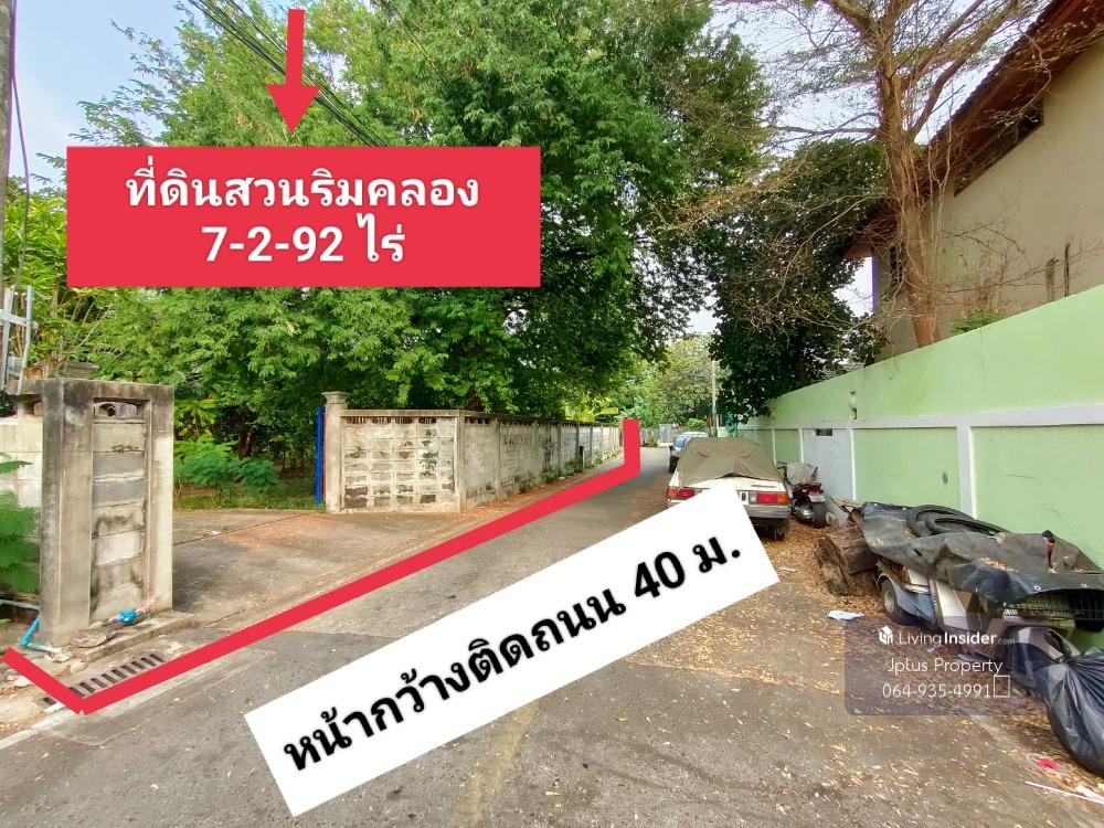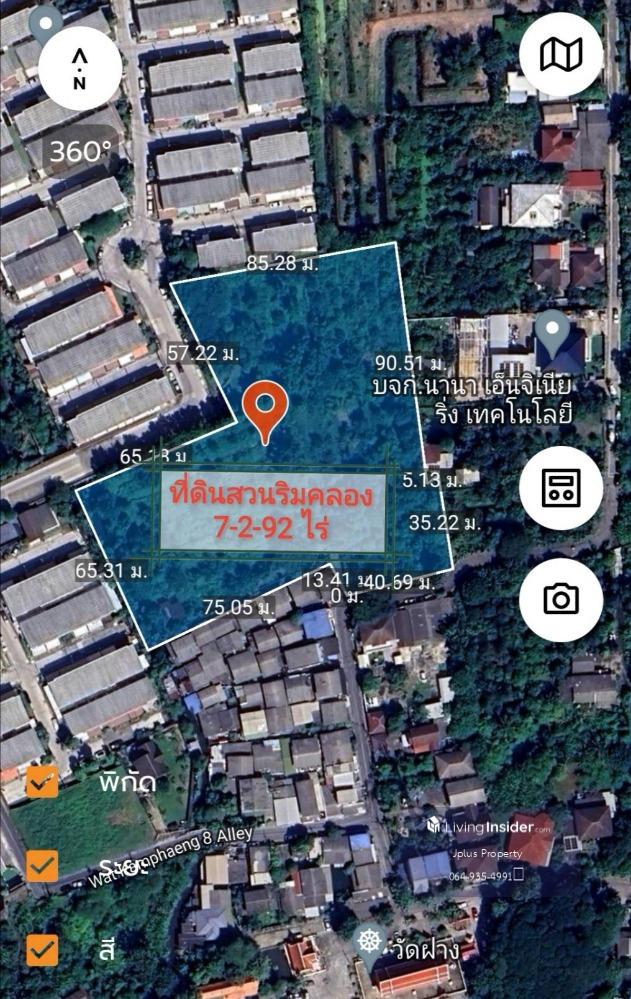 - Garden land for sale along the canal, already filled in, total area 7-2-92 rai (3,092 sq m.) - Adjacent rectangular plots, 2 title deeds - The front of the plot is next to the road, approximately 40 meters wide, 125 meters deep on the right side, 135 meters deep on the left side. - Road in front of the land is 6 meters wide. - The front of the land faces south. Good direction according to Feng Shui principles - Land type is agricultural land. The land has been filled in at street level. The atmosphere of the garden house along the canal is shady. The area surrounding the land is all villages. - Orange color district plan Y.6 (medium density residential land type) suitable for investment. Do residential projects, townhomes, condos, agritourism businesses. - Good location, convenient travel, near the MRT Purple Line, Tiwanon Intersection, at the mouth of the alley (about 2.5 km.) can enter and exit many routes, including Bangkok-Non Road, Soi 7 (Soi Senasariddet), Phibunsongkhram Road, Nakhon In Road, Soi Wat Kamphaeng Highlights of the land: - The front of the land is next to the road (Soi Wat Kamphaeng 8) 40 meters wide and the road in front of the land is 6 meters wide. - The land is in a community area. Adjacent to the Golden Town Wong Sawang - Ratchada Village Project. Suitable for housing projects - Good location, convenient travel, entrance to Soi Pibulsongkram 22. can break through Bangkok-Nonthos Road 7, at the entrance of the alley is the MRT Tiwanon Intersection. Location: Soi Phibunsongkhram 22-6 (Soi Wat Kamphaeng 8), Krungthep-Nont Road 7, Bang Khen Subdistrict, Mueang Nonthaburi District, Nonthaburi Province Coordinates: 13.82802273, 100.51005824 Nearby important places: Big C Tiwanon, Central Rattanathibet, Lotus Express, CJ Supermarket, Oakwood Suites Tiwanon Bangkok Hotel, Wall Eight Futsal Field, Wat Kamphaeng Nonthaburi, Wat Fang, Golden Village. Town Wong Sawang-Ratchada, Phibun Townhome Village, Rim Suan Village, Tor Fun Village, Bowonphan Kindergarten School, Wat Fang School, Satri Nonthaburi School, University of Technology King Mongkut's University of Technology North Bangkok, Ministry of Public Health Phra Nang Klao Hospital, Le Lak Hospital, Tha Nam Non Market ***Selling price for the whole plot: 130,000,000.- baht or 42,044 baht per square wa (total transfer day expenses 50/50)*** If interested, contact / Contact: Tel. Contact number, Contact number Ms. Uraiwan (Jum) Line ID : Contact number Email : Contact email www.jplusproperty.myweb.in.th Consignment service for selling-buying-renting all types of real estate.