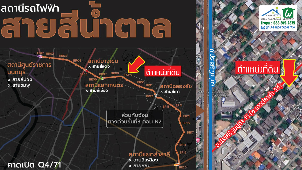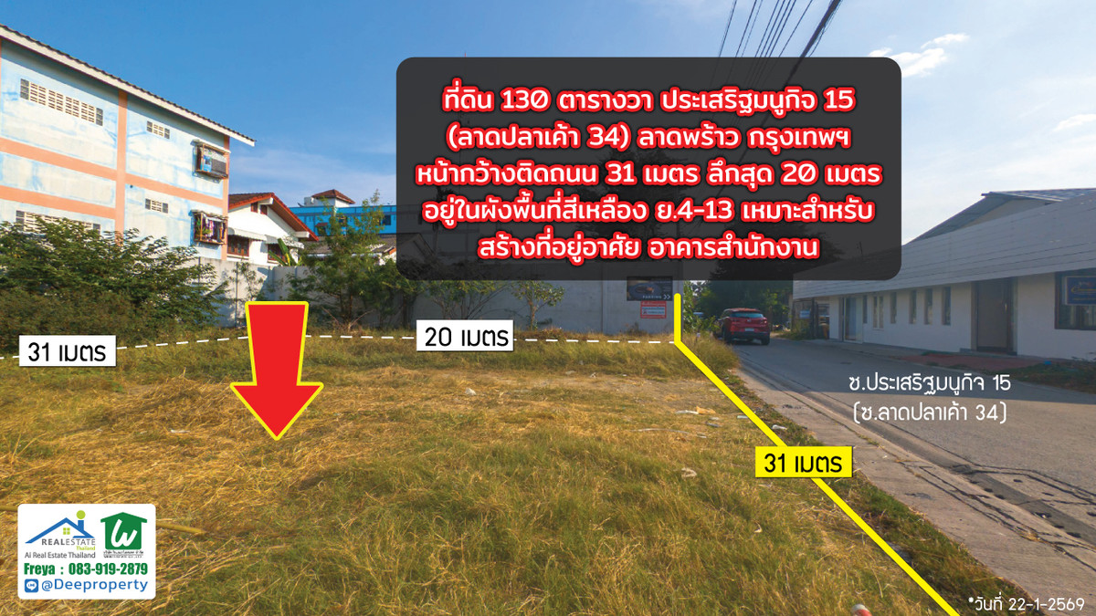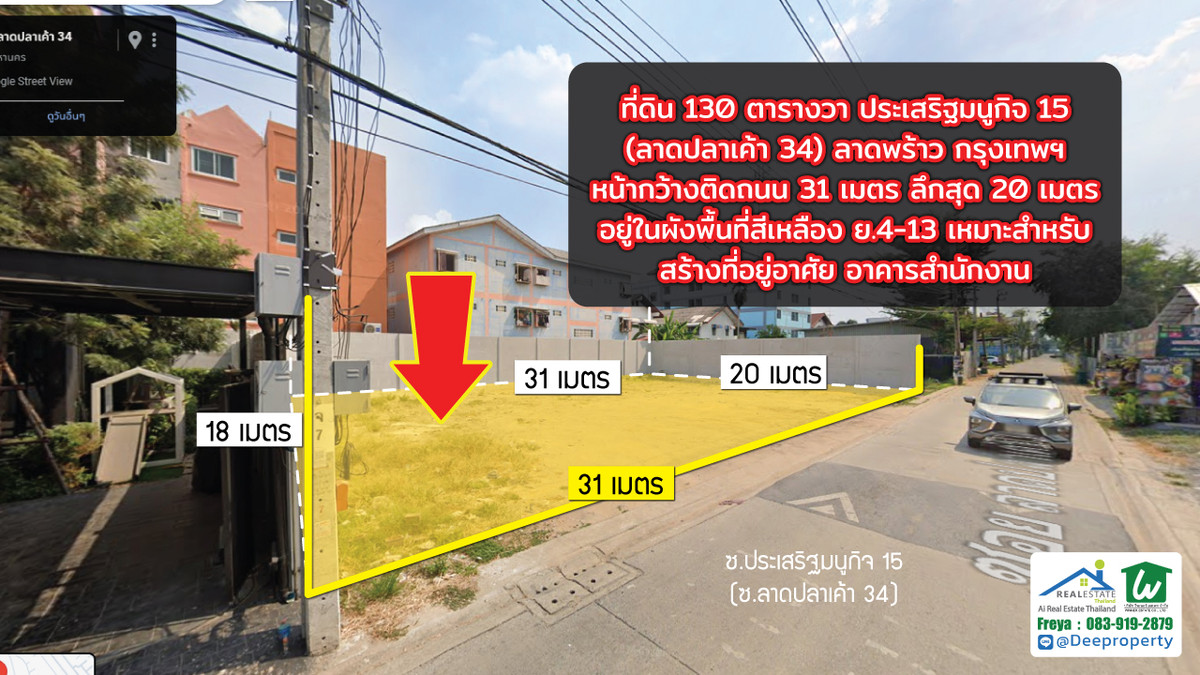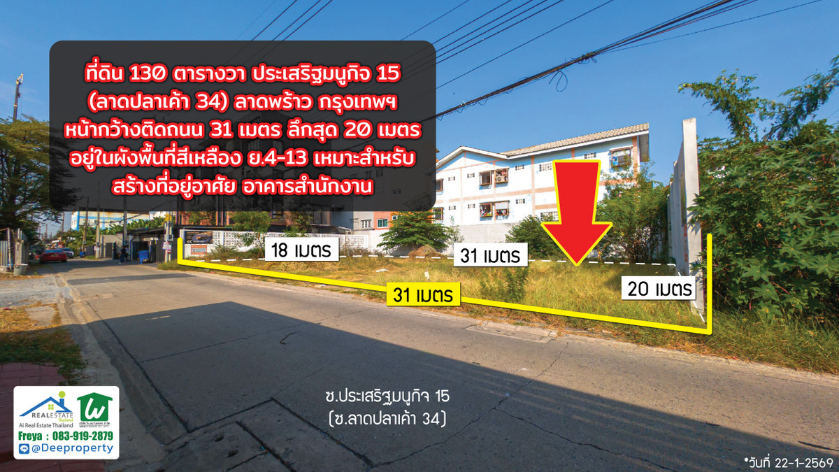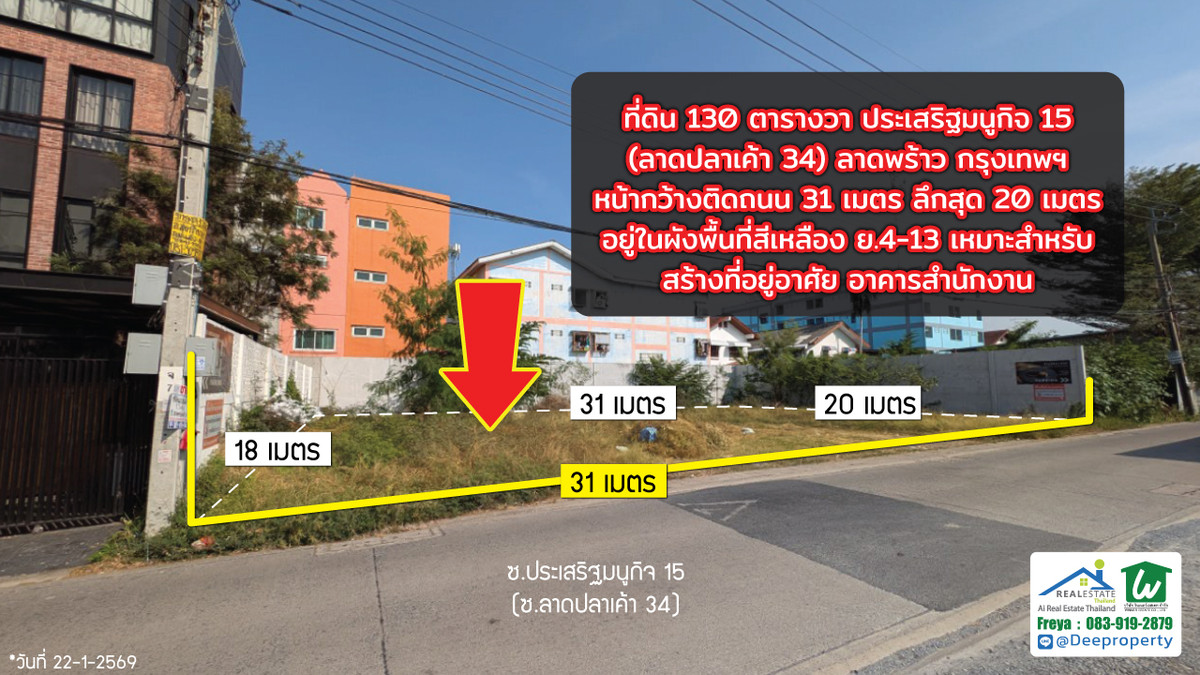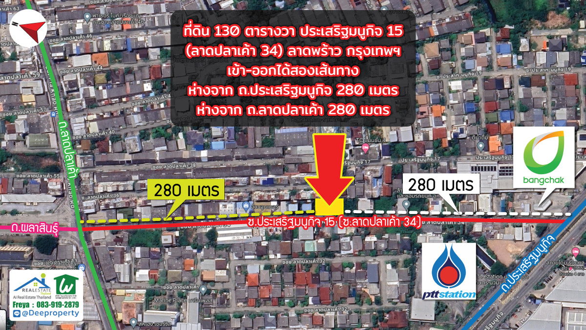 🌏 Prime Development Land for Sale – Kaset–Nawamin Growth Corridor, Bangkok . 📍 Soi Prasert-Manukit 15 (Soi Lat Pla Khao 34) 📌 Only 280 meters from Prasert-Manukit Main Road . 📐 Land Area: 134 sq.wah 📏 Wide 31-meter frontage , 20-meter depth 🟠 Orange Zoning (Medium-Density Residential) 🚆 Close to the future MRT Brown Line (infrastructure expansion zone) . 💼 Investment Highlights . ✔ Located in the rapidly developing Kaset–Nawamin / Lat Phrao district ✔ Positioned within an established residential and commercial community ✔ Dual access via Prasert-Manukit Road and Lat Pla Khao Road ✔ Surrounded by fuel stations (Bangchak, PTT), retail shops, local businesses ✔ Strong long-term capital appreciation potential driven by transit expansion . 🏗 Suitable for: . • Luxury private residence • Boutique apartment development • Low-rise office building • Home office / clinic • Land banking for future appreciation . This plot offers an attractive entry price point compared to core CBD areas, while still benefiting from strong urban connectivity and planned infrastructure growth. . Bangkok’s northeastern corridor continues to see consistent demand from middle- to upper-income residential buyers and SME businesses. . 📞 Contact (English-speaking representative) Freya : Contact number , Contact number 📲 Line: @deeproperty (please include @) 🌐 www.deeproperty.net . #BangkokLandForSale , #KasetNawamin , #LatPhraoProperty , #PrasertManukit15 , #BangkokInvestment , #ThailandProperty , #DevelopmentLandBangkok , #OrangeZoneBangkok , #MRTBrownLine , #DeeProperty