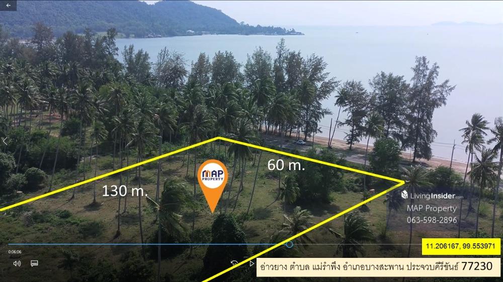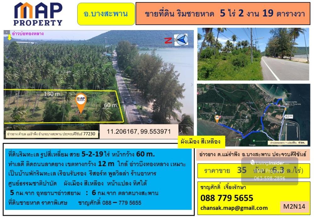 Contact Agent : Mr. Chansak 088.779.5655 Addline : https://line.me/ti/p/hIQ_UdzHL9 Beachfront land for sale 5 rai 2 ngan @ Ao Yang Bang Saphan - Land by the sea Beautiful rectangular shape, 5-2-19 rai - width 60 m., good location, next to a paved road, road width 12 m - Near Bueng Thonglang Bay Suitable for a beach house, guest house, resort, pool villa, restaurant, natural therapy center. - Yellow city plan, front of the plot, south side - 5 km. from Ao Siam National Park, 6 km. from Bang Saphan Market, beach land, special price