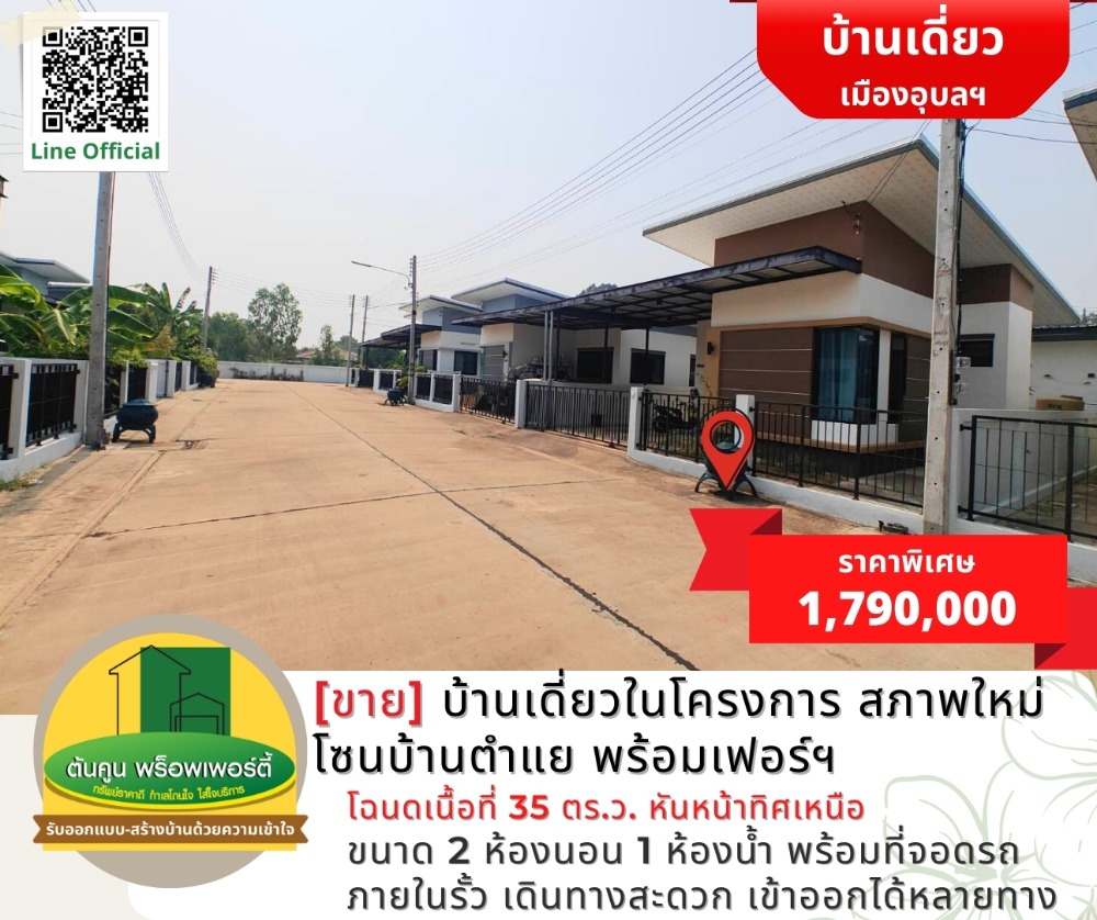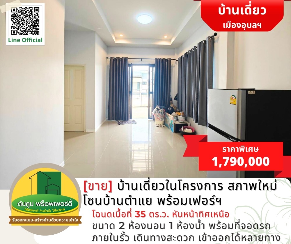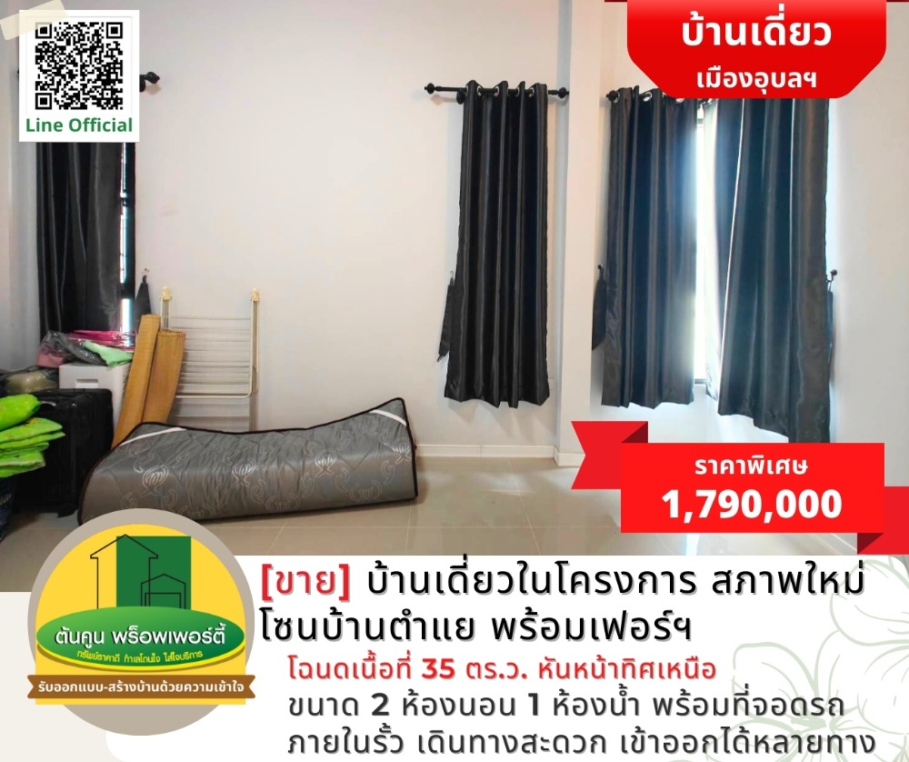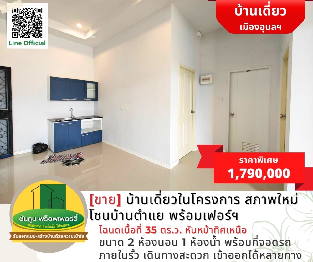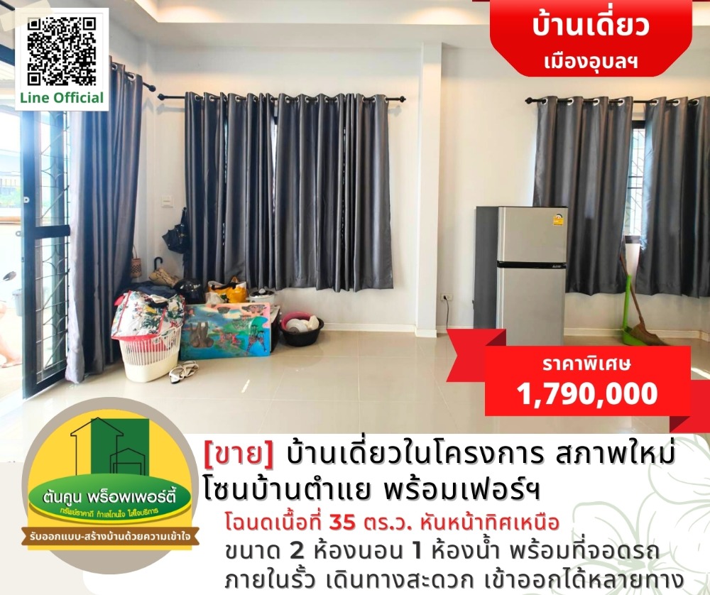 [For Sale] Single house in the project, new condition, Ban Tam Yae zone, ready to move in, free furniture [Code TK-1944-B309] Highlights: ✅ Single house with 2 bedrooms, 1 bathroom, with parking inside the fence, new condition ✅ Title deed area 35 sq m. Facing north ✅ Convenient travel, can enter and exit in many ways in Ubon Ratchathani. Most importantly, the water didnt flood ✅ The house is ready to live in. There are many furniture items included ✅ Make an appointment to see the house, negotiable, ready to take you to apply for a loan and walk through all the documents Coordinates: https://maps.app.goo.gl/gLkE8ifiEHYpMxnu5 Nearby places: Na Mueang Intersection (1.5 kilometers), Big C Muang Ubon (3.9 kilometers), Sappasit Hospital (7.4 kilometers) Price 1,790,000 baht (expenses at the land office are half each) If interested in making an appointment to see the house/land, chat with Line Official: http://line.me/R/ti/p /%40rjg7947j -------------------------------- or contact for more information ☎️: Contact number (Chet Tonkoon) Line: @ubonproperty ☎️: Contact number (TonKoon) --------------------------------