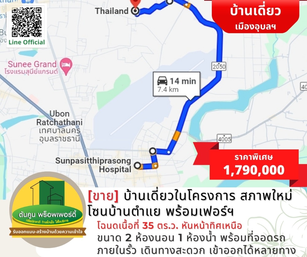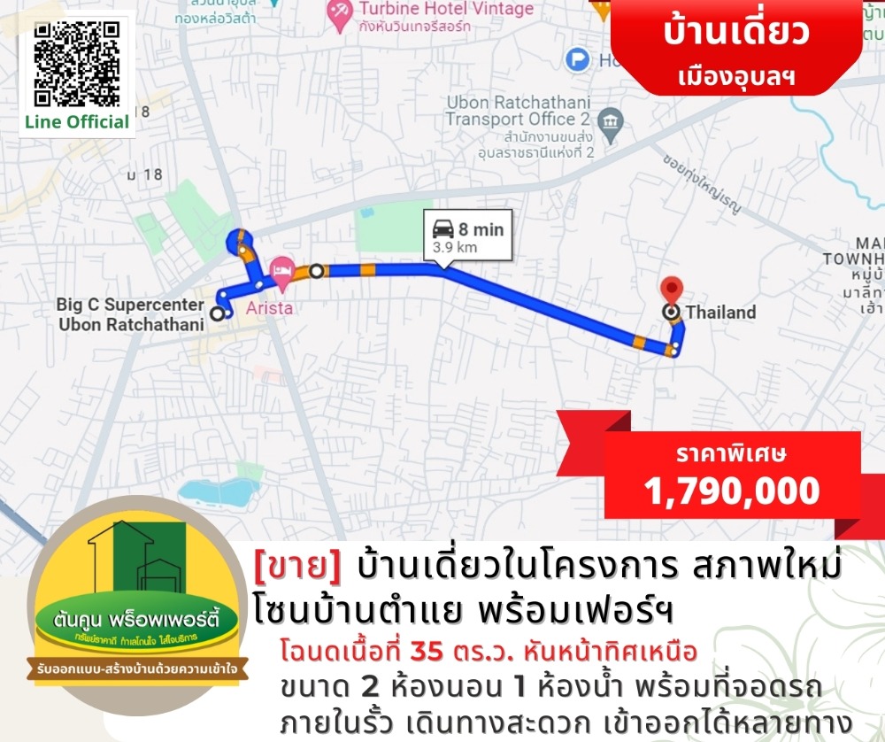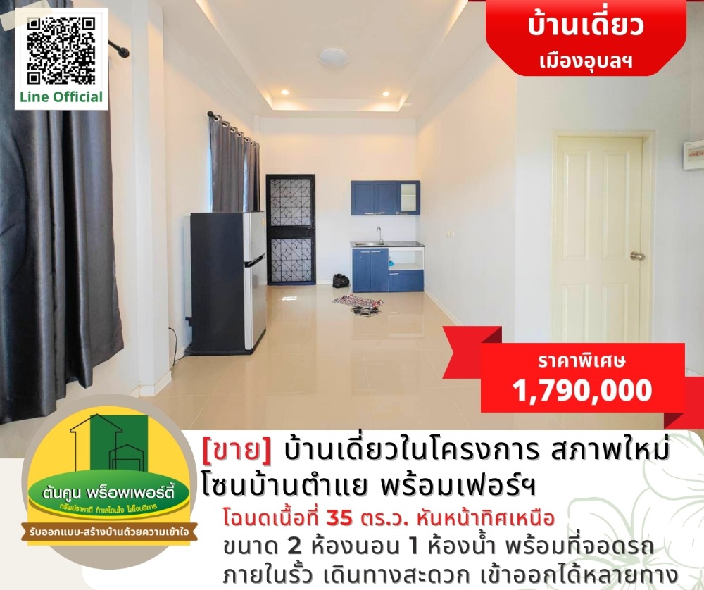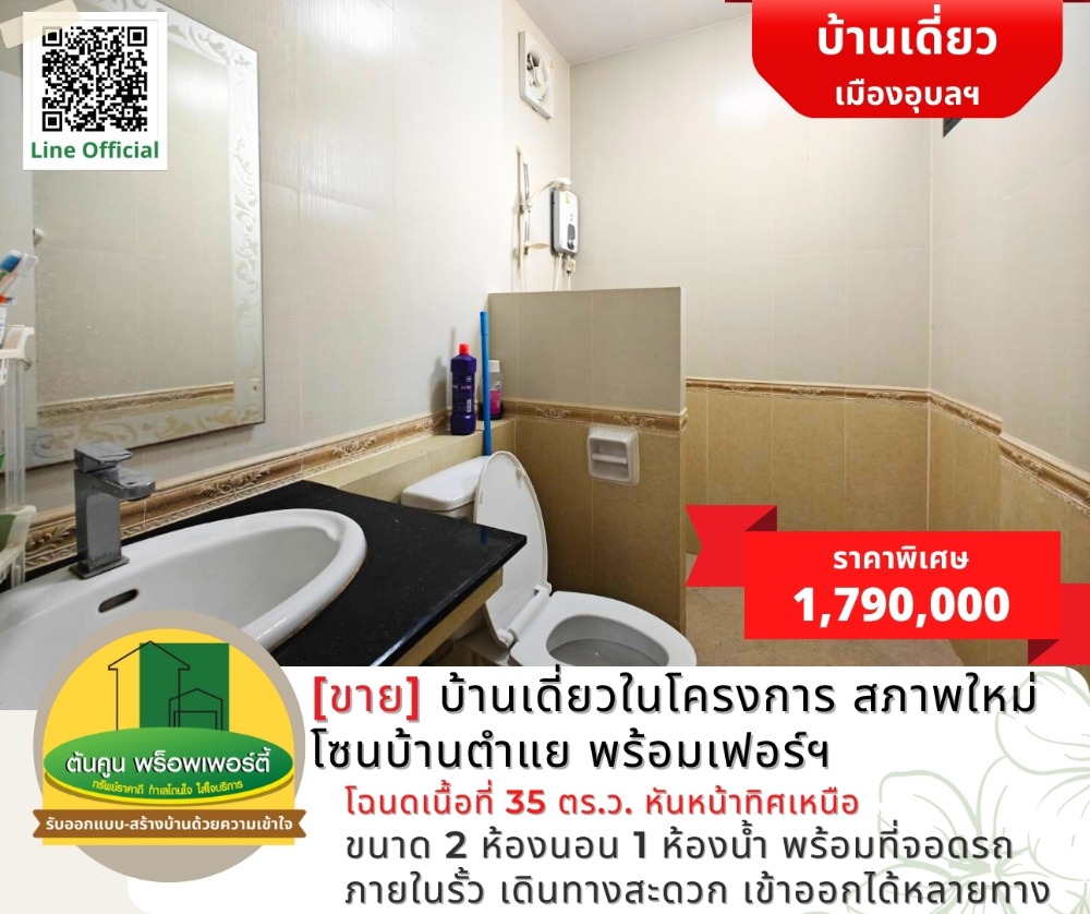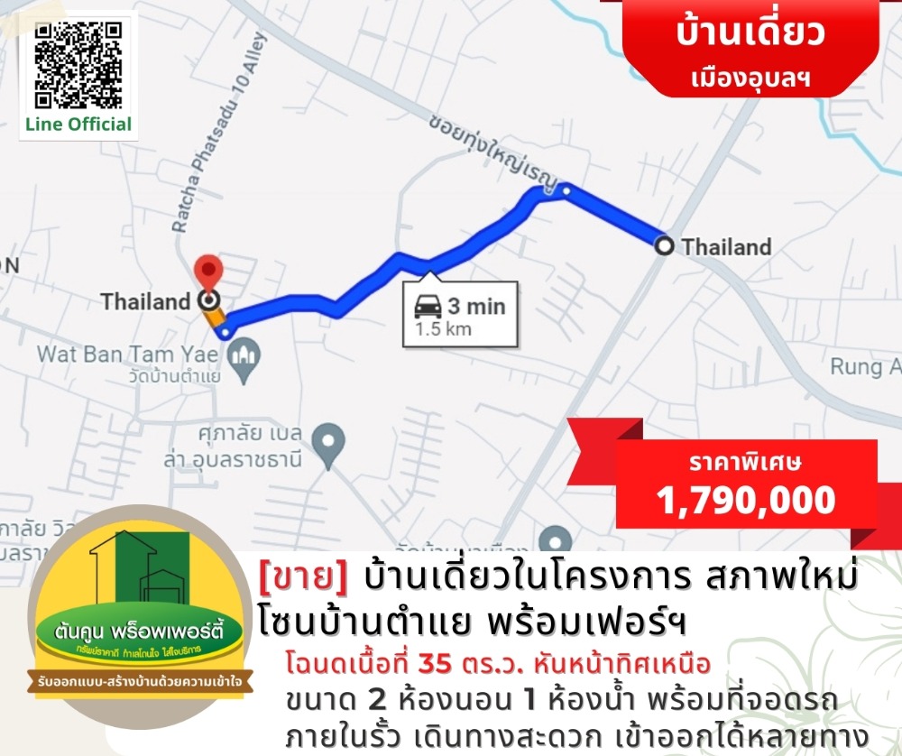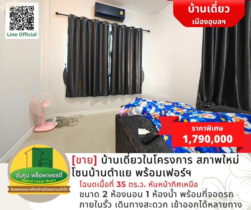 [For Sale] Single house in the project, new condition, Ban Tam Yae zone, ready to move in, free furniture [Code TK-1944-B309] Highlights: ✅ Single house with 2 bedrooms, 1 bathroom, with parking inside the fence, new condition ✅ Title deed area 35 sq m. Facing north ✅ Convenient travel, can enter and exit in many ways in Ubon Ratchathani. Most importantly, the water didnt flood ✅ The house is ready to live in. There are many furniture items included ✅ Make an appointment to see the house, negotiable, ready to take you to apply for a loan and walk through all the documents Coordinates: https://maps.app.goo.gl/gLkE8ifiEHYpMxnu5 Nearby places: Na Mueang Intersection (1.5 kilometers), Big C Muang Ubon (3.9 kilometers), Sappasit Hospital (7.4 kilometers) Price 1,790,000 baht (expenses at the land office are half each) If interested in making an appointment to see the house/land, chat with Line Official: http://line.me/R/ti/p /%40rjg7947j -------------------------------- or contact for more information ☎️: Contact number (Chet Tonkoon) Line: @ubonproperty ☎️: Contact number (TonKoon) --------------------------------