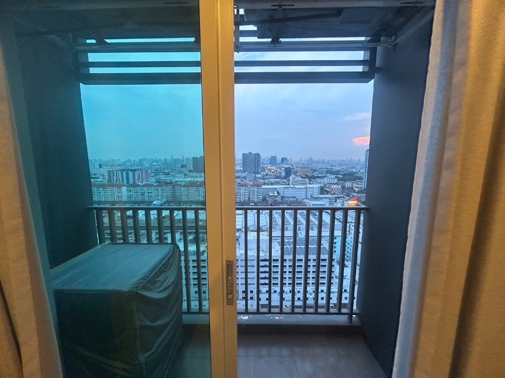 For rent, Niche Mono Ramkhamhaeng, 14,000฿/month, 23rd floor, west balcony. Sunset view, Building A does not block the view 📺Electrical appliances: TV, refrigerator, washing machine, microwave, electric stove, range hood, air conditioner, water heater