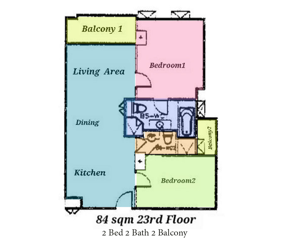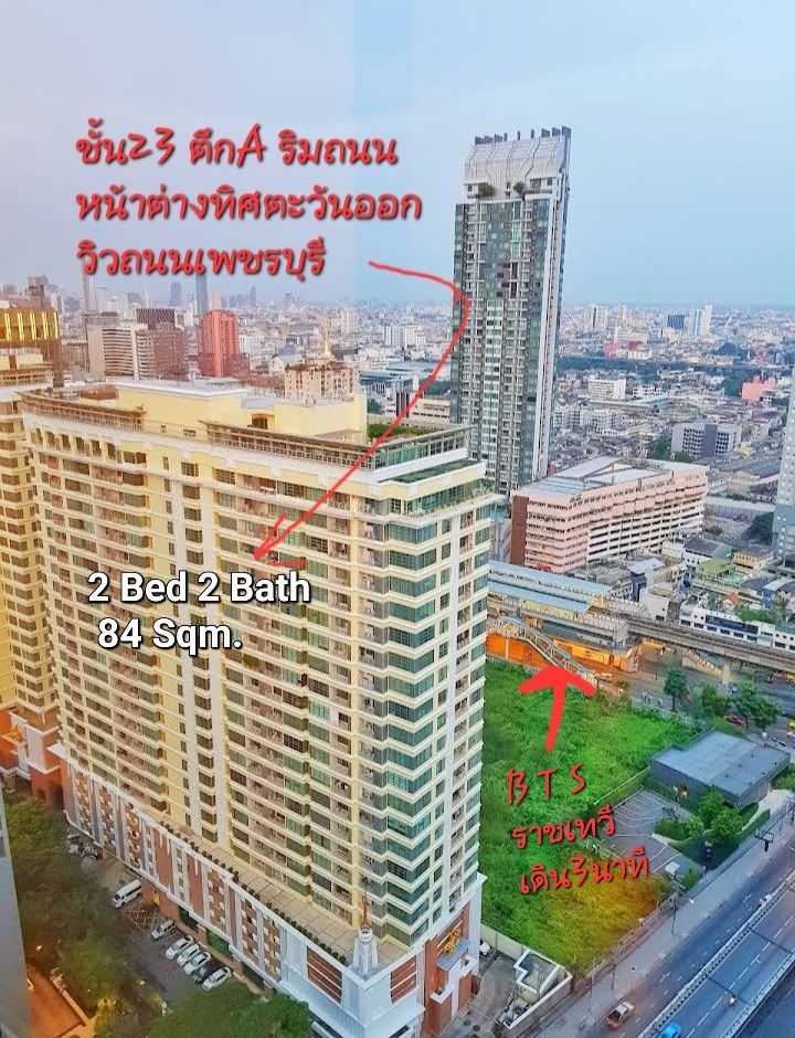 Condo for sale, 2 bedrooms, 2 bathrooms, 84 sq m., has a balcony in every room, next to the main road, 200m to BTS Ratchathewi, with private parking, FixParking. Excellent location, close to the eleva