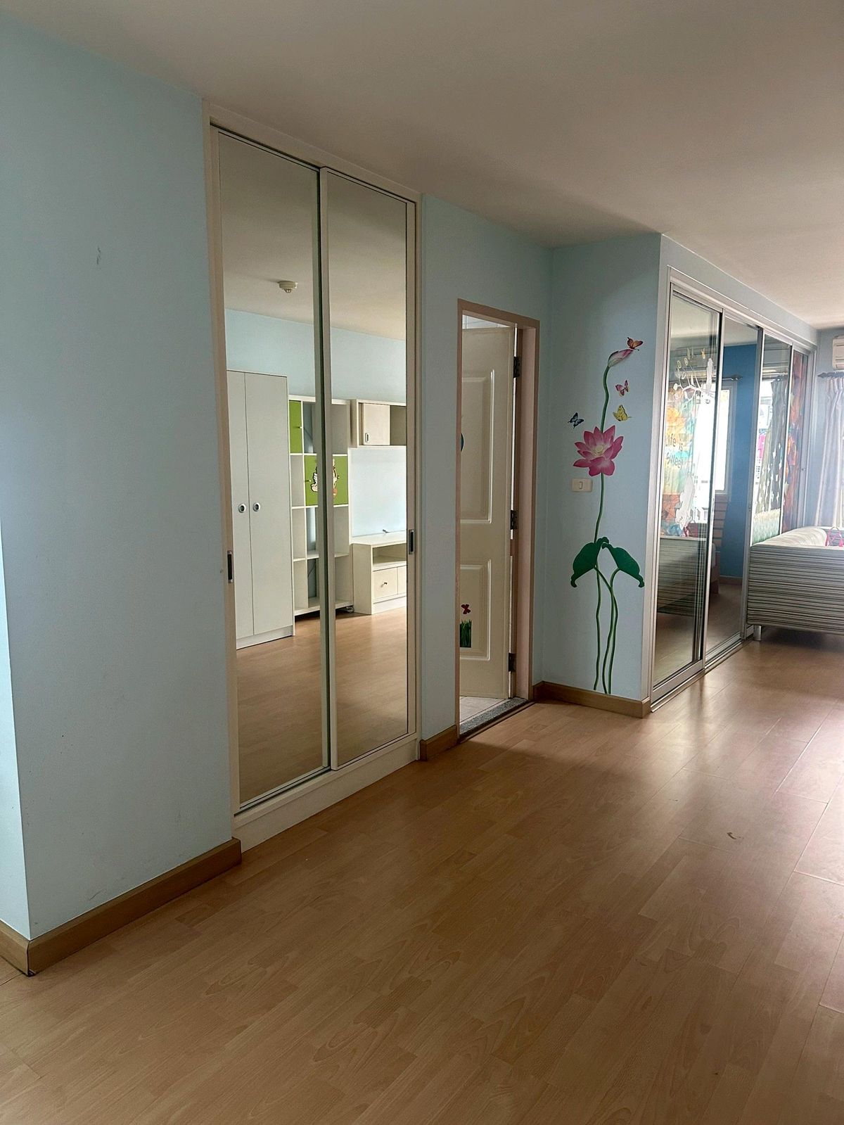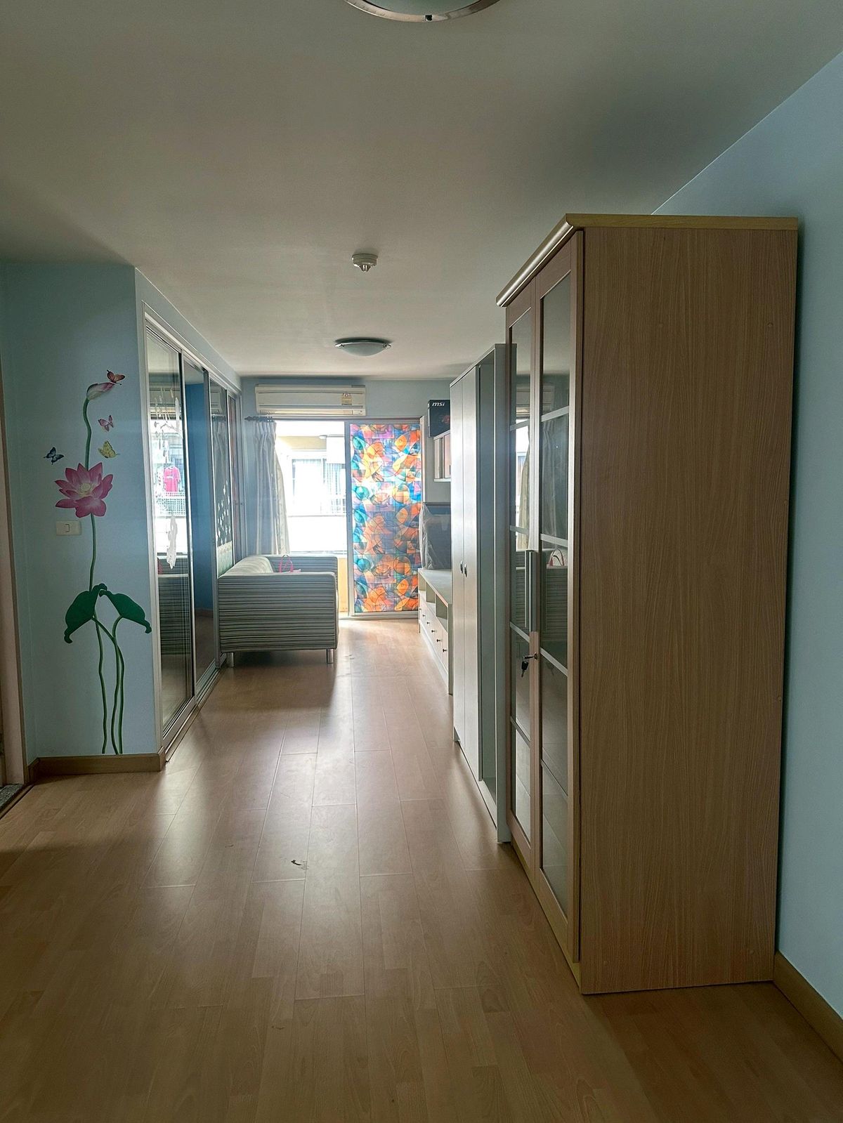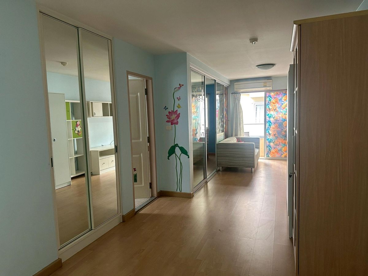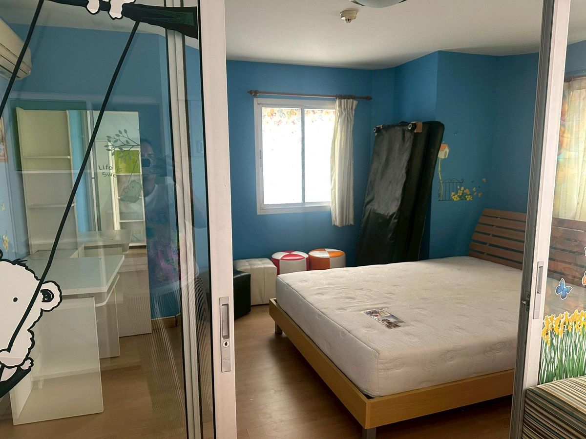 Condo on the main road, next to the BTS (BTS entrance is next to the condo). Room size 45 sq m. Corner room (Owner sells it himself Contact number) The room is built-in, including a table, cabinet, bed, furniture, and all the items in the room. The owner moved to another province since the Covid period.