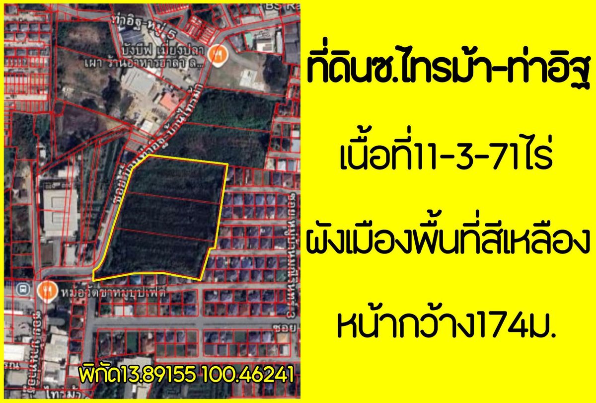 📣The last yolk plot in the heart of the community 11 rai of land "Commercial location - Real estate business" - The land is located in Soi Sai Ma - Tha It - Near Tha It Market🔴 - The land consists of 3 title deeds - Area 11-3-71 rai🔴 - 174m long on the road🔴 - 100m wide - Average filled soil even with the road 2.2m - 2.1 km from Ratchadaphisek Road - 1.9 km from Ratchaphruek Road - Sai Ma Municipality The surrounding area is a large community near the market - village - government center and convenience stores. Complete utilities Convenient transportation Can travel in and out on many routes There are buses passing in front of the land plot Suitable for real estate business - housing projects - companies - shops - warehouses - offices and speculation 💰Price 238 million (average 49,xxx per sq.w.) ☎Interested, contact Contact number id line: 69raden 📌or see additional maps at the link below https://maps.app.goo.gl/fFWY8aKtguMHEYRp6