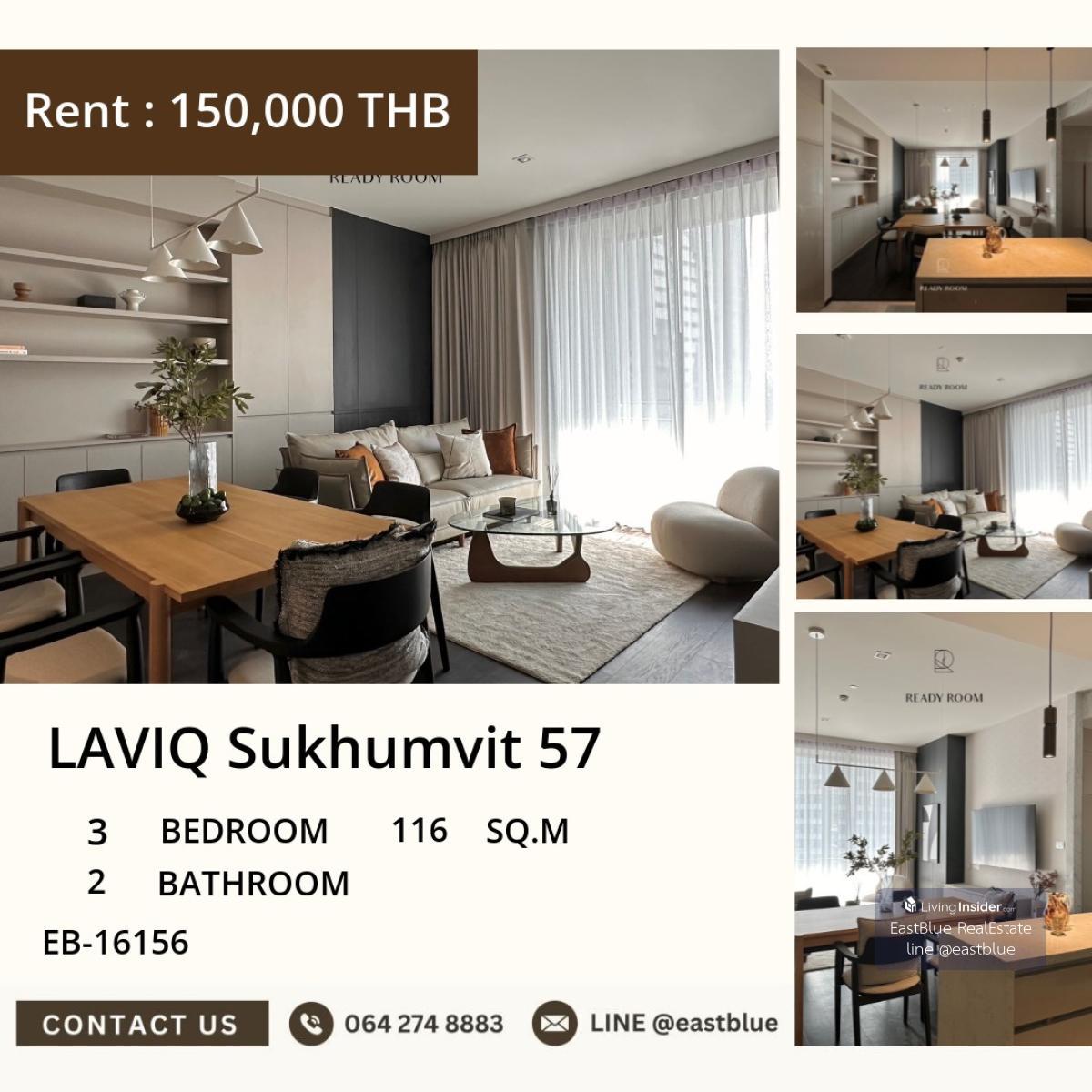 LAVIQ Sukhumvit 57 Luxury condo with 3 bedrooms, 2 bathrooms, size 116 square meters in the heart of Thonglor available for rent at 150,000 Baht per month. Meets every lifestyle need with spacious are