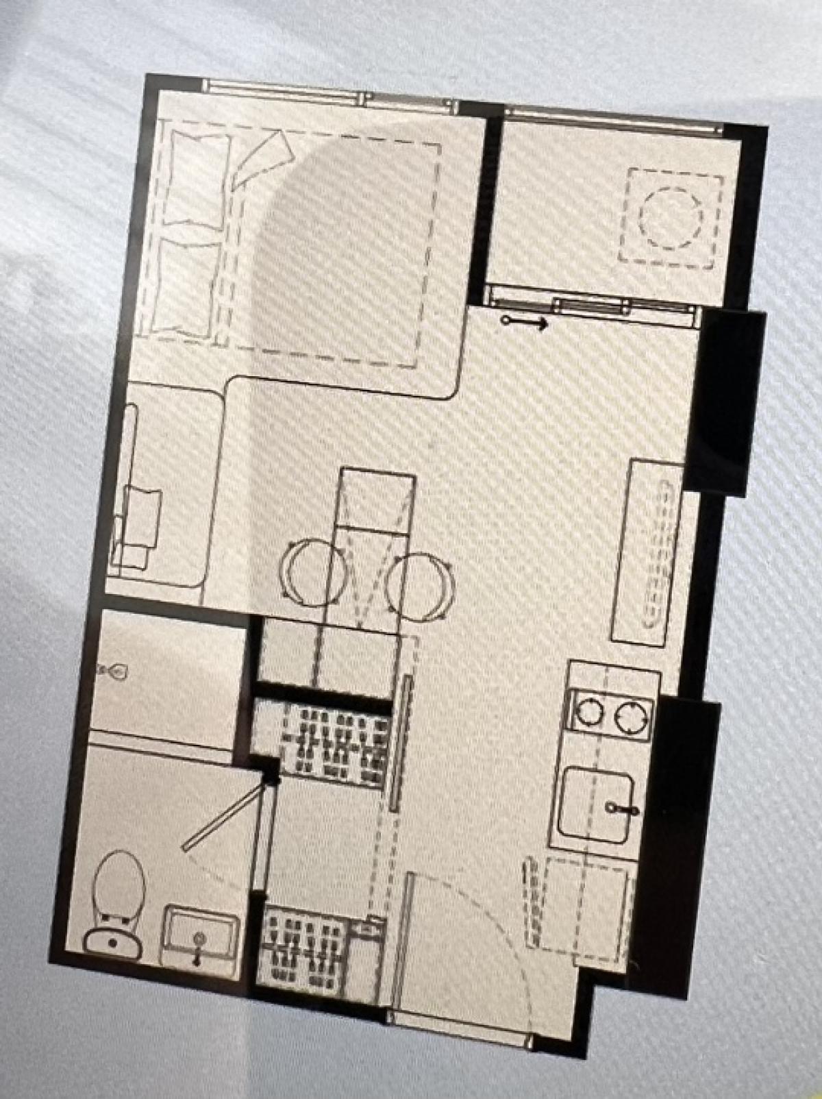 Cobe Kaset-Sripatum Project Selling down payment on Studio room, 15th floor, position 01, size 23.79 sq m. Fully Furnished, fully decorated; Shoe rack, kitchen set, wardrobe, chair + dining/working ta