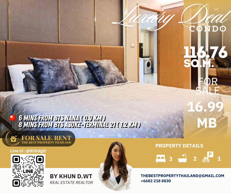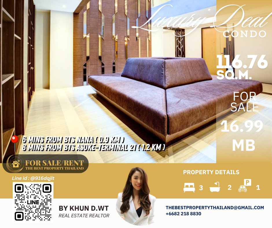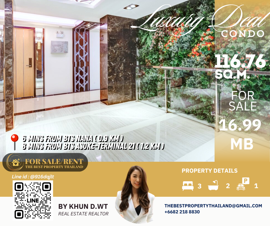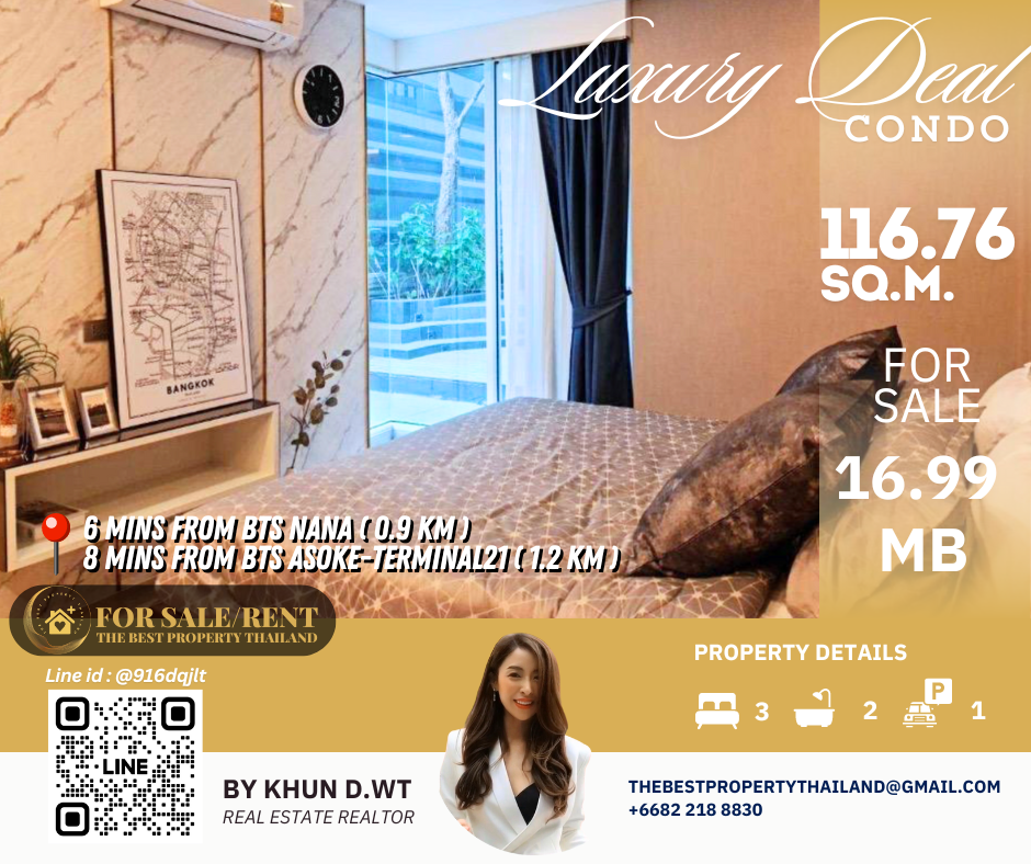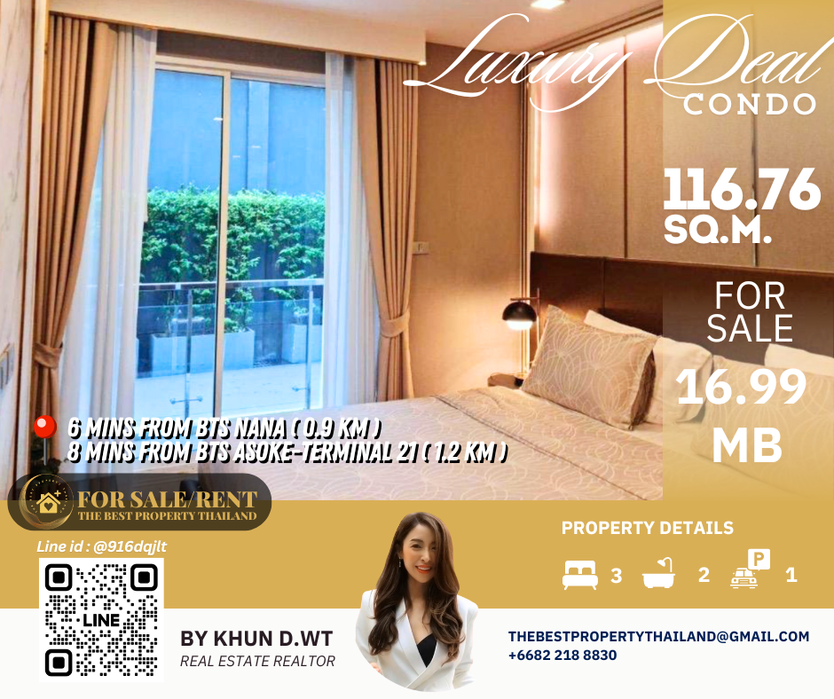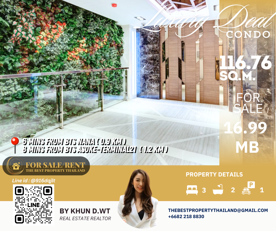 Sell ​​Condo near BTS Asoke 3mins Interlux13 Large 3BED size 116.76 sqm 16.80 MB Condo InterLux Premier Sukumvit 13 Floor 1st Penthouse (8 storey) Area 116.76 sq.m. Type 3Bed2Bath Selling Price = 16,800,000 baht Located in Sukhumvit 13 just fews minutes to BTS Asoke-Nana, Sukhumvit Fully furnished and Electricity appliances TV ,Washing machine, refrigerator ,water heater ,microwave Curtains, Wallpapers , nice kitchen: 2mins walk 250m to NIST International School 4mins walk 290m to Family mart 5mins walk 300m to Sukhumvit soi 11 and a lot of Rooftop Restaurants and Bar, Bang Bang Burgers 6mins walk 300m to Villa Market Sukhumvit 11 12mins 900m to BTS Nana station ,Sukhumvit main road. 15mins 1.2km to BTS Asoke - Terminal 21 Asoke 18mins drive or take BTS (2.4km ) to Phrom Phong EmQuartier,Emporium 20mins drive or take BTS (2.9km) to Central World Booking 200,000 baht The Best Property Thailand Line id : @916dqjlt Line link : https://lin.ee/jI77WMy