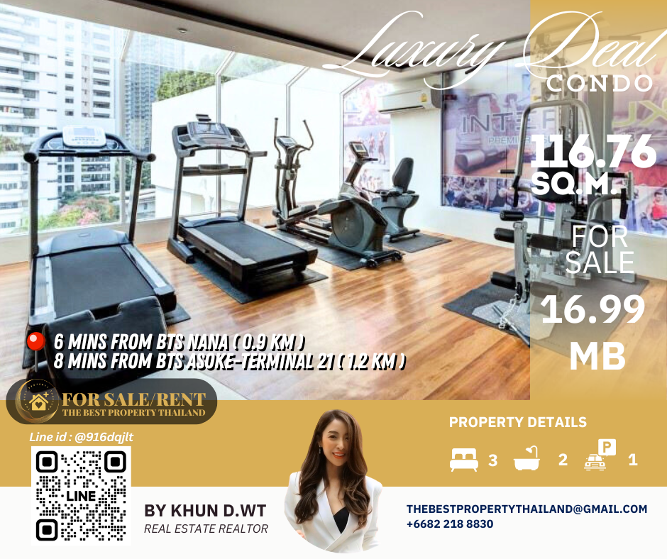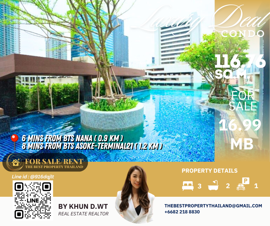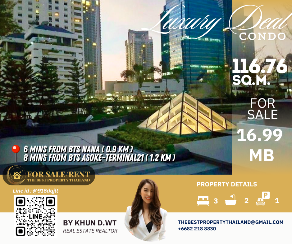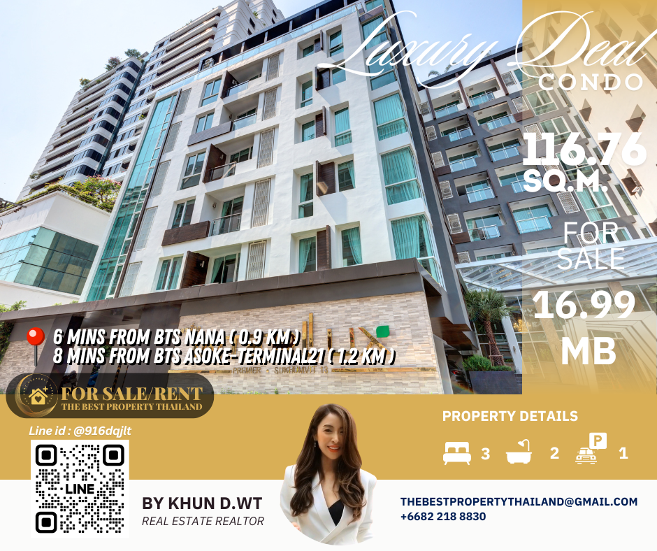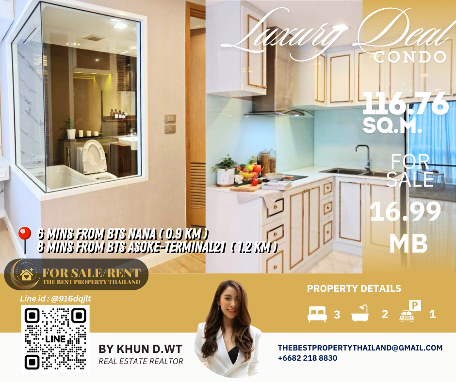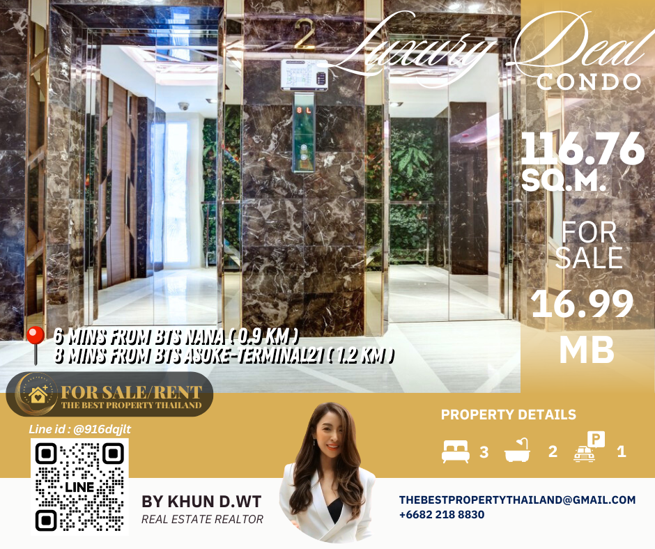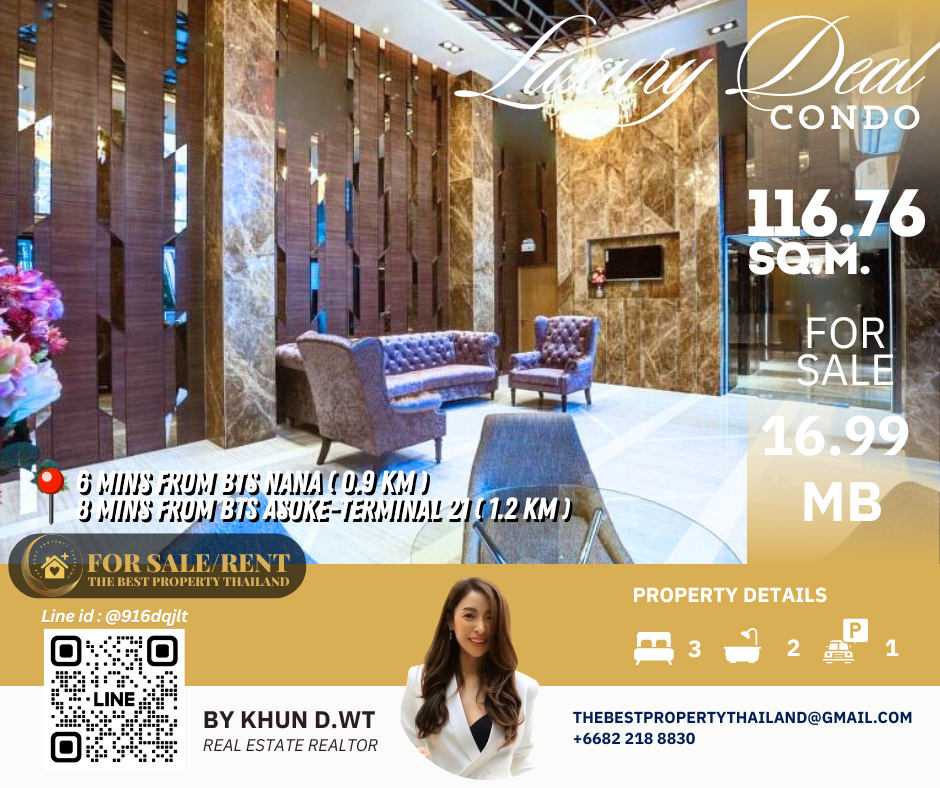 Sell ​​Condo near BTS Asoke 3mins Interlux13 Large 3BED size 116.76 sqm 16.80 MB Condo InterLux Premier Sukumvit 13 Floor 1st Penthouse (8 storey) Area 116.76 sq.m. Type 3Bed2Bath Selling Price = 16,800,000 baht Located in Sukhumvit 13 just fews minutes to BTS Asoke-Nana, Sukhumvit Fully furnished and Electricity appliances TV ,Washing machine, refrigerator ,water heater ,microwave Curtains, Wallpapers , nice kitchen: 2mins walk 250m to NIST International School 4mins walk 290m to Family mart 5mins walk 300m to Sukhumvit soi 11 and a lot of Rooftop Restaurants and Bar, Bang Bang Burgers 6mins walk 300m to Villa Market Sukhumvit 11 12mins 900m to BTS Nana station ,Sukhumvit main road. 15mins 1.2km to BTS Asoke - Terminal 21 Asoke 18mins drive or take BTS (2.4km ) to Phrom Phong EmQuartier,Emporium 20mins drive or take BTS (2.9km) to Central World Booking 200,000 baht The Best Property Thailand Line id : @916dqjlt Line link : https://lin.ee/jI77WMy