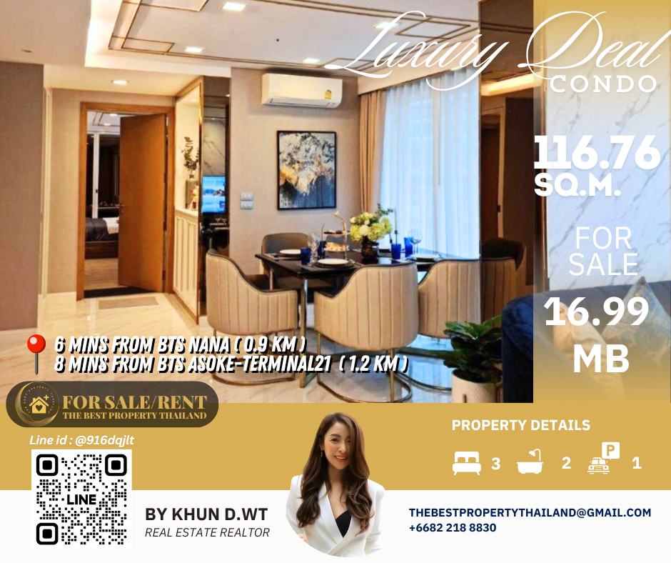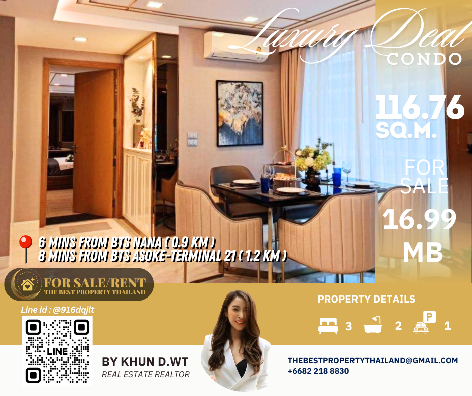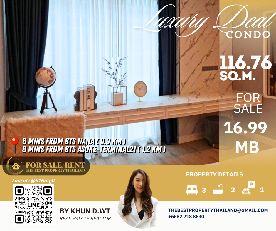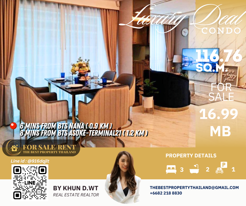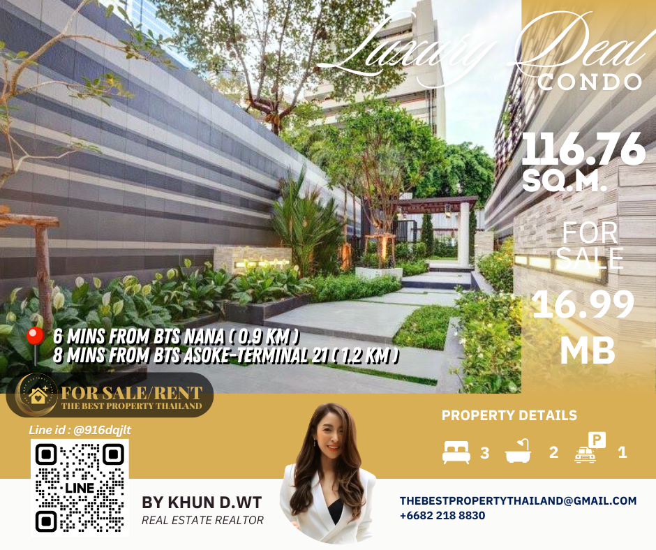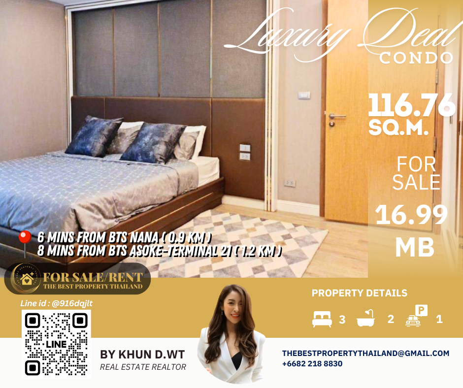 Sell ​​Condo near BTS Asoke 3mins Interlux13 Large 3BED size 116.76 sqm 16.80 MB Condo InterLux Premier Sukumvit 13 Floor 1st Penthouse (8 storey) Area 116.76 sq.m. Type 3Bed2Bath Selling Price = 16,800,000 baht Located in Sukhumvit 13 just fews minutes to BTS Asoke-Nana, Sukhumvit Fully furnished and Electricity appliances TV ,Washing machine, refrigerator ,water heater ,microwave Curtains, Wallpapers , nice kitchen: 2mins walk 250m to NIST International School 4mins walk 290m to Family mart 5mins walk 300m to Sukhumvit soi 11 and a lot of Rooftop Restaurants and Bar, Bang Bang Burgers 6mins walk 300m to Villa Market Sukhumvit 11 12mins 900m to BTS Nana station ,Sukhumvit main road. 15mins 1.2km to BTS Asoke - Terminal 21 Asoke 18mins drive or take BTS (2.4km ) to Phrom Phong EmQuartier,Emporium 20mins drive or take BTS (2.9km) to Central World Booking 200,000 baht The Best Property Thailand Line id : @916dqjlt Line link : https://lin.ee/jI77WMy
