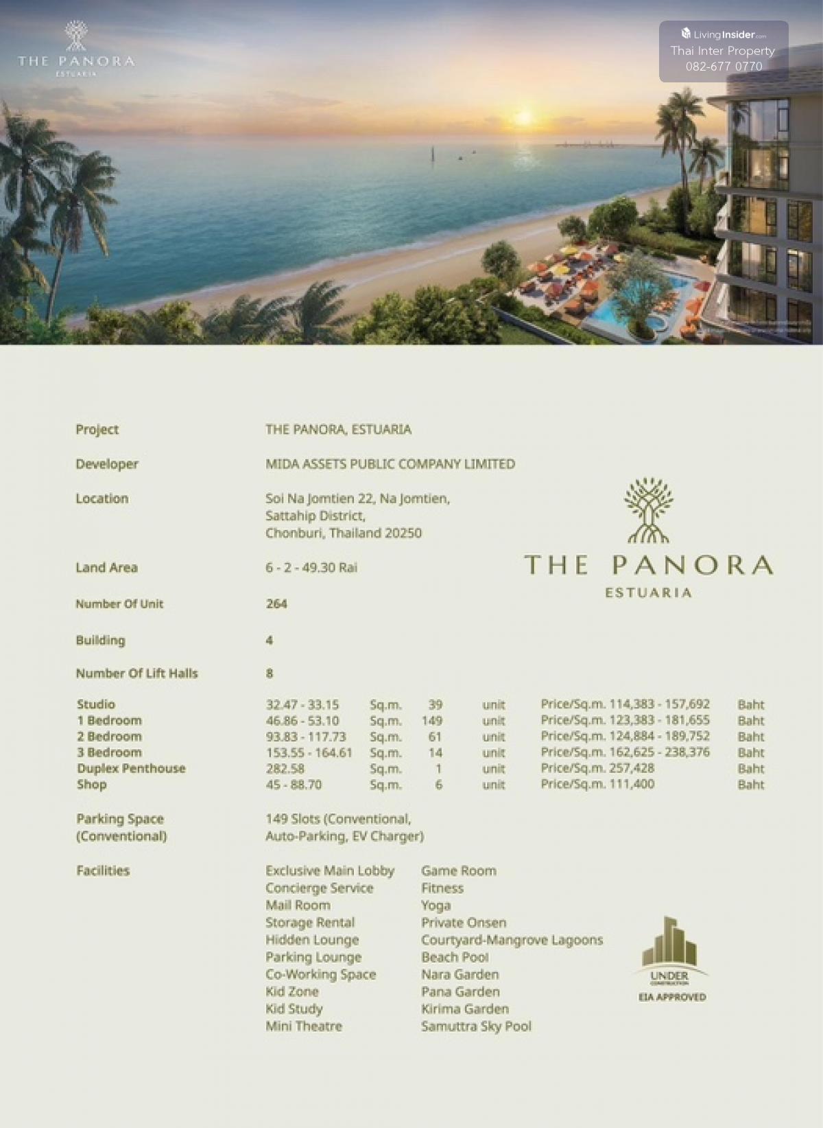 New Project 𝐁𝐞𝐚𝐜𝐡𝐟𝐫𝐨𝐧𝐭 in Pattaya ✨ 𝑷𝒓𝒆-𝑺𝒂𝒍𝒆 The Panora Estuaria Luxury Beachfront Condominium Experience true luxury with superior and complete amenities in an area meticulously designed to meet lifestyle needs. Era life new For your enjoyable living experience in every dimension Starting price 3.7 million baht* with furniture 𝗕𝘂𝗶𝗹𝘁-𝗶𝗻 and electrical appliances* Tel. Contact number Ban Amphur Beach is a beach location with potential. This will be an extremely valuable location that will become a new seaside landmark in the future of Pattaya. It is also convenient to travel near the Ban Amphur motorway (Huai Yai) only 5 minutes and only 10-20 minutes from Pattaya city. It is also an area that the public and private sectors are jointly developing as a new tourist attraction of Pattaya city. In addition, the project location is close to many tourist attractions and famous restaurants . 𝐓𝐡𝐞 𝐏𝐚𝐧𝐨𝐫𝐚 𝐄𝐬𝐭𝐮𝐚𝐫𝐢𝐚 Low rise condo, 8 floors, building level 2, project value over 3,000 million baht* The project is next to the sea🏖️without a road separating it. Inspired by the rich mangrove forest combined with the uniqueness of "Fresh water" and "salt water" At the confluence of sea currents with the sandy beach atmosphere and the breeze that blows onto the coast, it is also an important component of the design under the concept "𝑰𝒏𝒔𝒊𝒅𝒆 𝒐𝒖𝒕 𝒂𝒏𝒅 𝑶𝒖𝒕𝒔𝒊𝒅𝒆 𝒊𝒏" Focusing on bringing out the beauty of nature outside and combining it with the luxurious interior design. 𝒅 𝑹𝒖𝒔𝒕𝒊𝒄 𝑻𝒐𝒖𝒄𝒉 gives a feeling of luxury and splendor, but at the same time it is hidden with tones and materials that are inspired by the surrounding nature. 𝐒𝐭𝐮𝐝𝐢𝐨 Starting size 32 – 33 sq m. 𝟏 𝐁𝐞𝐝 Starting size 47 – 53 sq m. 𝟐 𝐁𝐞𝐝 Starting size 93 – 117 sq m. 𝟑 𝐁𝐞𝐝 starting size 153 – 164 sq m.𝐃𝐮𝐩𝐥𝐞𝐱 𝐏𝐞𝐧𝐭𝐡𝐨𝐮𝐬𝐞 size 282.58 sq m ✨with 𝑭 𝒂𝒄𝒊𝒍𝒊𝒕𝒊𝒆𝒔 Completely meets the needs of every lifestyle Including 𝐌𝐚𝐧𝐠𝐫𝐨𝐯𝐞 𝐋𝐚𝐠𝐨𝐨𝐧𝐬 𝐂𝐨-𝐖𝐨𝐫𝐤𝐢𝐧𝐠 𝐬𝐩𝐚𝐜𝐞, 𝐒𝐭𝐨𝐫𝐚𝐠𝐞 𝐑𝐞𝐧𝐭𝐚𝐥, 𝐊𝐢𝐝 𝐳𝐨𝐧𝐞, 𝐒𝐭𝐮𝐝𝐲 𝐫𝐨𝐨𝐦, 𝐆𝐚𝐦𝐞 𝐫𝐨𝐨𝐦,𝐌𝐢𝐧𝐢 𝐓𝐡𝐞𝐚𝐭𝐫𝐞, 𝐇𝐢𝐝𝐝𝐞𝐧 𝐋𝐨𝐮𝐧𝐠𝐞, 𝐀𝐮𝐭𝐨 𝐏𝐚𝐫𝐤𝐢𝐧𝐠 𝐏𝐚𝐫𝐤𝐢𝐧𝐠 𝐋𝐨𝐮𝐧𝐠𝐞, 𝐁𝐞𝐚𝐜𝐡 𝐂𝐥𝐮𝐛, Baby Pac, Si Pa, Porch O, Si Lom, Fowler EIA APPROVED is under construction, expected to be completed Q4 2026 * Images and simulated atmosphere are used for advertising purposes only* Tel. Contact number #ThePanoraEstuaria #Condopattaya #Seaviewcondominium #CondoPattaya #Condo next to the sea #Luxury Condo Pattaya #CondominiumBeachfront #CondoBeachfront