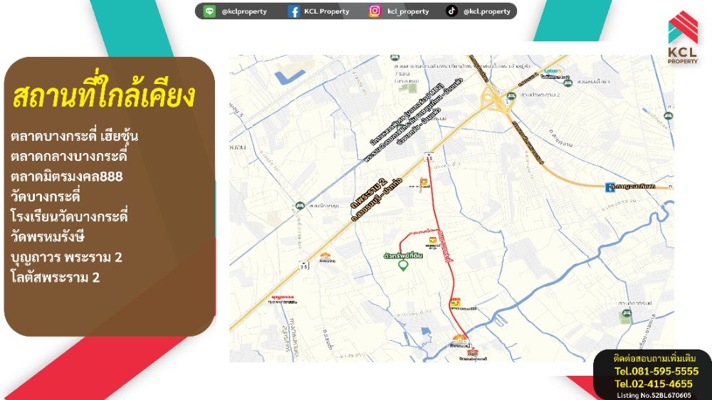 Only 3 minutes from Rama 2 Road, near the Outer Ring Expressway (Kanchanaphisek) already filled in. Big cars can get in and out easily – Currently, Bang Kradi Road has been expanded to a 4-lane road – in the Bang Kradi area. There are markets, shops, and restaurants in the community area. There are many new buildings – Suitable for warehouses, warehouses, offices, some types of factories, etc. – Near Central Rama 2. 2, Lotus Rama 2, Big C Rama 2, Rama 2 Hospital, Nakhon Thon Hospital – Price can be negotiated Price 34,515,000 baht or just 30,000 baht/square wa Ask for more details at Khun Cake Tel. Contact number or Contact number Line: @kclproperty