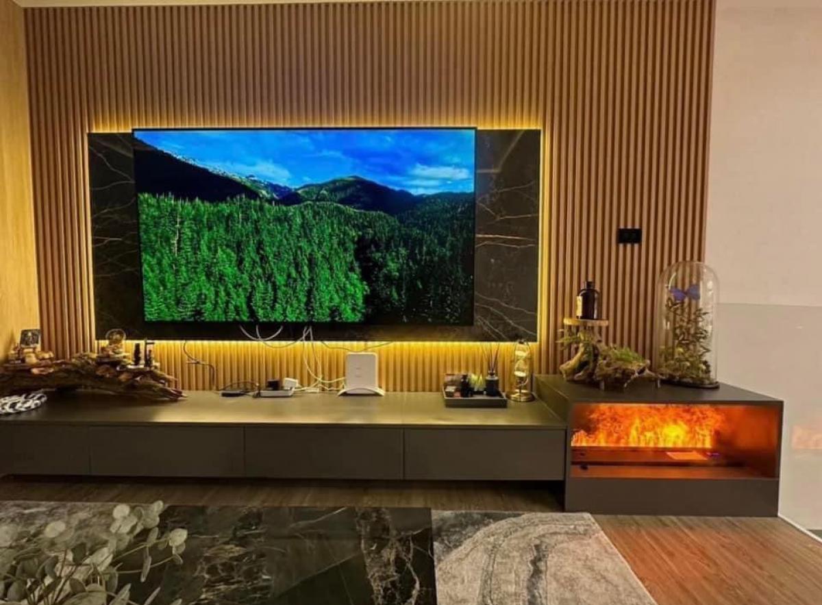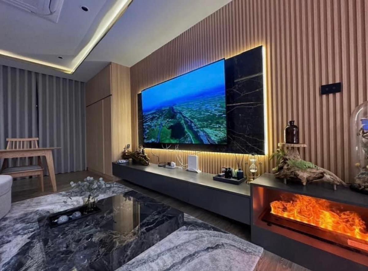 - 1st floor, living room and kitchen with backyard, high ceiling, double volume, kitchen wall, living room, high wall decorated with real marble as a signature.