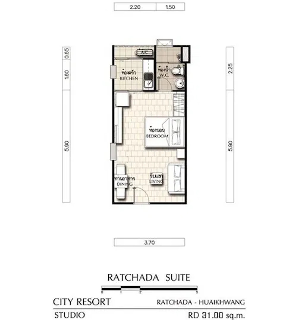 Property code (NC-PP05) Supalai City Resort Ratchada-Huai Khwang 1 bedroom, 1 bathroom Size 45 sq m., Building 1, 6th floor Private and quiet Beautiful room, never rented out Selling for only 2,650,00
