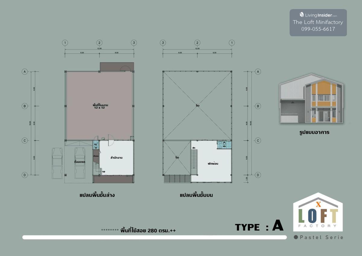 The Loft 5, Mini Factory Project, there are 8 houses, a total of 250 sqm. 2-storey office, 2 bathrooms, specific space, part 144 sqm. (12*12), weighing 2 tons/sqm. The building is 7-8 meters high. , W