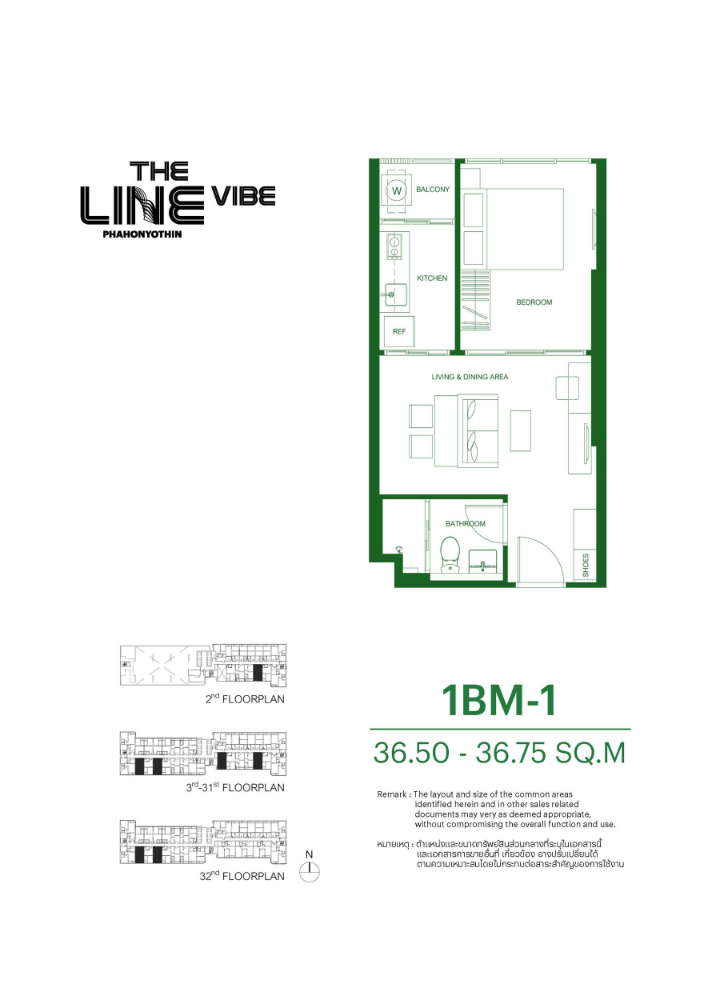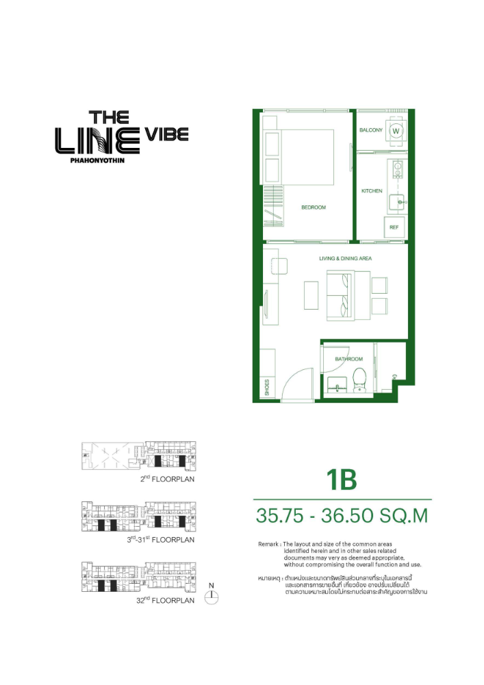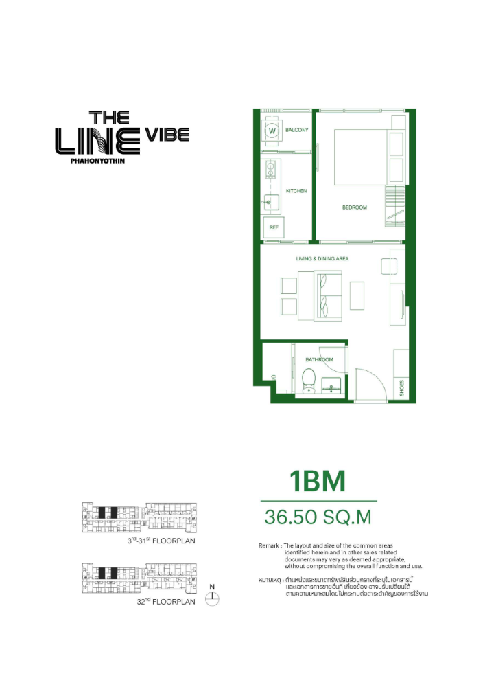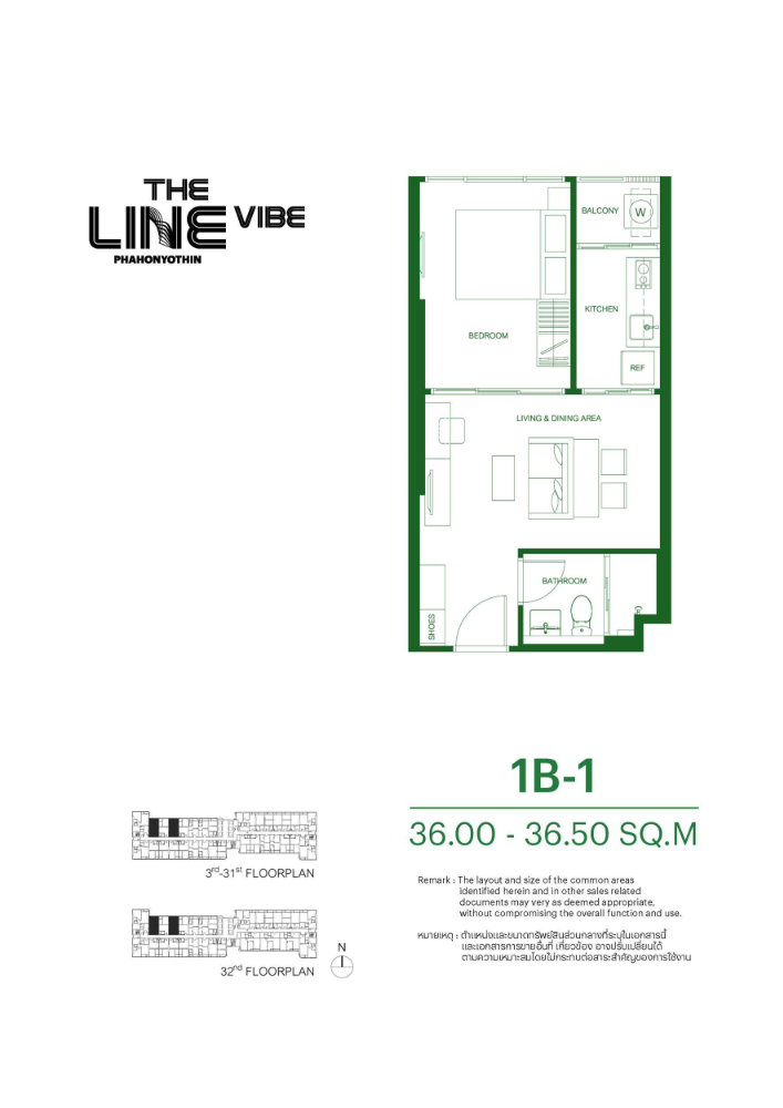 The Line Vibe Skywalk connects BTS Ha Yaek Lat Phrao and MRT Phahon Yothin, near Lotus and Central Lat Phrao Good price room for sale 1Bed 36 - 37 SQ.M Type B kitchen attached to balcony Position: Nor