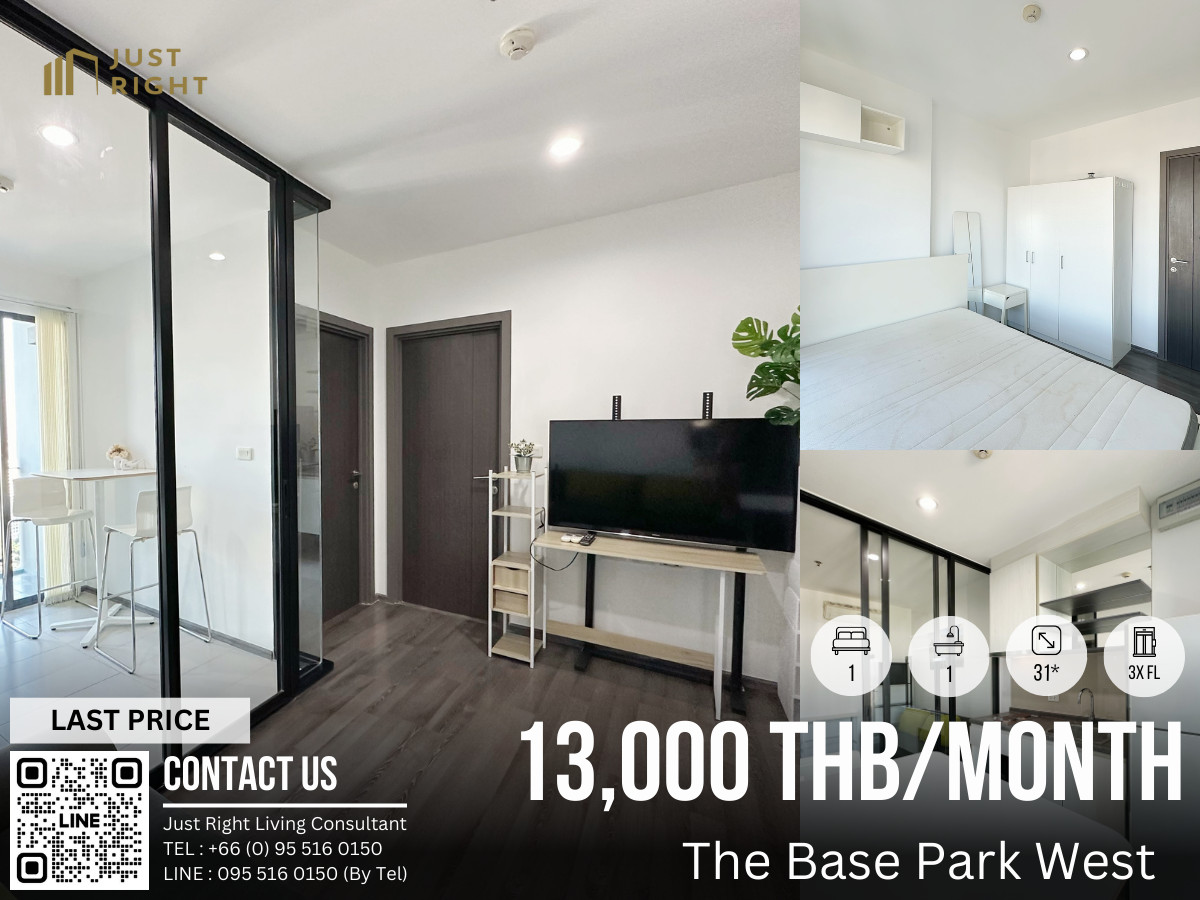 Room available to view and move in 10 NOV 2025 For rent: The Base Park West, 1 bedroom, 1 bathroom, 31* sq m, 3x floor, fully furnished, Special discount price from 15,500, remaining only 13,000 baht/month, 1 year contract. *Chinese Below* -------------------------------------------------- Type : 1 Bedroom 1 bathroom Size : 31* square meter Floor : 3x Furniture and electrical appliances : Fully Furnished Rental price : 13,000 baht per month *1 month in advance, 2 months deposit* *Contract 1 year only* -------------------------------------------------- For viewing appointment or further more information please contact Tel : Contact number Line : Contact number WhatsApp : Contact number WeChat ID : k Contact number Website : www.justrightlc.com ** If you looking for renting or purchasing condo for in a nearby location, Please feel free to contact us for more information or consultation ** ** If you prefer to rent out or sell out your condo, Please feel free to contact us or consultation ** -------------------------------------------------- 户型 : 1 间卧室 1 间浴室 面积:31* 平方米 楼层:3x 家具电器:全包,可以马上入住 租金:每月 13,000 泰铢 入住前付款:1 租+ 2 押金 最短合同期 1 年 -------------------------------------------------- 如果您有兴趣需要进一步的资料,约看房,请您立即联络,我们有中文服务销售 电话: Contact number 线路: Contact number 瓦次艾普 : Contact number 微信号:k Contact number(扫二维码) 网站:www.justrightlc.com ** 如果您在寻找附近公寓出租或购买,请您联系我们获取更多信息或咨询 ** ** 如果您有房源需要出租/出售 请您联系我们获取更多信息或咨询 **
