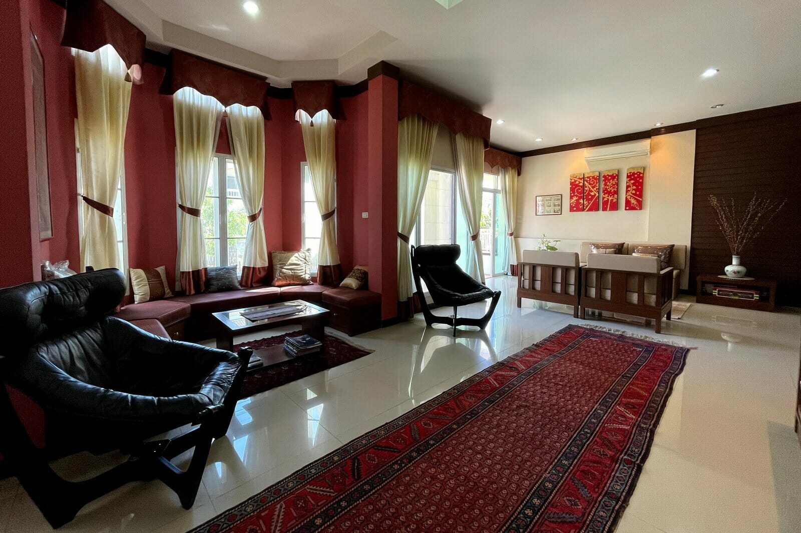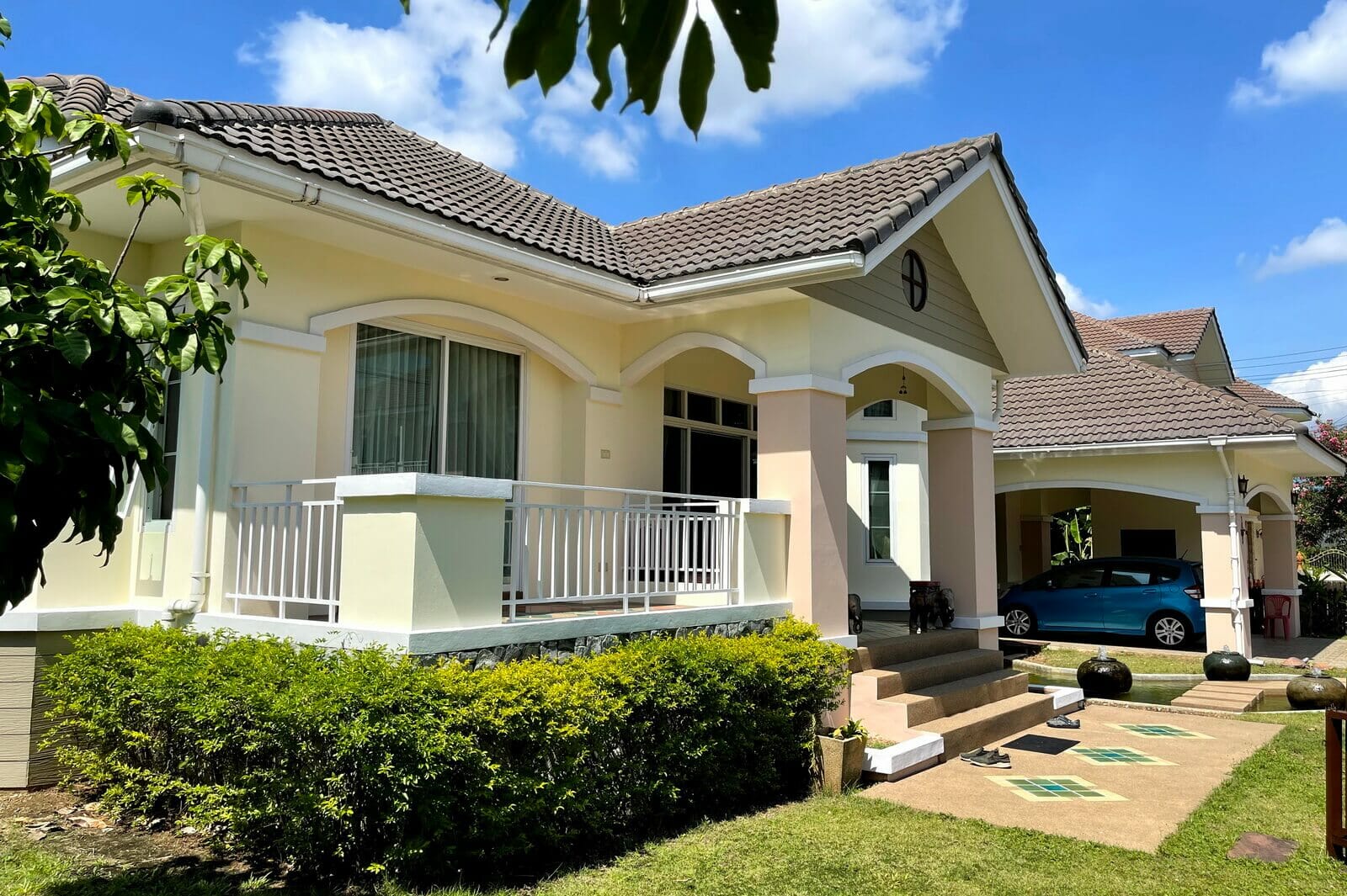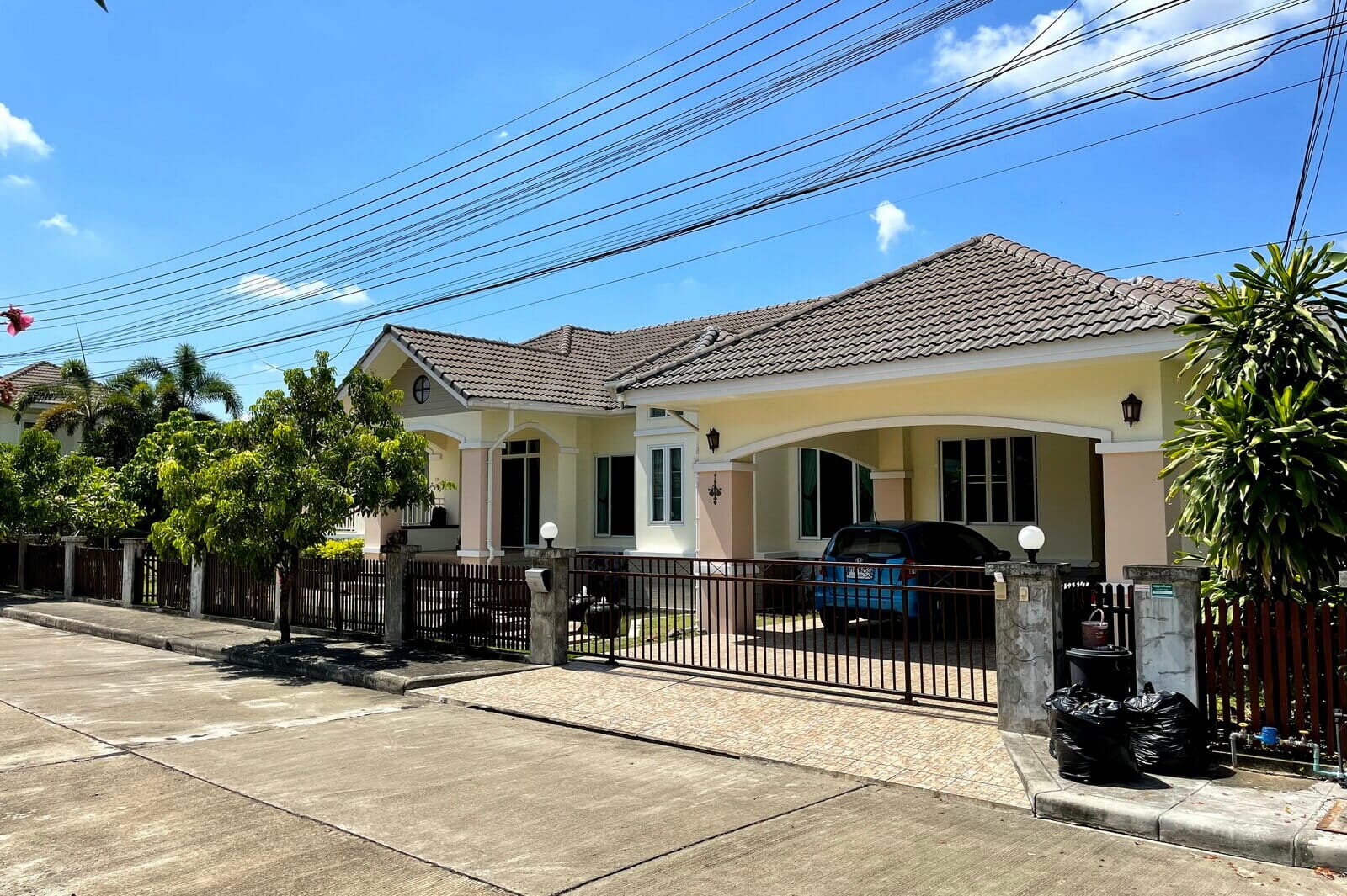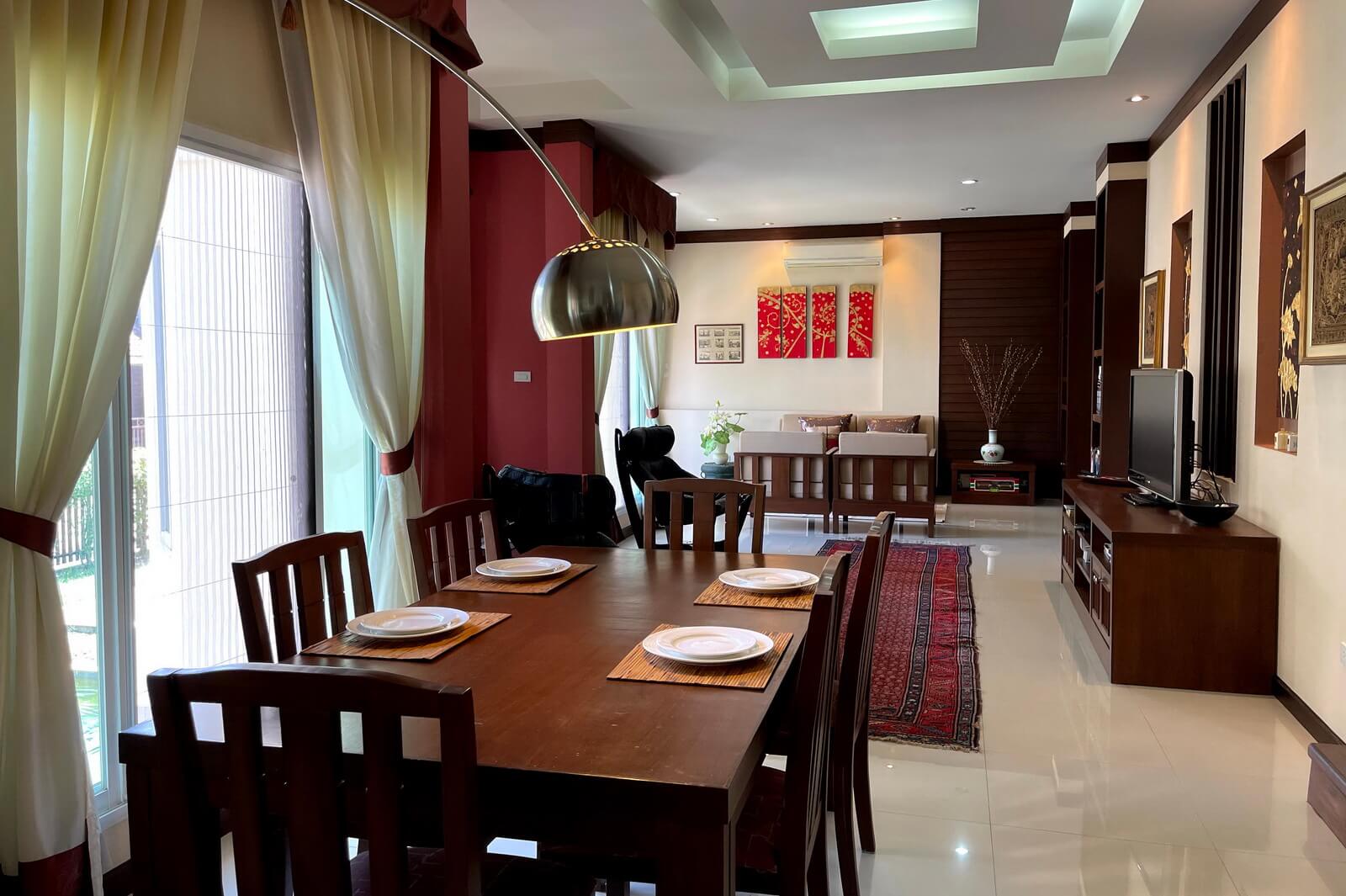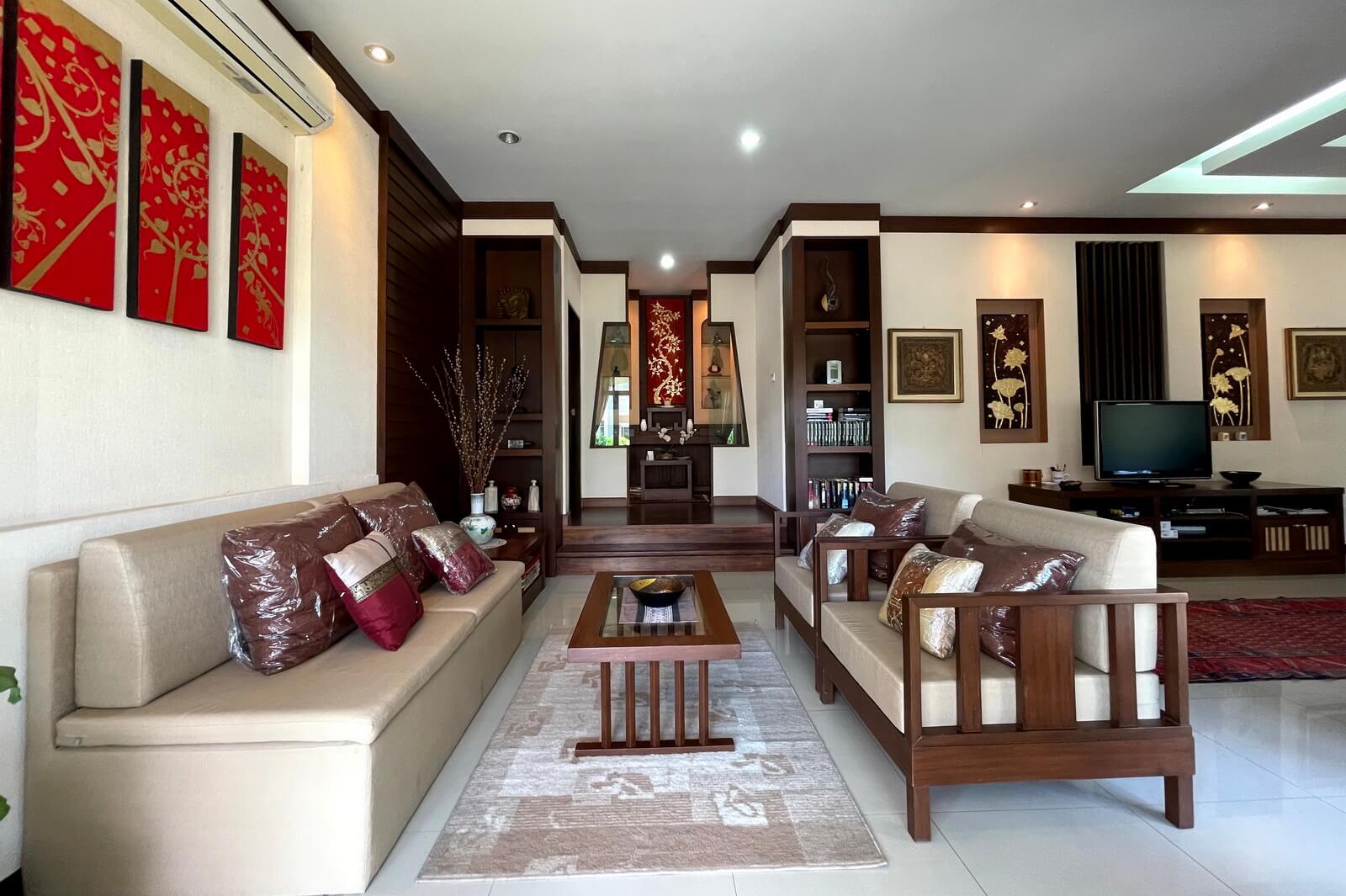 Very well maintained single-story, 3-bedroom home on a large plot in upscale development 10 minutes from Central Festival for sale. The property sits on a large plot, nearly half a Rai, with the main garden on the left side of the house with a sala, mature trees, and a large lawn. There’s also a water feature, small porch, and covered parking for two cars along the front of the house.The main living area has an open plan layout with a western style kitchen at one end next to a dining area, a lounge area with a seating nook after that, and a sitting area at the far end. The Thai kitchen occupies an additional room just off the western kitchen and accessed directly from the carpark.The two guest bedrooms are up a few steps off the lounge area. One has its own en suite bathroom and the other shares the guest bathroom. The large master bedroom is at the far end of the house and has a dressing area, small seating area, private patio, and large en suite bathroom.