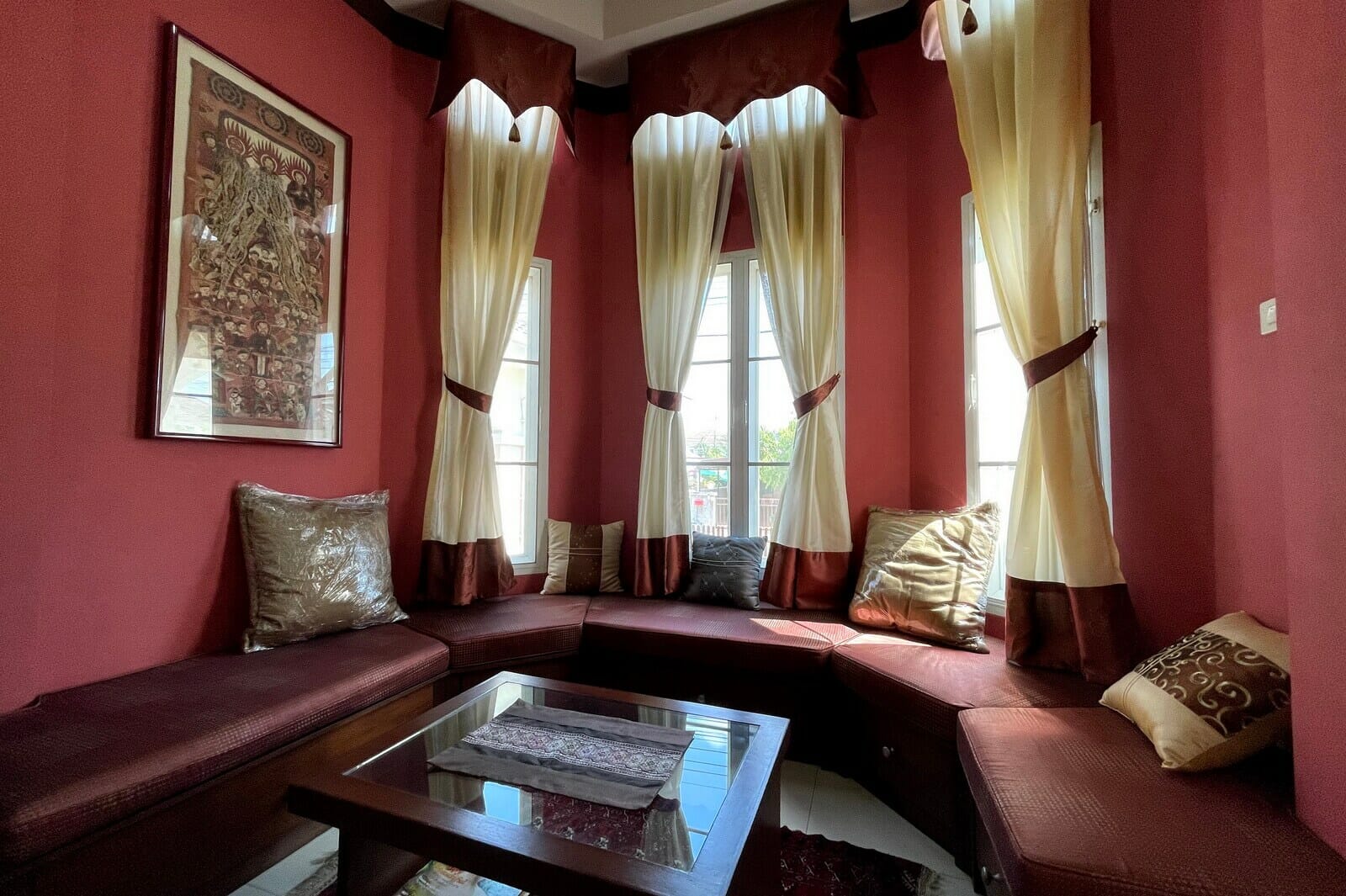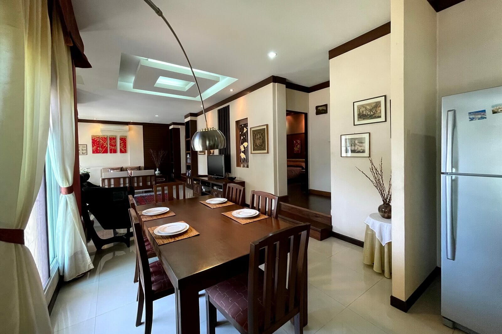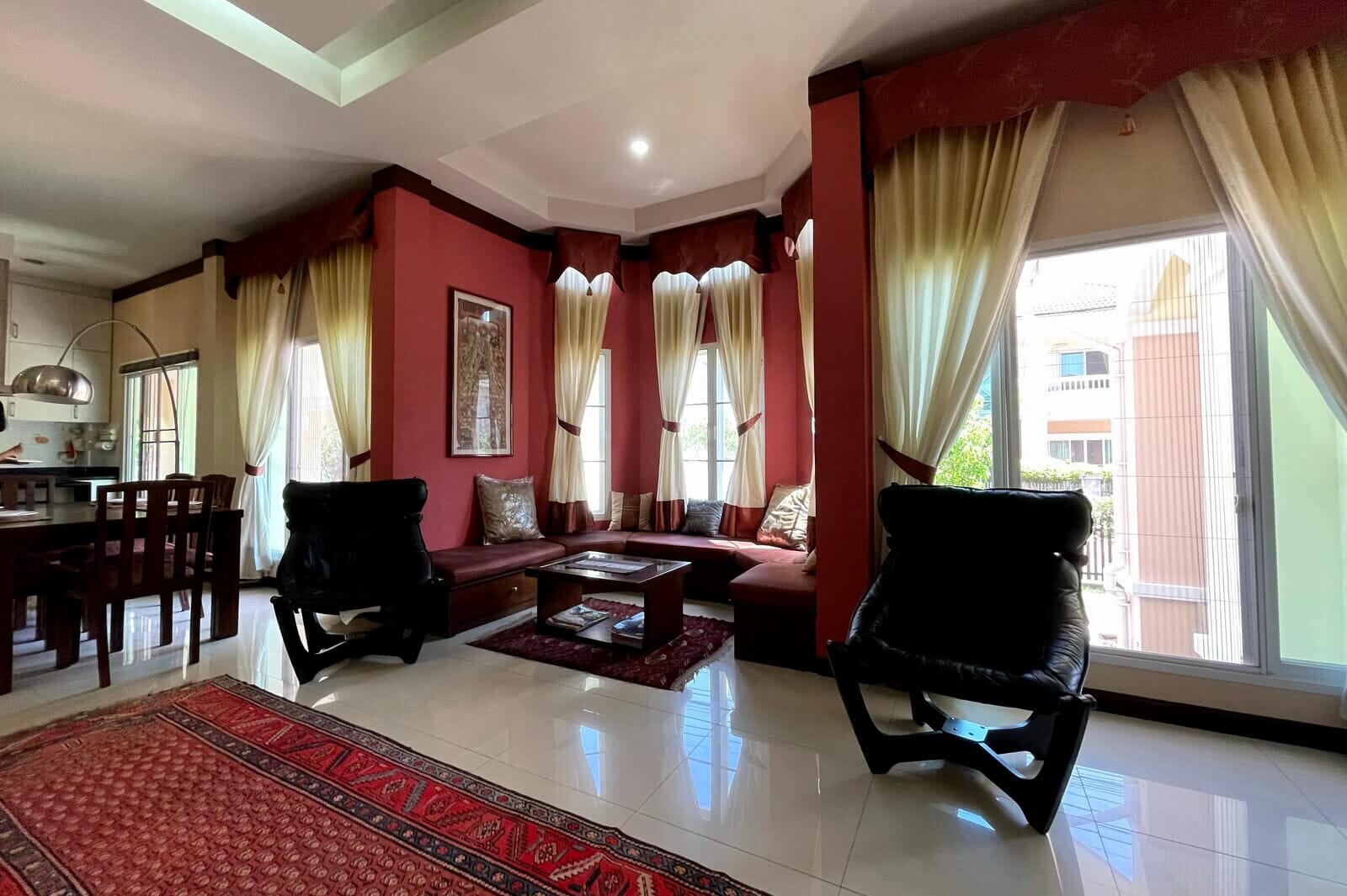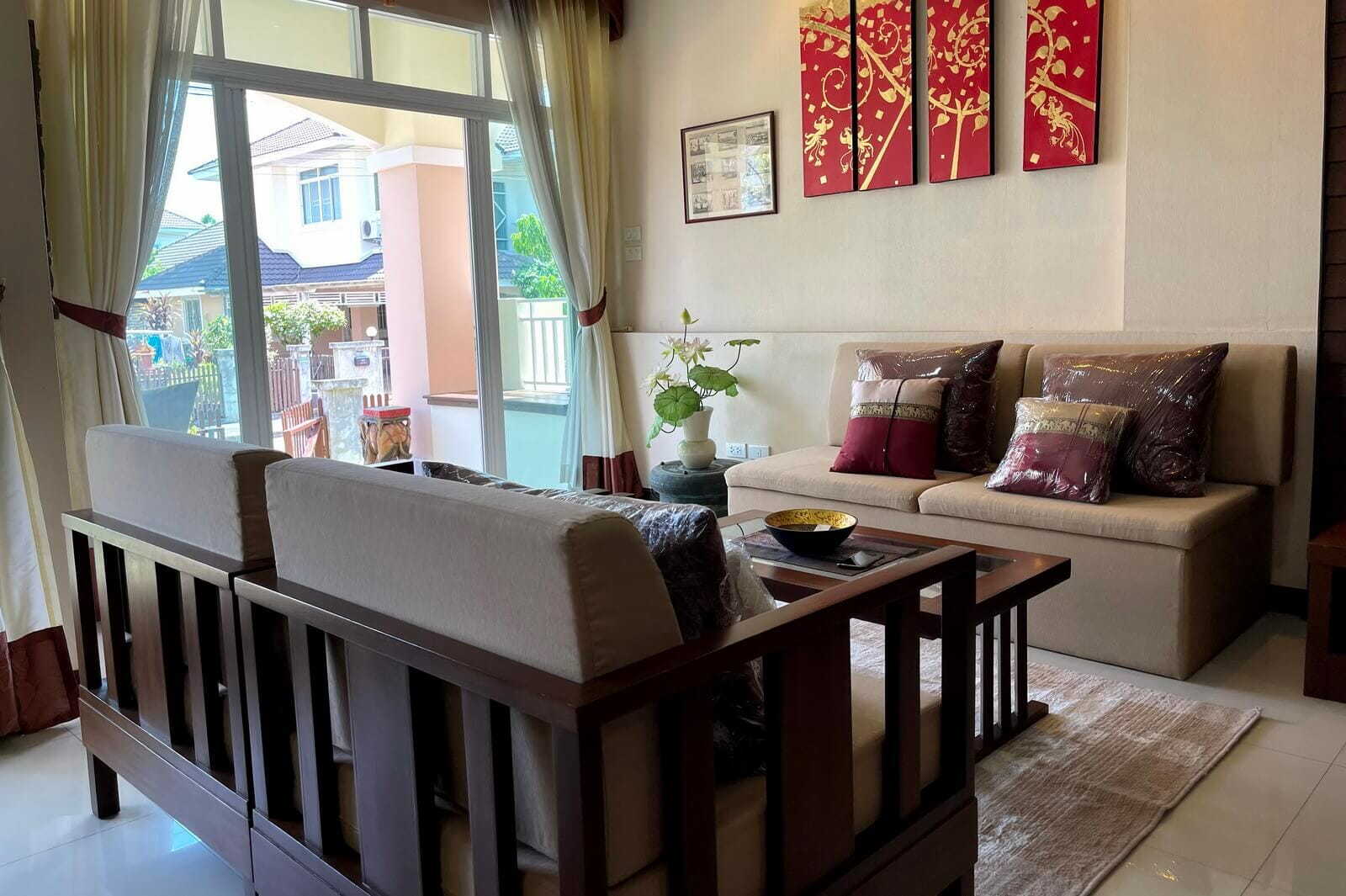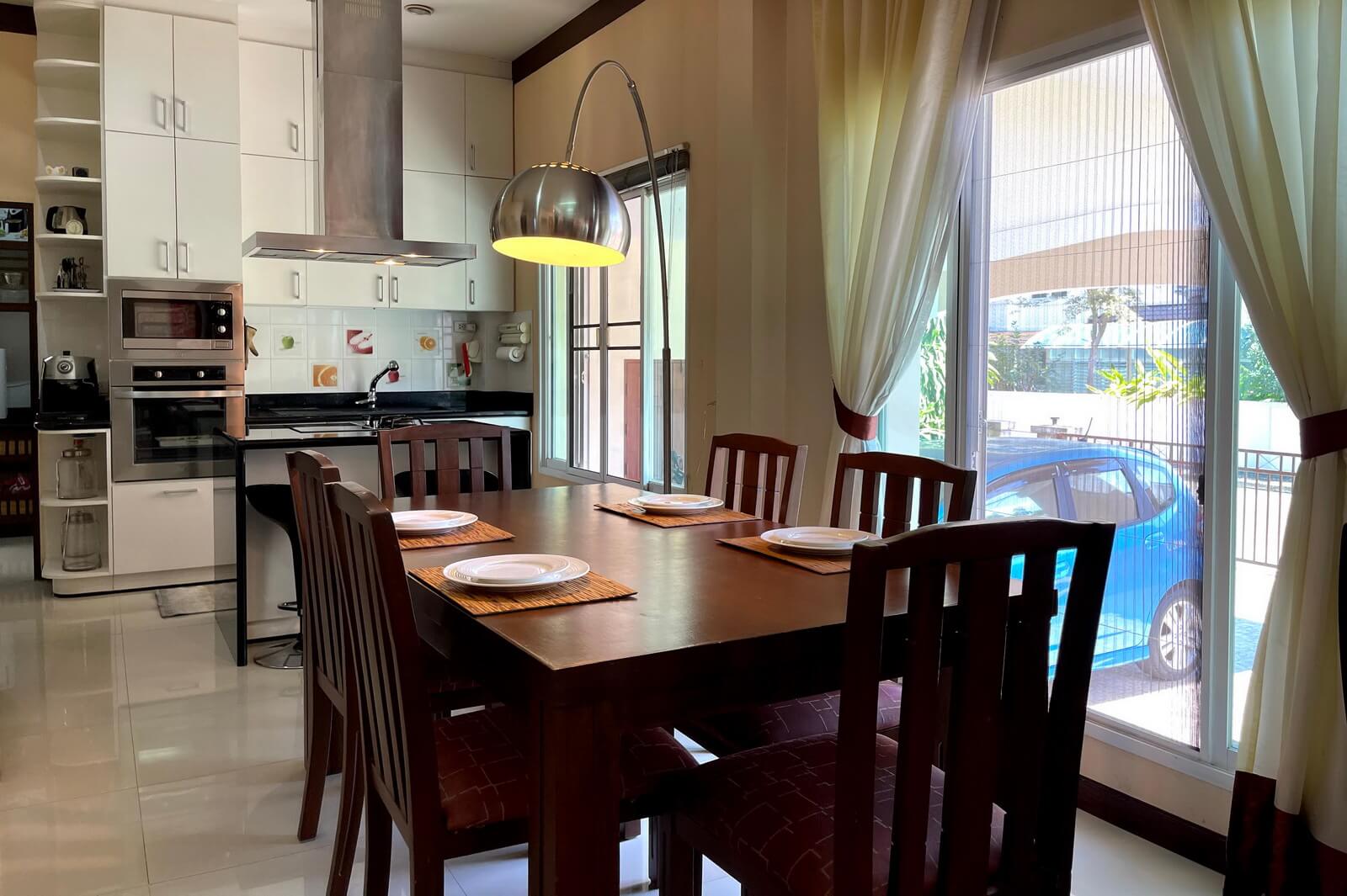 Very well maintained single-story, 3-bedroom home on a large plot in upscale development 10 minutes from Central Festival for sale. The property sits on a large plot, nearly half a Rai, with the main garden on the left side of the house with a sala, mature trees, and a large lawn. There’s also a water feature, small porch, and covered parking for two cars along the front of the house.The main living area has an open plan layout with a western style kitchen at one end next to a dining area, a lounge area with a seating nook after that, and a sitting area at the far end. The Thai kitchen occupies an additional room just off the western kitchen and accessed directly from the carpark.The two guest bedrooms are up a few steps off the lounge area. One has its own en suite bathroom and the other shares the guest bathroom. The large master bedroom is at the far end of the house and has a dressing area, small seating area, private patio, and large en suite bathroom.