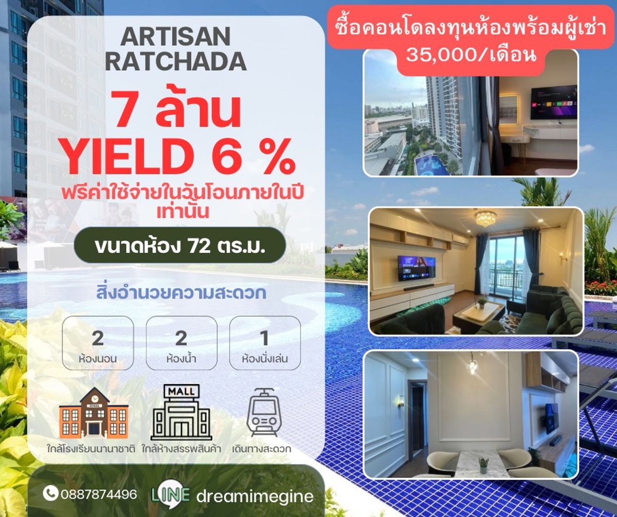 Condo Artisan Ratchada Sold with tenant, rent 33,000 baht per month✅ 2 bedrooms, 2 bathrooms Price only 7 million baht🚨 Size 72 sq m, 14th floor - 2 bedrooms - 2 Bathrooms Southeast direction, swimming pool view 🌇 ❗️Special things for the project that you may not know❗️ ⭐️For those who have problems with parking 🚗 We have -->Special parking space comparable to leading department stores ✅ ⭐️If youre hard to find food and dont know what to eat or dont know where to go on a holiday We have -->Shops, restaurants, food and LIFESTYLE all in one place ✅ ⭐️If you have problems walking The project has two entrances and exits to choose from and use according to your needs. ✅ ———————————————————— Contact: Agent 👤 Tel: Contact number {Dream} Line: dreamimegine or search by number✍🏼 Accept Co-Agent 🤝