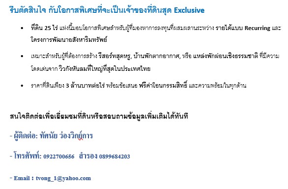 Property Basic Information • Location: Tambon Huai Bong, Amphoe Dan Khun Thot, Nakhon Ratchasima Province • Land Size: 25 rai, divided into 20 rai, owner keeps 5 rai • Selling Price: 3 million baht per rai (free transfer fee) • License: Has a legal sand pit business license ________________________________________ Land coordinates • 15.1528981, 101.4857579 • Located on the main road of Huai Bong • From Bangkok, it takes about 3 and a half hours via Saraburi - Pak Chong - Huai Bong route (travel time will be reduced when the Korat Motorway is fully operational) ________________________________________ Land Highlights 1. Outstanding location o The land is on the main public road, wide frontage o Surrounded by wind turbines, which are the largest wind power generation sources in Thailand. Unique and unusual scenery that cannot be found anywhere else o Shady atmosphere, cool air, suitable for developing into a resort or other leisure projects 2. Business potential o The sand pit has natural self-replenishing sand Generate a lifetime recurring income 3. Amenities o Electricity, groundwater, internet ready ________________________________________ Travel information • Distance approximately 230 kilometers, travel time only 3 and a half hours from Bangkok (or less than 3 hours when the motorway is fully open) ________________________________________ Investment opportunities 1. Develop into a resort or special project o Create an exclusive resort with a selling point from the view of wind turbines and surrounding nature 2. Income from the sand pit business o With a sand pit business license that provides continuous income in the long term 3. Increase the value of the property o The trend of land prices in the area is continuously increasing ________________________________________ Why is this plot of land worth your consideration? 1. Outstanding location o Land on the main road: Easy access via main roads connecting to communities and important routes o Special view Unique, not found anywhere else: The land is surrounded by wind turbines, which is a distinct highlight and helps create a unique atmosphere 2. Diverse investment opportunities o Recurring Income: With a legal sand pit license, you can operate a sand pit business with naturally replenished sand. Generate continuous income throughout life o Special project development: Potential to develop the land into an exclusive resort or a natural project that uses the highlight of the beautiful atmosphere and scenery 3. Availability of facilities o Complete infrastructure: Electricity, groundwater and internet are available o Near the market and shopping area: Near the shopping area at Huai Bong intersection, 2 kilometers away 4. Potential to add value o Location near Bangkok: Convenient transportation, only 230 kilometers or 3 hours from Bangkok and will be more convenient when the motorway is fully operational o Land price trend continues to increase: From the demand for land with natural highlights, the difference in scenery, the development of the area that is starting to develop resorts and cafes with unique characteristics more and more, being promoted as a tourist attraction that is gaining attention, and the cool atmosphere in this area 5. Special offer o Selling price only 3 million baht per rai: With free expenses on the day of transfer of ownership o Buy with a sand pit business license that can generate income immediately 6. Unique selling point o Exclusive view and natural atmosphere that creates a difference, helping to attract tourists or future residents o Suitable for investors who want an area that can generate income and added value in the long term or even use some area to build a vacation home not far from Bangkok Easy to travel Make a decision quickly with a special opportunity to own an exclusive land • This 25-rai land offers a special opportunity for those looking for an investment that combines recurring income and real estate development projects • Suitable for those who want to build a luxury resort, vacation home, or a natural relaxation area that stands out from the view of the largest wind turbine in Thailand • Land price only 3 million baht per rai with a free transfer fee offer and readiness in every aspect Interested, please contact to visit the land or ask for more information immediately - Contact: Tasanai Wongwikan - Tel: Contact number Reserve Contact number - Email: Contact email