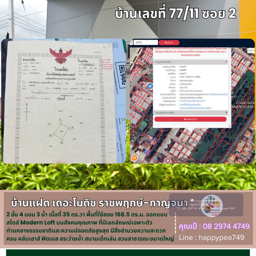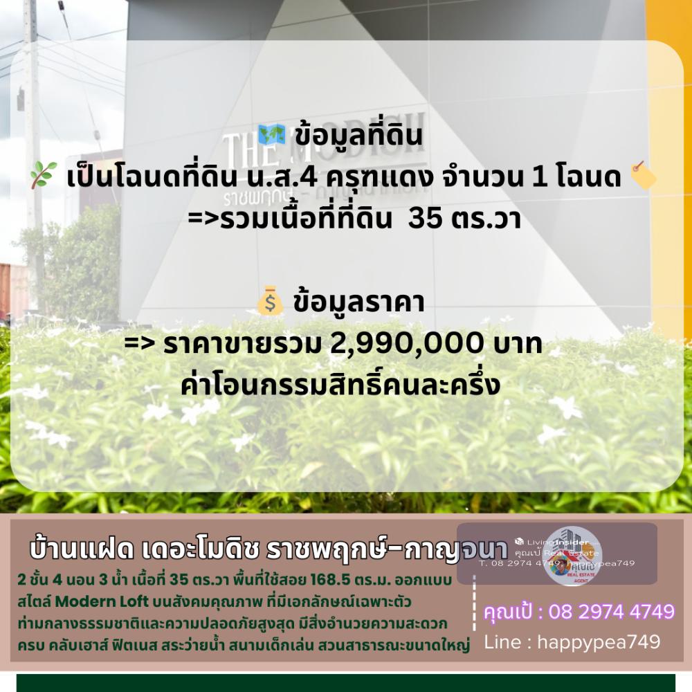 💰 Twin house in The Modish Ratchaphruek-Kanchanaphisek project, this house has an area of 35 sq.w., usable area of 168.5 sq.m. Designed in a modern loft style in a quality society that has its own identity, surrounded by nature and maximum safety The project has complete facilities, clubhouse, fitness, swimming pool, playground, large public park of 1.5 rai 💰 This house is a 2-storey twin house, 4 bedrooms, 3 bathrooms, independent walls, not adjacent to each other, the front of the house is 10 meters wide, with an extension of the parking lot in front of the house, can park 3 cars and a Thai kitchen behind the house There is an area next to the house that can be used as a garden, a place to sit and relax. In the house there is a water tank + water pump. The house is in new condition, ready to move in and the house faces southwest 🚧 Location House number 77/11, Soi 2, Ratchaphruek Road 77, Kanchanaphisek Road, Khlong Phra Udom Subdistrict, Lat Lum Kaeo District, Pathum Thani 12140 📍Pin navigation Project coordinates https://maps.app.goo.gl/Phi9aCHYYFqLkryP7 📍 Nearby important places Kanchanaphisek Road 0.9 km Purple Line Khlong Bang Phai Station 10 km Sirat Expressway - Outer Ring Road 27 km Sarasas Witaed Bangbuathong School 0.8 km Sarasas Witaed Ratchaphruek School 14 km Central Westgate 12 km IKEA Bang Yai 12 km HomePro Ratchaphruek 12 km Index Living Mall 12 km Pakkret Hospital 10.9 km Kasemrad Hospital Ratchaphruek 11.7 km 🗺️ Land information 🌿 It is a title deed, NS.4, Red Garuda, 1 title deed. 🏷️ =>Total land area 35 sq m 💰 Price information => Total selling price 2,990,000 baht, transfer fee half each Youtube https://youtu.be/xIEEpd9vC5M?si=75Dvrs4EC4MKJUR_ http://sirimantra.co.th/project_detail.php?project_id=3 🌟 A good investment opportunity that you should not miss! 🔑 🌟 There are both Bank and Non-Bank financial institutions to provide a full range of services 📢 Ask for more details, talk comfortably, friendly, contact 🤵Khun Pae Chaiphon Accept deposits, buy-sell beautiful land for investment, business, agriculture, industry and residence 📞Tel. Contact number 📟 Line : happypea749 Click https://line.me/ti/p/WbmkWfUuvu 🎉See other land plots https://www.livinginsider.com/public_profile/1/eDbjy.html #TheModich #ModichRatchapruek #TwinhouseRatchapruek #SecondhandhouseRatchapruek #SecondhandhouseKanchanaphisek #ModichRatchapruekKanchanaphisekHouse #ModichTwinhouse #ModichRatchapruek