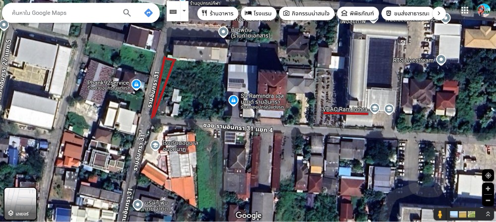 Land for sale, 43 square wah, in Soi Ram Intra 31, enter the alley for about 500 meters, on the right corner of the alley, shortcut to Sukhaphiban 5, Watcharapol, good location, trapezoidal land, base