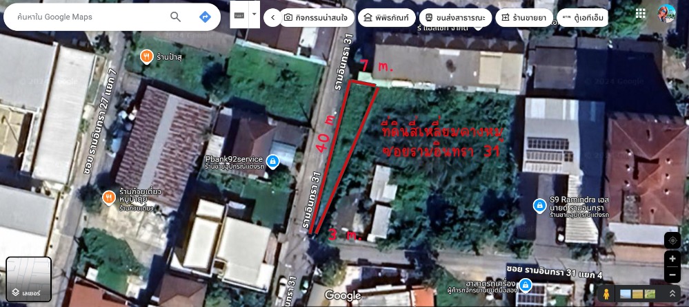 Land for sale, 43 square wah, in Soi Ram Intra 31, enter the alley for about 500 meters, on the right corner of the alley, shortcut to Sukhaphiban 5, Watcharapol, good location, trapezoidal land, base 7 meters, length 40 meters, other side base is 3 meters wide (80,000 baht/square wah). Interested, please inquire for more information.