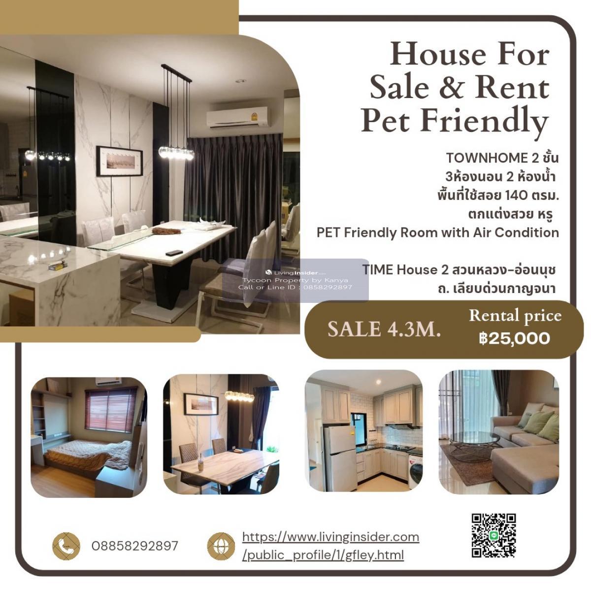 Time Home 2 Suan Luang-On Nut Project Townhome for rent and sale • Usable area 140 sq.m. • 3 bedrooms, 2 bathrooms, 2 parking spaces • Built-in throughout the house, complete equipment, ready to move in 🔥 Make a room for raising dogs and cats, the back has air conditioning ready for dogs and cats. ✅ Sofa ✅ Dining table ✅ List of electrical appliances TV, washing machine, refrigerator, water heater With 5 air conditioners, range hood, gas stove Nearby Suvarnabhumi Airport and Airport Link * Bangna area: Along Bangna-Trad Road, starting from Bangna Intersection, Market Village * Srinakarin area: Seacon Square Department Store And Train Market, Paradise Park, HaHa Mall and Aiem Sombat Market 🔥Sale with tenan vwhich Rental fee 25,000 baht/month ✅️ Selling price 4,300,000 baht half transfer Interested, contact Tycoon Property by Kanya Call/Line: Contact number Whatsapp: Contact number