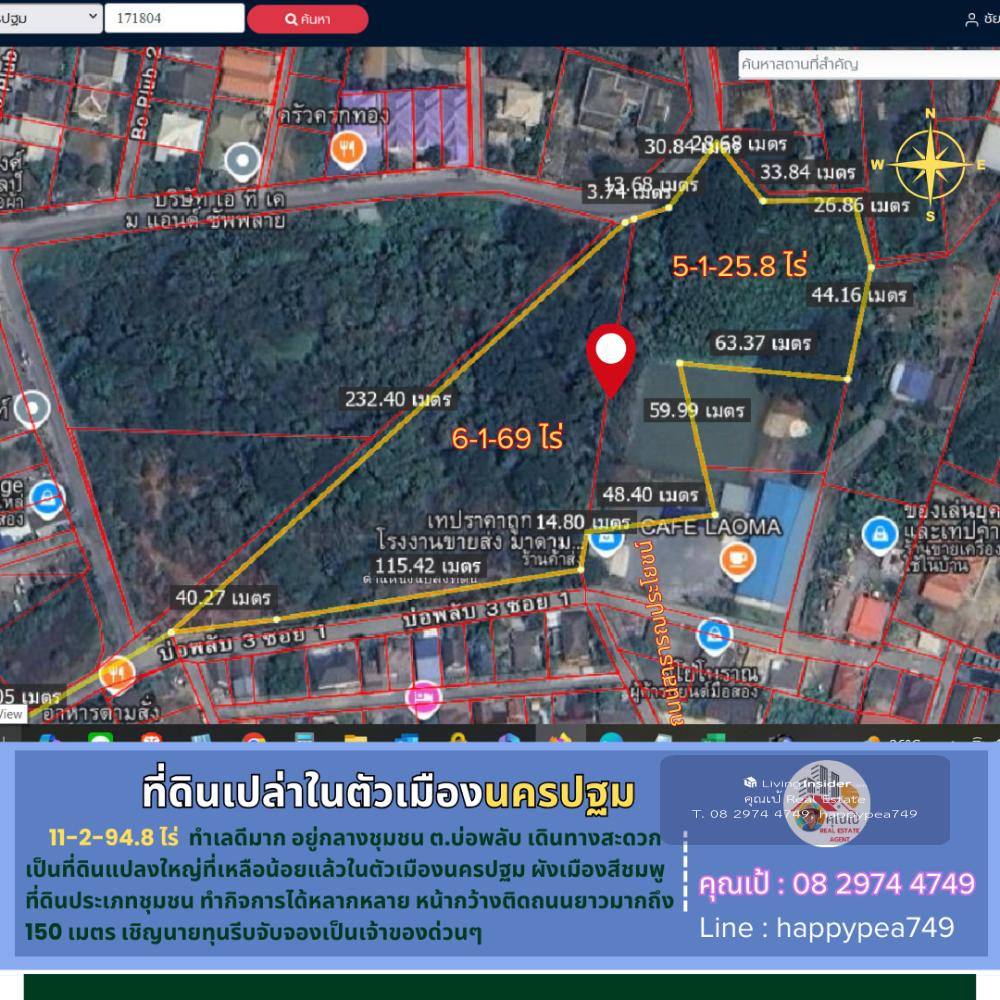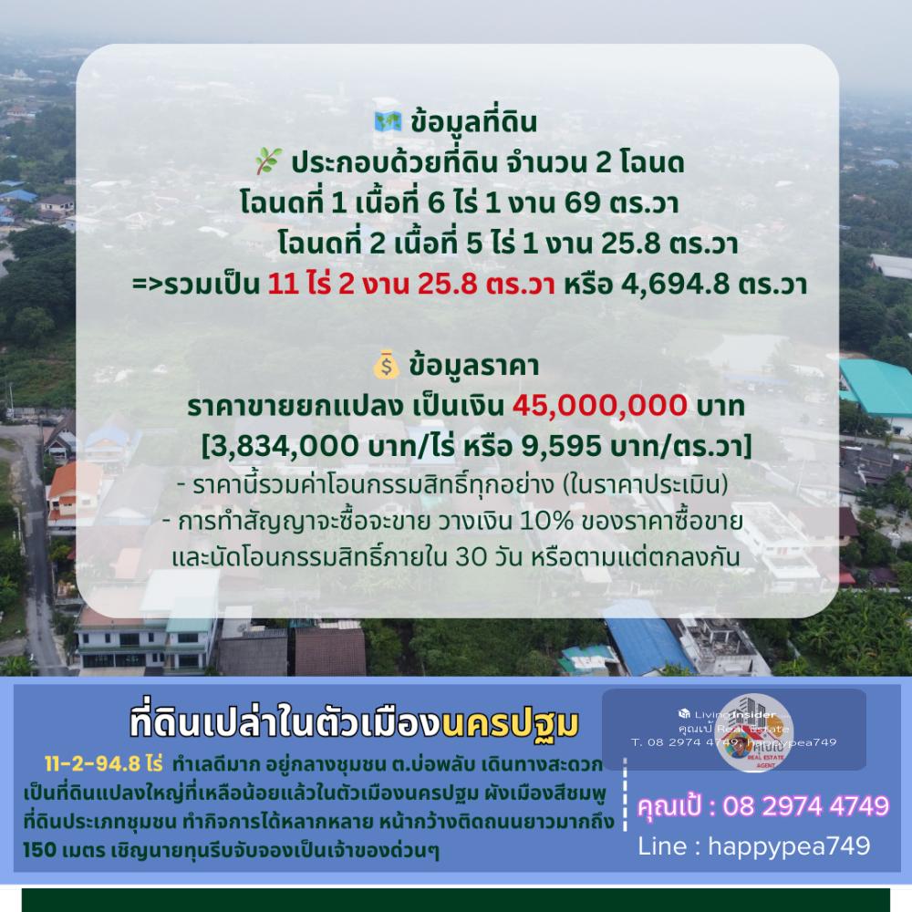 💰 Selling vacant land in Nakhon Pathom City, size 11-2-94.8 rai, very good location, in the middle of the community, Bo Plap Subdistrict, convenient transportation It is a large plot of land that is left in the small amount in Nakhon Pathom city. Pink urban plan, community land, can be invested in various businesses. Wide frontage on Bo Phlap Road 3, Soi 1, length of up to 150 meters, invite investors to hurry and reserve ownership quickly. 🚧 Location Bo Plap 3, Soi 1, Bo Plap Subdistrict, Nakhon Pathom Municipality, Mueang Nakhon Pathom District, Nakhon Pathom 73000 📍Pin navigation https://maps.app.goo.gl/ToE24zjWcqUMRBA77 📍 Nearby important places Phetkasem Road 2.9 km. Phra Pathom Chedi 3.9 km. Wat Phailom (Luang Pho Phul) 3 km. Sanam Chandra Palace 5.3 km. Big C Supercenter Nakhon Pathom 3.8 km. Central Nakhon Pathom 7.6 km. Sinphaet Hospital Nakhon Pathom 8.2 km. Nakhon Pathom Rajabhat University 8.8 km. Makro Nakhon Pathom 11.7 km. Mahidol University Salaya 34.8 km. 🧶 Pink urban planning area, community land type 🗺️ Land information 🌿 Consists of 2 land title deeds 💰 Price information Selling price for the whole plot is 45,000,000 baht [3,834,000 baht/rai or 9,595 baht/sq.wa] - This price includes all transfer fees (at the appraised price) - Contract of sale, deposit 10% of the purchase price and arrange for the transfer of ownership within 30 days or as agreed 🌟 I am an independent agent. I am in contact with the owner of this property. If you are interested, please consult and discuss with me 📢For more information, contact 🤵Khun Pae Real Estate Agent Accepting deposits, buying and selling beautiful land for investment, business and residence 📞Tel. Contact number 📟 Line : happypea749 Click https://line.me/ti/p/WbmkWfUuvu 🎉See other land plots https://www.livinginsider.com/public_profile/1/eDbjy.html #Nakhon Pathom land #Nakhon Pathom land development #Bo Phlap land #11 rai land #Nakhon Pathom vacant land #Nakhon Pathom housing development #Bo Phlap 3 #vacant land #housing development #pink land