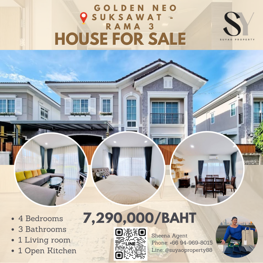 SYR2394 House Golden Neo Suksawat - Rama 3 Selling price 7,290,000 Baht 📍Near King Mongkut//'s University of Technology Thonburi - Bedroom 4 / Bath 3 - Size 151 sq.m / 39.90 sq.wah. / Floor 2 🚗 2 Parking Contact for viewing Phone: Contact number (Sheena) WeChat: suyaoproperty999 Line Official: @suyaoproperty88 Line Official: https: //lin.ee/keFefcy Welcome Co-agent