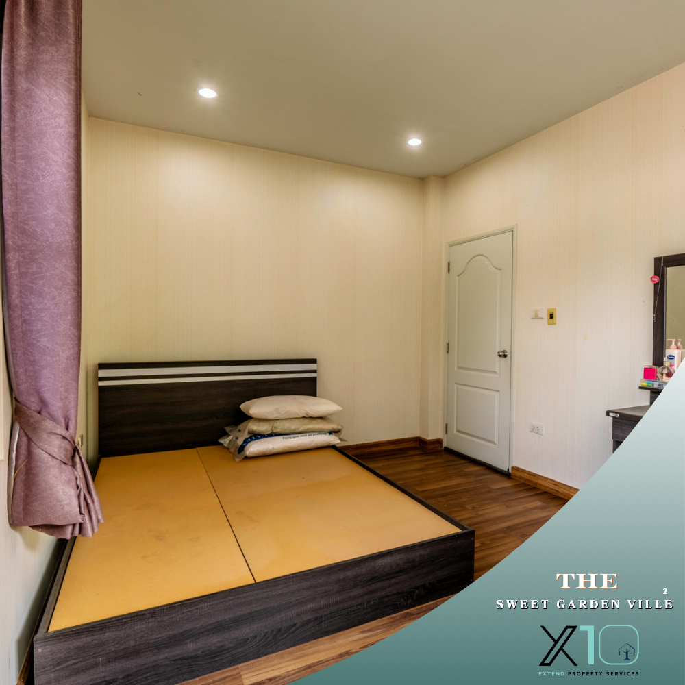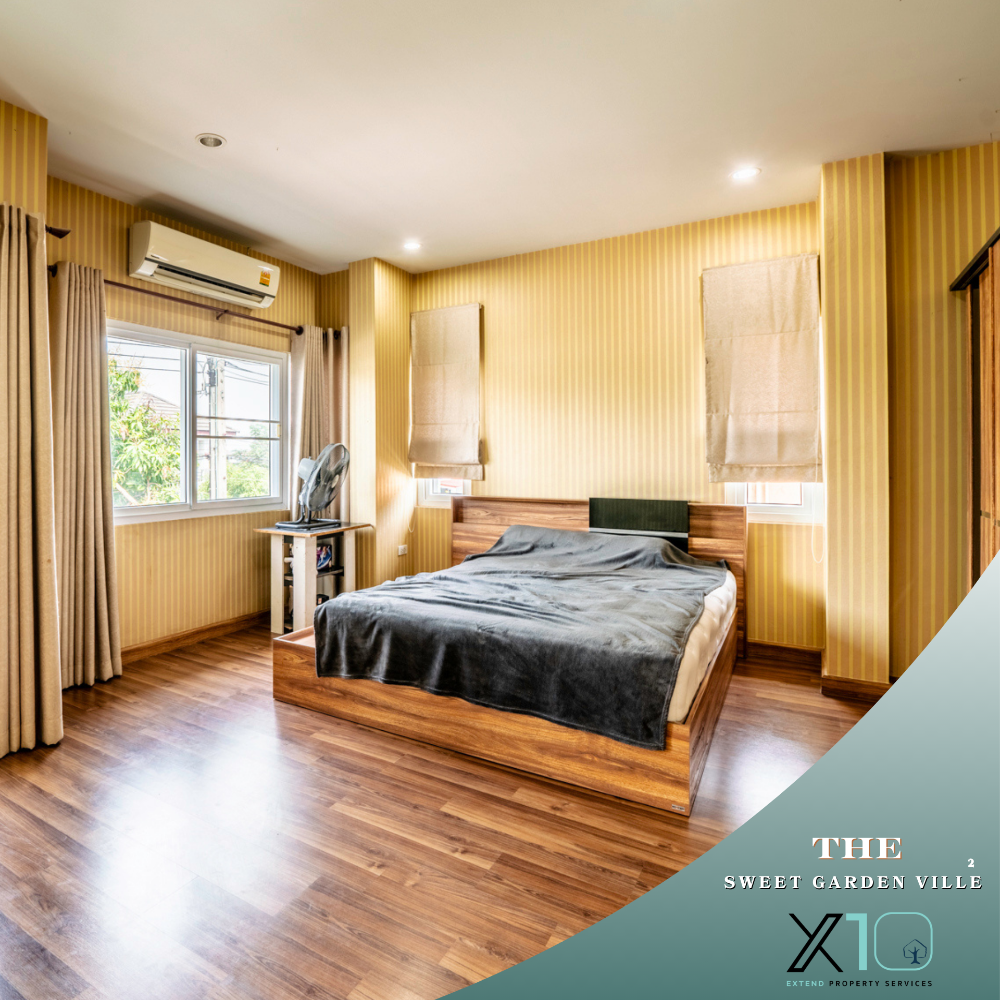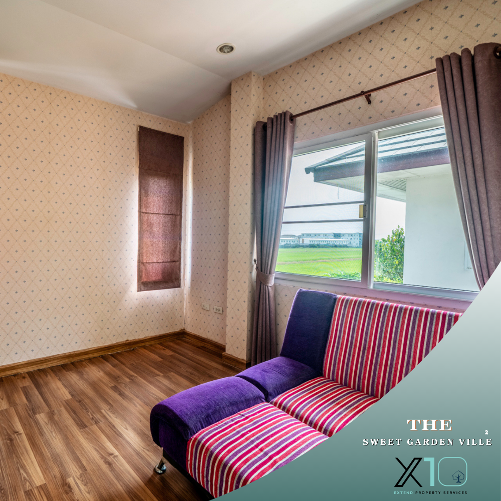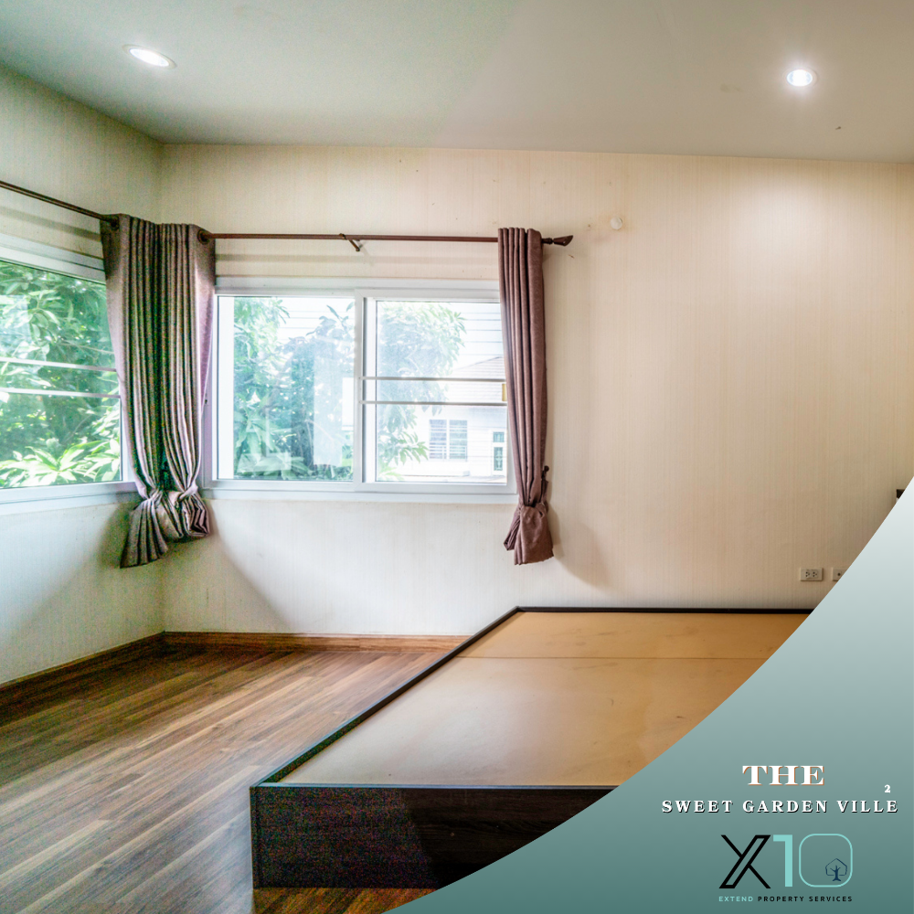 2-storey detached house with a garden area around the house 3 bedrooms, 3 bathrooms, 1 living room, 1 kitchen Parking 2 cars The interior according to the whole condition -Curtains - Bed - Air conditioner - 2 water heater - Water pump+water tank - Built-in kitchen Facilities- Park in the project - Fitness Room - Swimming pool - Central garden - CCTV (CCTV) - 24-hour security Near the Chatu Choti Expressway 1.8 km . It takes 5 minutes Near the motorway 5 km. It takes 9 minutes ☎️ Make an appointment before visiting the project/For more information, please contact ☎️ Line https://lin.ee/ mkxedym or call Contact number