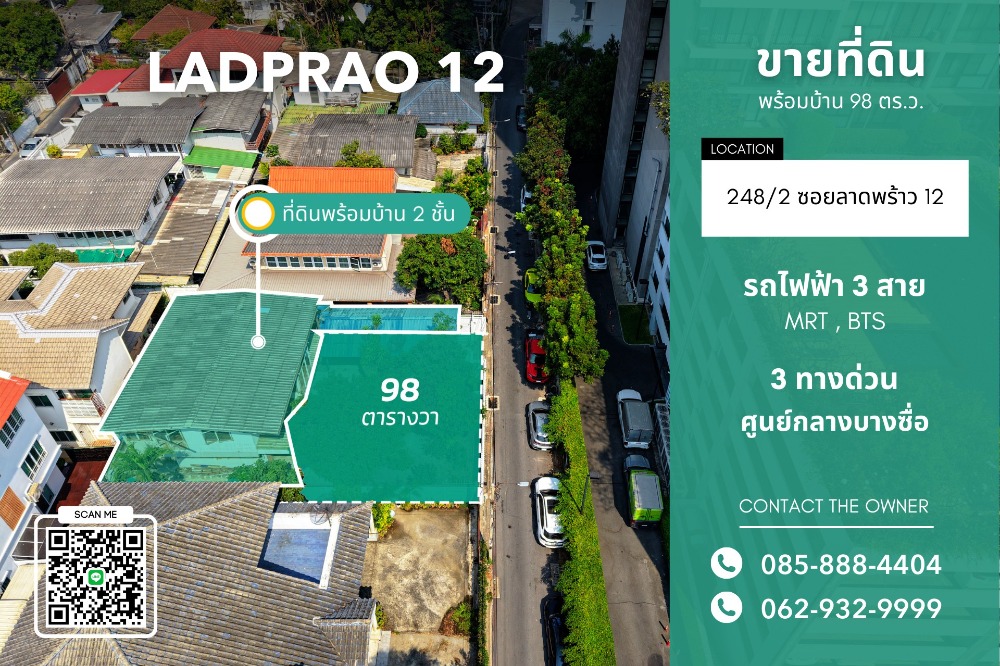 Urgent sale of land with 2 -story house, good location in the center of the city, Soi Lat Phrao 12, near 3 electric train Location: 248/2 Soi Lat Phrao 12, Chomphon Subdistrict, Chatuchak District, Bangkok 10900 Size: 98 Sq. Details Land for sale with a 2 -story house near Soi Lat Phrao 12, only 115 meters. The land is a square, 17 meters wide, 24 meters deep. Ladprao Good location, convenient to travel in and out near 3 electric train and near MRT Lat Phrao, suitable for home office, office, restaurant, cafe Nearby places: - Central Ladprao 1 km - Union Mall 700 meters - Big C Express Ladprao 200 m - Chatuchak State Park - Home Pro Location and travel : - Near the connection point of the 3 BTS (BTS Green Line, Lat Phrao Intersection Station, BTS Yellow Lat Phrao Station and MRT Blue Lat Phrao Station and Phahonyothin Station) - Near 3 expressway (Vibhavadi -Utra Phimuk Expressway , Srirat Expressway, Prajimirat Ya Expressway) - Bang Sue Central Station 4.5 kilometers - MRT Lat Phrao 750 meters - Enter Soi Lat Phrao, only 115 meters Map: https: // maps. App.goo.gl/wy4r3gctx1g7ysyd7 Video: https://www.youtube.com/watch?v=LS-5VQDMCQ0 Selling 22,900,000 baht (transfer fee per person) Call 085- 888-4404, Contact number (Boss-Owner) Line ID: Petiikarn or https://line.me/ti/p/7wofcmh-6o