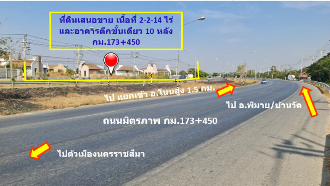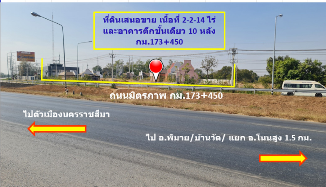 Land for sale, Mittraphap Road, km. 173-450, Don Wai Subdistrict, Non Sung District, Nakhon Ratchasima, commercial and industrial location, 2 rai 2 ngan 14 sq m, city plan, green area. :: Highlights :: Land next to Mittraphap Road, 6 lane road, outbound side. Non Sung District is located close to Nakhon Ratchasima city. which is the economic center of the northeastern region And there are transportation routes that connect to various regions easily. The land is only 1.5 km from the entrance road to Non Sung District. Surrounding is an agricultural area. But next to Mittraphap Road is a commercial and industrial location with many businesses. The land has a frontage of 120 meters next to Mittraphap Road. The entire plot has been improved and filled with soil. On the land are 10 one-story buildings. The construction condition is about 80-90%. They can be repaired and renovated for business use, such as a cafe-style building / for rent as an office company - monthly rental house / resort / tourist food court. The selling price for the entire plot is calculated based on the land price only. The 10 buildings will be given away free of charge. Selling price is 12,500,000 baht (negotiable) ⬇️Price reduced from 16.5 million baht. All transfer expenses are split 50/50 by each party. If interested, contact: Price negotiation: Contact number | Contact number Contact via Line: jackleee only. :: Details :: - Size 2 rai 2 ngan 14 sq m. The shape of the land resembles a triangle. It is the location of 10 buildings. The construction condition of the buildings is 80-90%. Construction costs are not calculated in the selling price. All are given for free. :: Nearby places :: - Don Wai Subdistrict Administrative Organization Office - Non Sung Provincial Police Station Nakhon Ratchasima Province - Wat Don Wai - Ban Tonot School - Ban Don Wai School Coordinates: http://maps.google.com/maps?q=15.097867,102.279268 Price: 12,500,000 baht If interested, contact: JACK Contact number Line: jackleee