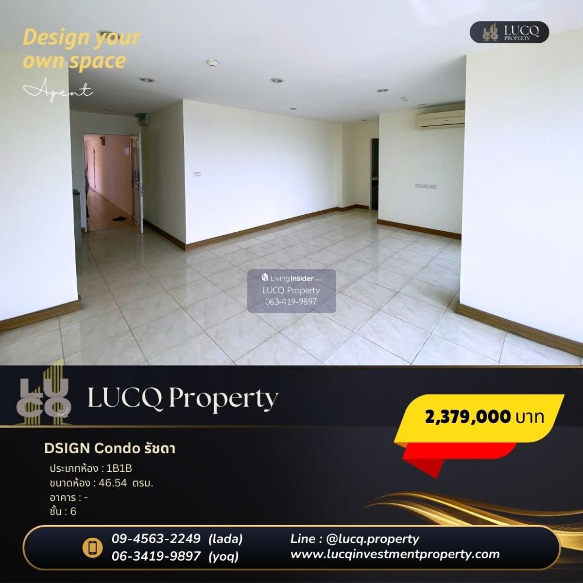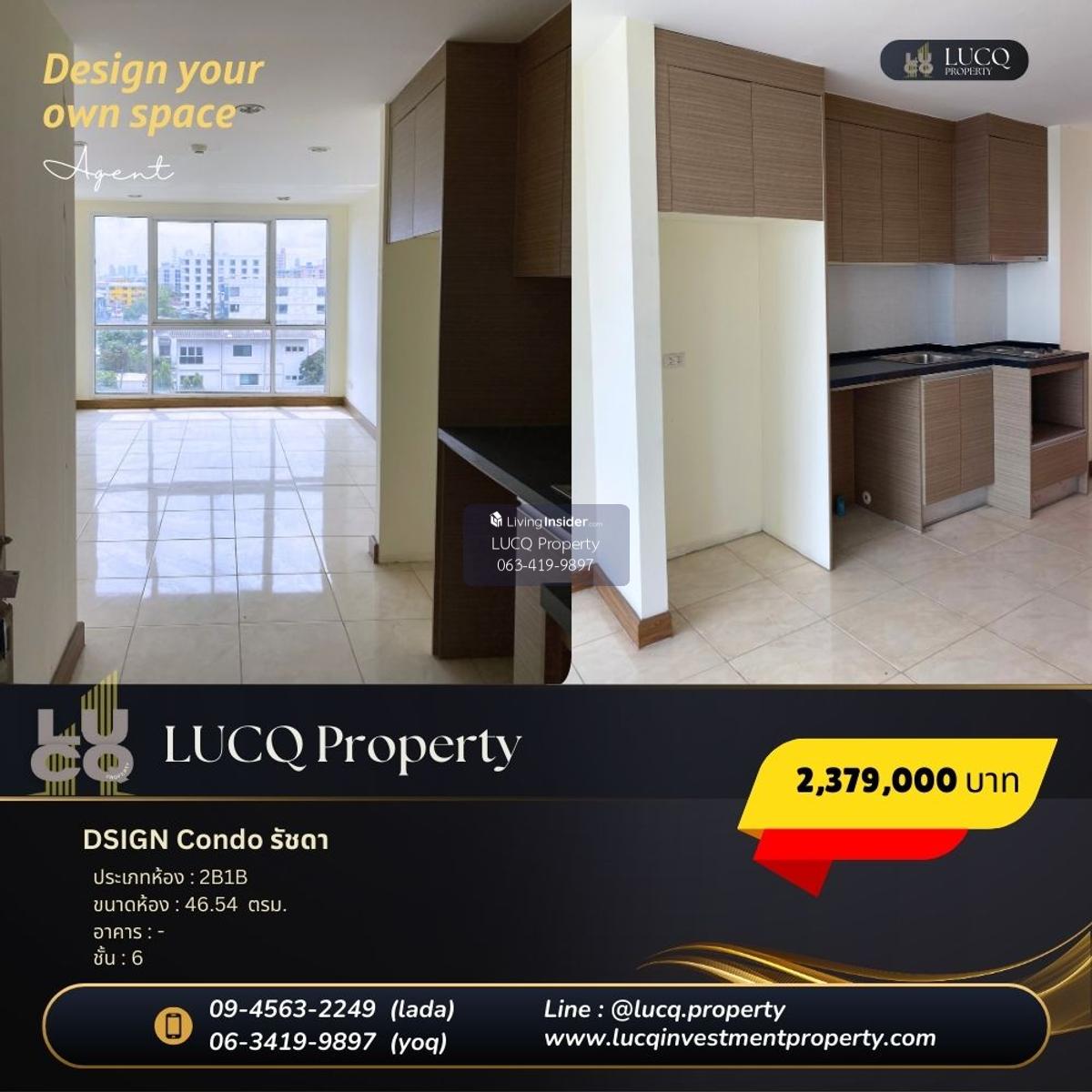 Design Condo Ratchada (DSIGN CONDO RATCHADA) Located at 20 June Road, Samsen Nok Subdistrict, Huai Khwang District, Bangkok Connected to the surrounding area, including Ladprao, Bang Khen, Ratchadaphisek Vibhavadi, Phahonyothin Sutthisan, Rama 9, Phetchaburi Starting at 2,379,000 baht to 3,191,000 baht And the kitchen that is separated in proportionally The 5th floor, price 3,191,000 baht, living area 63.3 sqm, 2 bedrooms, 2 bathrooms, 2nd floor, price 2,379,000 baht, 46.54 sqm, 1 bedroom, 1 bathroom, 4th floor, price 47.73 sqm, 1 bedroom (? 47.73 sqm, 1 bedroom, 1 bathroom Internal facilities - Swimming pool - Fitness - Shuttle van (? Huai Khwang (Huai Khwang MRT BLUE LINE Station) Distance of 2.1 kilometers (5 minutes) - Blue Line Station Sutthisan MRT BLUE LINE STATION 3.3 kilometers (7 minutes) - The Street Ratchada) distance 3.3 kilometers (6 minutes) - Fortune Town). Minutes - Central Rama 9 (Central Rama 9) Distance of 4.7 kilometers (9 minutes) - G Tower Grand Rama 9) Distance 5.1 km (10 minutes)- Muang Thai Life Insurance Company Limited Rama 9 Hospital (Praram 9 Hospital) distance of 12.0 kilometers (6 minutes) - Criminal Court) Distance of 4.2 kilometers (7 minutes) - University of The Thai Chamber of Commerce) distance of 3.5 kilometers (10 minutes)- Rajabhat University. (Chandrakasem Rajabhat University) Distance 3.5 kilometers (10 minutes) For more information Phone Contact number (LADA) or Contact number (YoQ) Line Official: @lucq.property See other rooms at https://www.livinginsider.com/public_profile/1/fybjc.html (? # Condo for sale #dsign #Ratchada #Cheap condo #Second hand condo #1 bedroom #investment