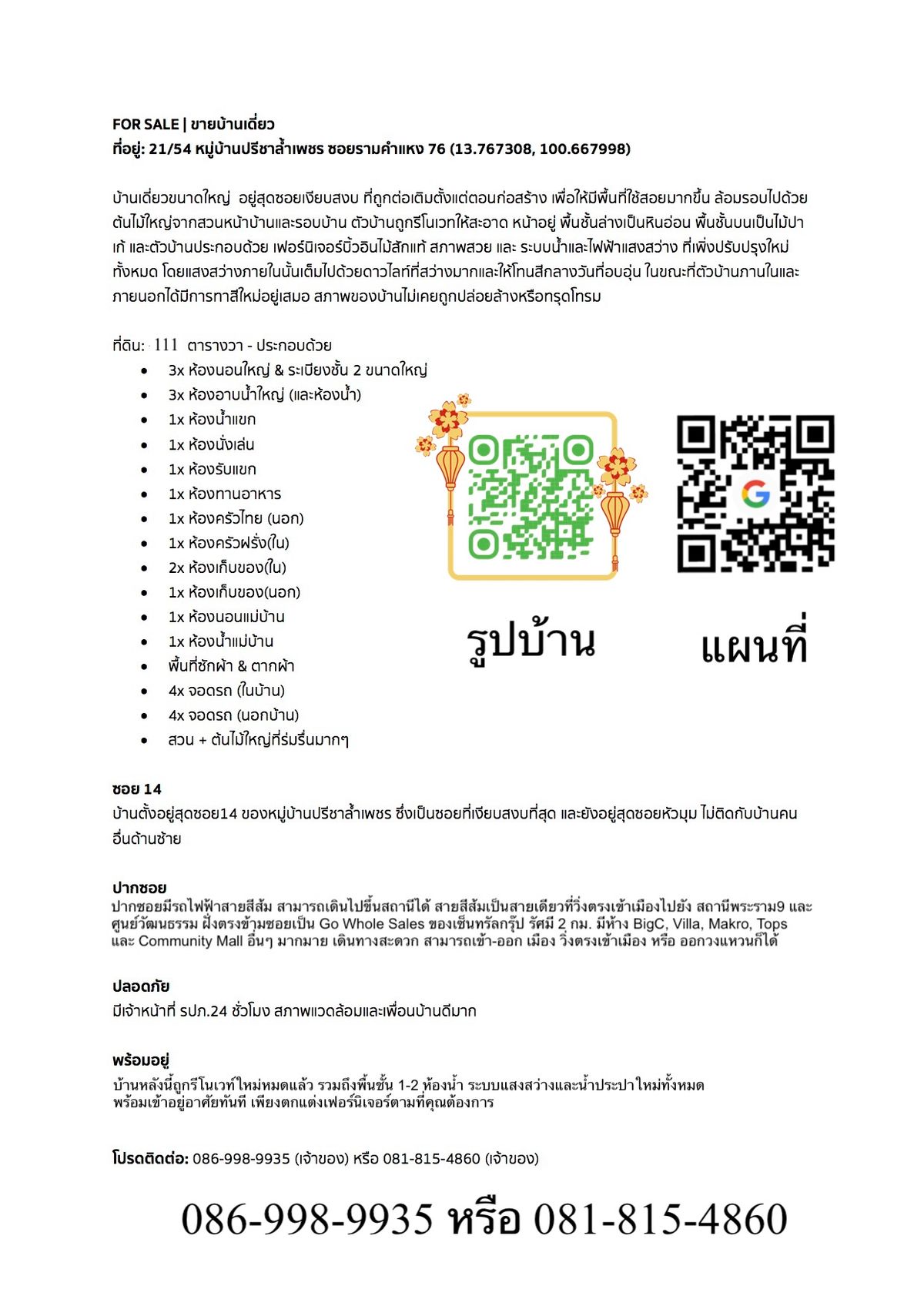 Details For Sale | House for sale Address: 21/54 Preecha Village, Soi Ramkhamhaeng 76 (13.767308, 100.667998) Google Map: https://maps.app.goo.goo/afr8ps2PCFWTFJW98 At the end of the alley, quiet That has been added since the construction In order to use more living space Surrounded by large trees from the front of the house and around the house The house is renovated to be clean and livable. The ground floor is marble. The upper floor is parquet. And the house is well ventilated There are both back air conditioning and water and electricity systems. That has just been renovated Especially the gutter in the ceiling, walking with a very bright star and gives a warm daytime tone or quite warm. At this time, the house inside and the outside has been painted in both the wall and surrounding the fence. The overall picture of the house has never been released or deteriorated Land: 111 square wah - consisting of 3x Bedroom & Large 2 Balcony 3x Big shower (And bathroom) 1x Living room 1x Local room 1x Buddha room 1x dining room 1x Thai kitchen (outside) 1x French kitchen (in) 2x storage room (in) 1x storage room (outside) 1x housekeeper 1x Housewifes bathroom Lashing area & clothes 4x Parking (in the house) 4X Parking (outside the house) The garden & large tree is very shady Soi 14 The house is located at the end of the Soi 14 of the Preecha Lam Phet village. Which is the most peaceful alley And still at the end of the corner alley Not attached to other peoples houses on the side The mouth of the alley Can walk up to the station The orange line has only one station that reaches the city to Rama 9 Station and the Cultural Center. The opposite side of the alley is the Go Whole Sales of the Central Group, 2 km away. There are BigC, Villa, Makro, Tops and Community Mall. Run straight into the city Or can release Ring Thawi Watthana Safe There is a security guard. 24 hours. The environment and neighbors are very good Ready to stay This house has been renovated. Including the floor 1-2, bathroom, lighting system and all new water supply Ready to stay immediately Just decorate the furniture as you want Please contact: Contact number (owner) or Contact number (owner)