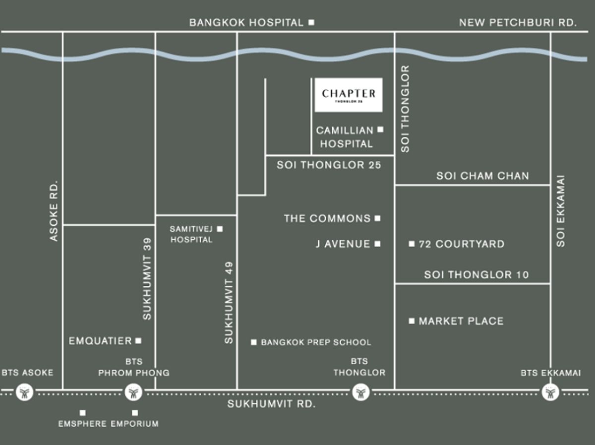 The Chapter Thonglor 25 project is located in the late Thonglor area. Quite to Phetchaburi side And not on the main road Will have to enter the alley beside Camillian Hospital for about 700 meters, so