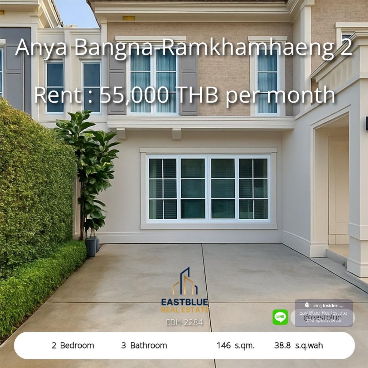 Home for Rent at Anya Bangna - Ramkhamhaeng 2 Near Mega Bangna Ready to Move In: Juy 1, 2025 Bedrooms • 3 Bathrooms • 1 Parking Space • Living Room Built-in Kitchen • Fully Furnished and Electrical Appliances • Garden View, Private and Serene Atmosphee (? Inside The House Ret: 55,000 THB/Month Contract: Minimum 1 year Deposit: 2 months + 1 month in Advance Project Highlights :(? Throughout • Clubhouse, Swimming Pool, Fitness Center • 24-Hour Security with CCTV Ramkhamhaeng 2 Hospital - 1.5 km • Suan Luang Rama IX Park - 3.2 KM • SEACON Square - 5.5 km • Paradise Park - 5.8 km KM • Biteec bangna - 8.3 km Schedule A Visit: Contact Ploy East Blue Contact number For rent at Ananya Bangna -Ramkhamhaeng 2 Near Mega Bangna. Ready to enter: 1 July 2025 (? Wow • 2 bedrooms • 3 bathrooms • 1 parking • Living room, built -in kitchen set • Complete furniture and electrical appliances • Personal garden view • Do not allow animals • No smoking Rental: 55,000 baht/month Rental contract: Minimum 1 year Insurance: 2 months + 1 month in advance Project strength : • Modern Tropical Design House Shady garden throughout the project • Club house, swimming pool, fitness • 24 -hour security system with CCTV • Personal atmosphere near Bang Na -Ramkhamhaeng Road 2 Nearby places : • Ramkhamhaeng Hospital 2 - 1.5 km • Suan Luang Rama 9 - 3.2 km • Seacon Square - 5.5 km • Paradise Park - 5.8 km • Mega Bangna - 6.5 km. Appointment to contact Ploy East Blue Contact number Project: anya bangna-ramkhamhaeng 2 ID: EBH-228PHz 2 Baht House AREA SQ.WAh Retal Price: 55,000 THB per month Contact, Appointment for viewing. Line: @eastblue/https://lin.ee/ynwhbfs WhatsApp: Contact number Website: https: //www.eastblueeth.com- ❗️❗️Co-Agent Contact LINE@ only❗️❗️