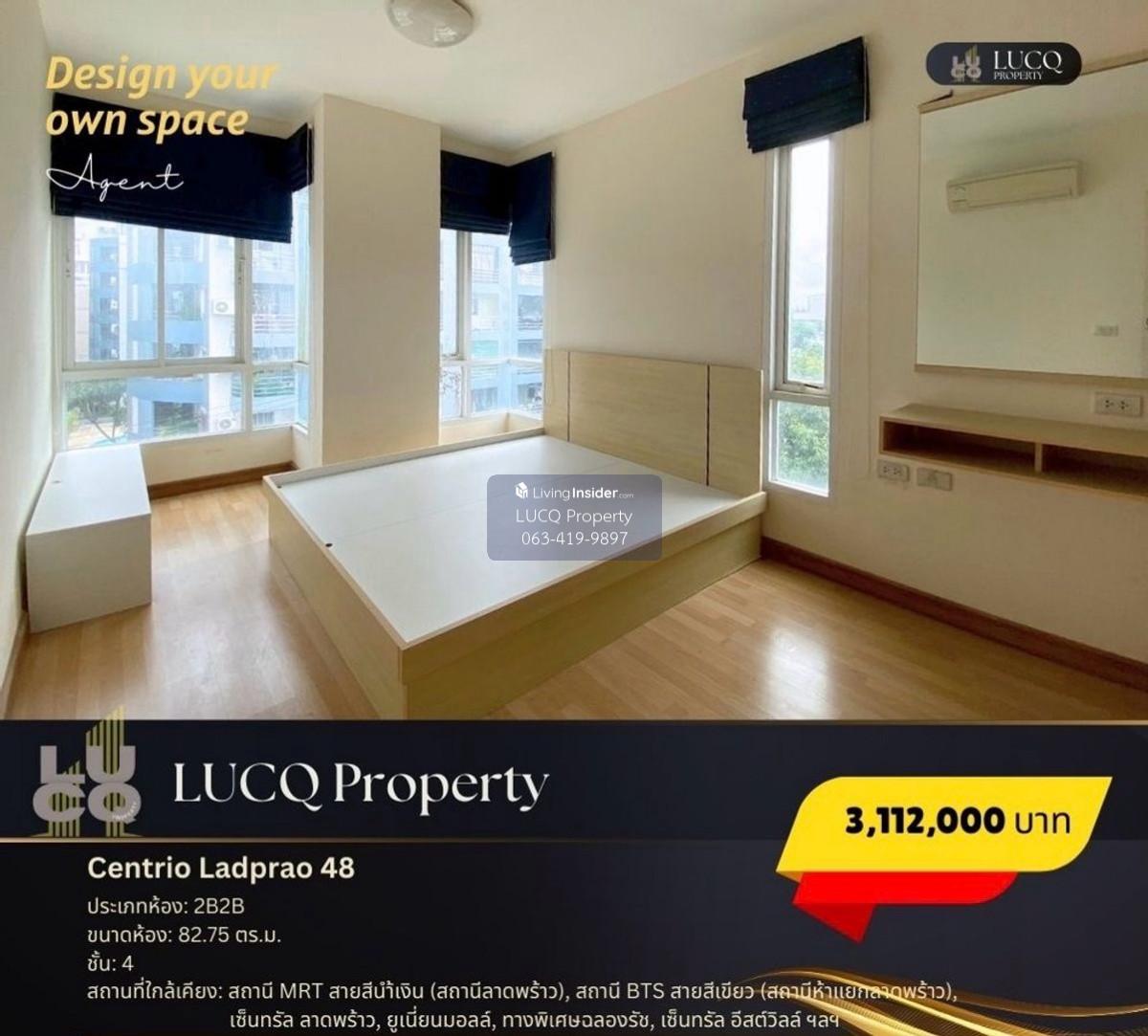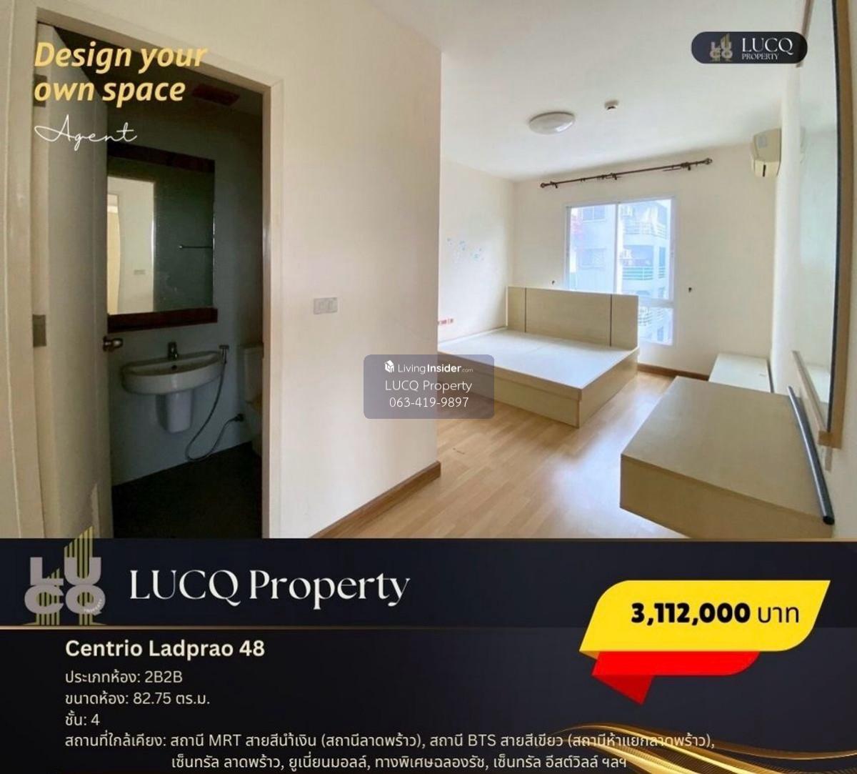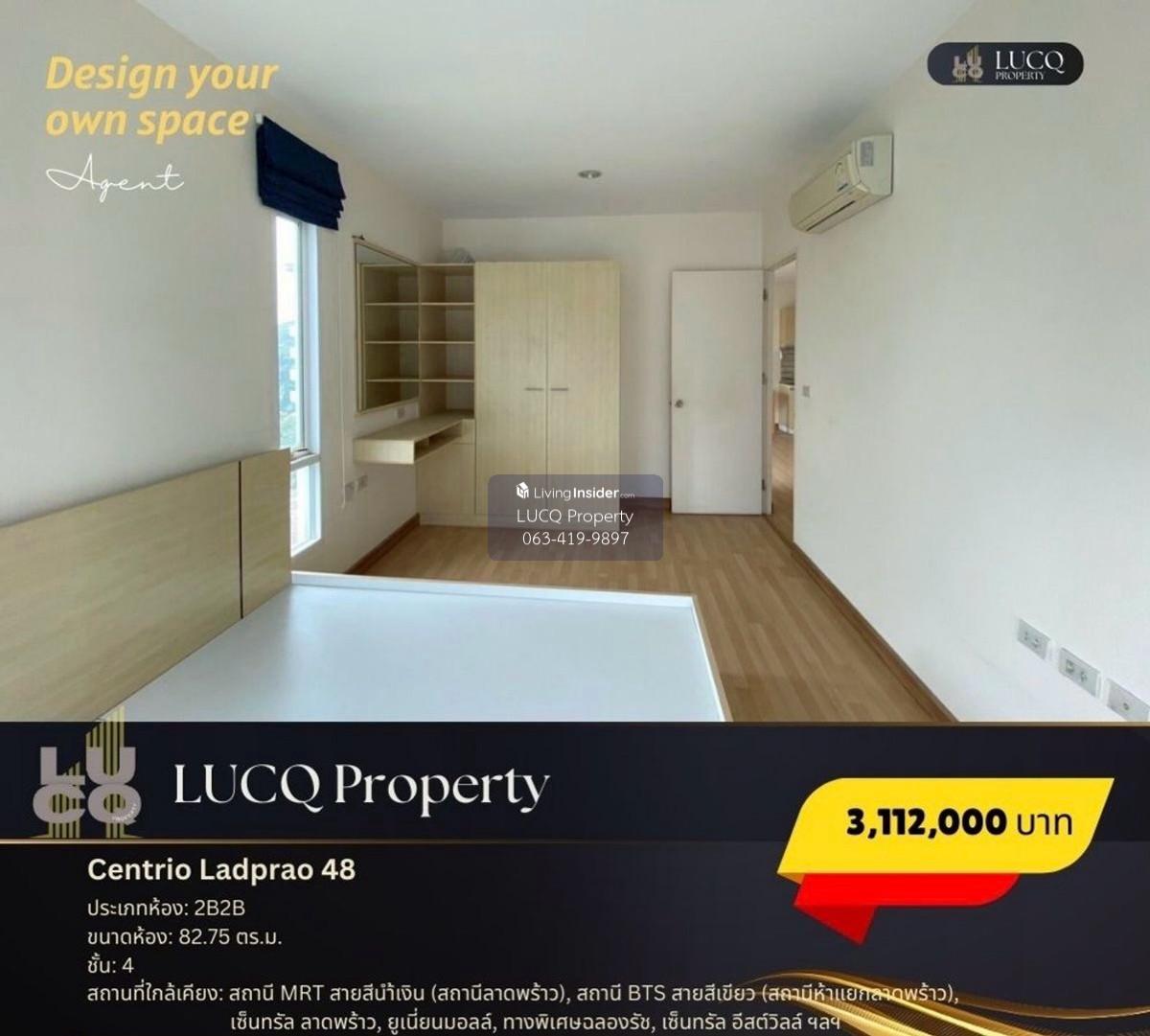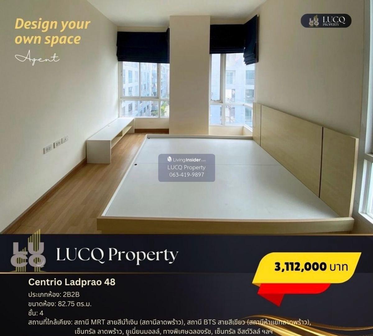 Centrio Condominium Ladprao 48 () 🏢 Condominium in the heart of 82.75 sq.m., which provides high privacy with Parking Guarantee, which provides ownership of every parking lot. Near the sky train station 2 bedrooms | 2 bathrooms, suitable for investment and self-residence 🌳 Facilities 24-hour security system with CCTV, Club House, Key Card Access, Wi-Fi and Fitness Ladprao • Union Mall • Central Rama 9 • Near the leading schools and universities such as Horwang School, Kasetsart University, Chandrakos Rajabhat University, etc. Near Chatuchak Market, Department of Land Transport, Phraya Phraya Hospital, Phraya Yothin Hospital, Wimut Temple, etc. Travel Can access 2 routes from Lat Phrao and Sutthisarn diagnosis. Connect many main roads, including Ratchada, Phahonyothin, Vibhavadi, Wang Thonglang, Bang Kapi, just a few minutes from the Blue MRT (Lat Phrao Station) and BTS Green Line (Five Ladprao Intersection) () At a great price of only 3,112,000 baht Contact number (LADA) Line Official: @lucq.property