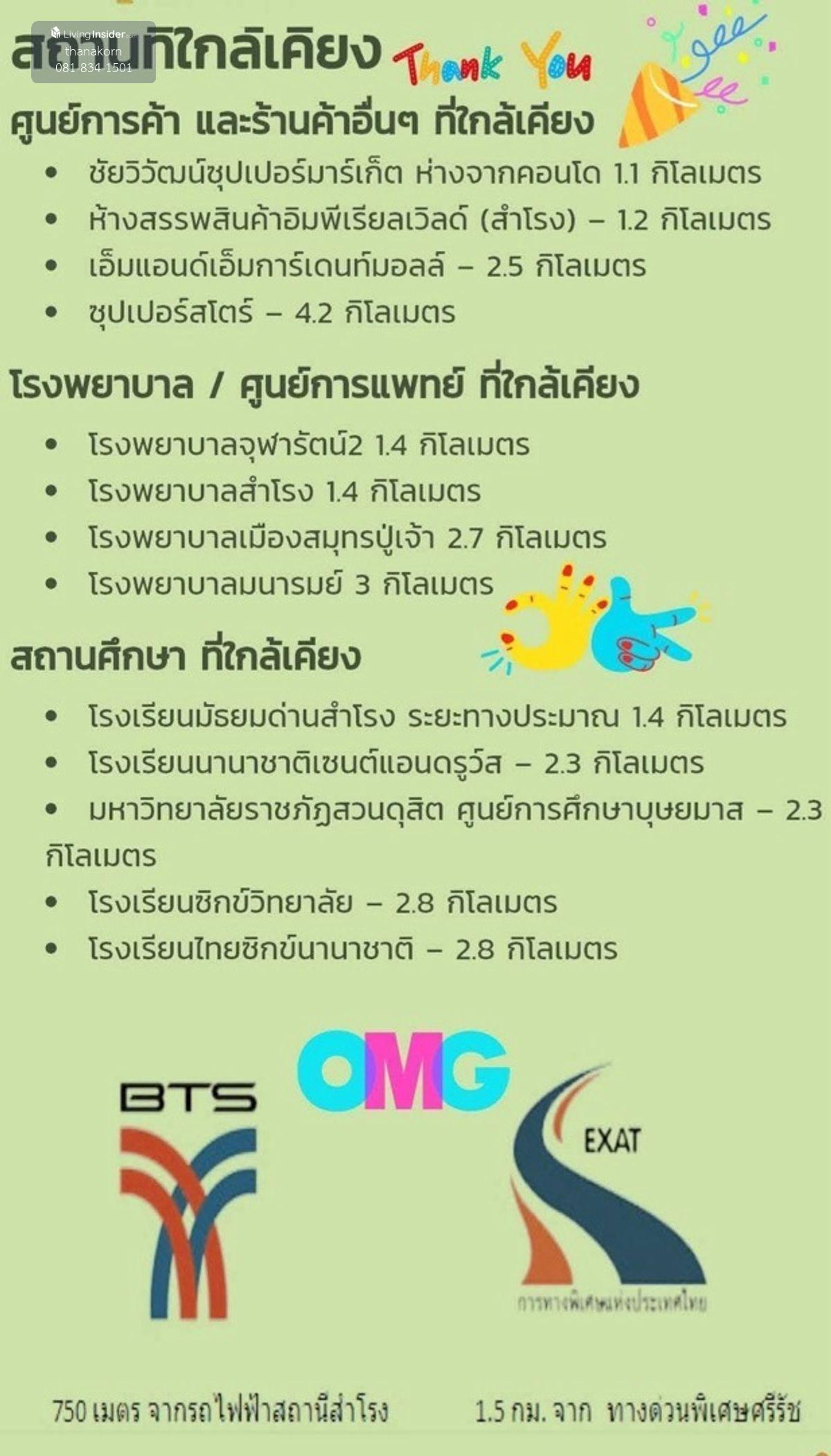 Condo Tel Thepharak Condo near the BTS Samrong (750 m) The room is on the 8th floor, 27 sq.m. 1 bedroom, 1 bathroom 1 kitchen with a beautiful view of the view. Good ventilation Free list (new furniture) - Install new air - New closet (? 5 feet 5 feet + new mattress - New dresses - Change the new bathroom equipment - Change the whole door - New dish The whole room - New tile terrace and newly painted with beautiful views Facilities - There is a clean and safe lift - There is a parking space - 24 -hour security - There is a private fitness room Freeon Interested, contact the bargain @Line Contact number Khun Lek Room owner (Refrain from accepting agents)