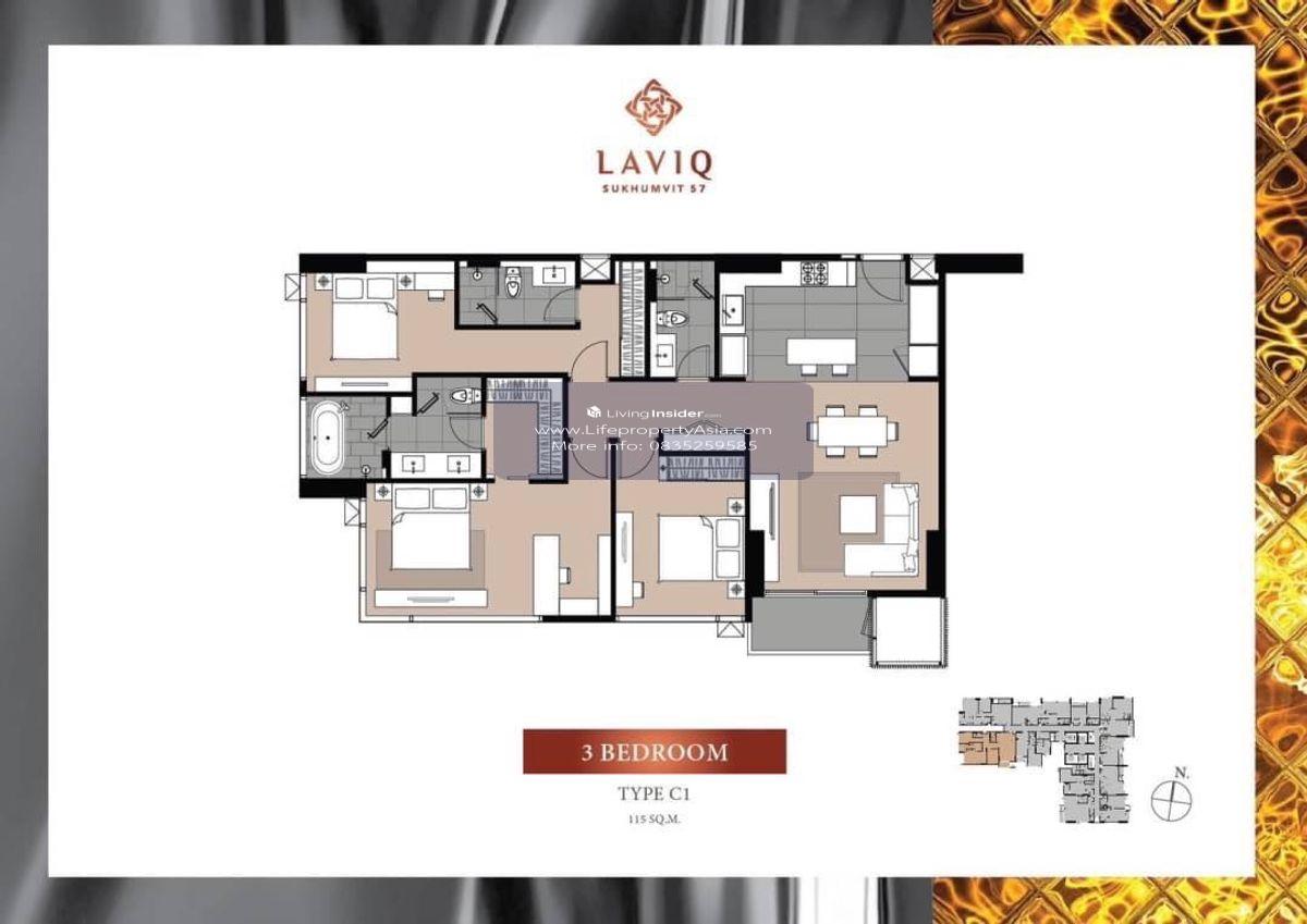Laviq Sukhumvit 57 Condo for Rent near BTS Thonglor Corner unit | High floor (10+) | 114.66 sqm 3 Bedrooms, 3 Bathrooms | Fully furnished with appliances 💸 Rent: 140,000 THB/month 💰 For Sale: 34.5 Mil