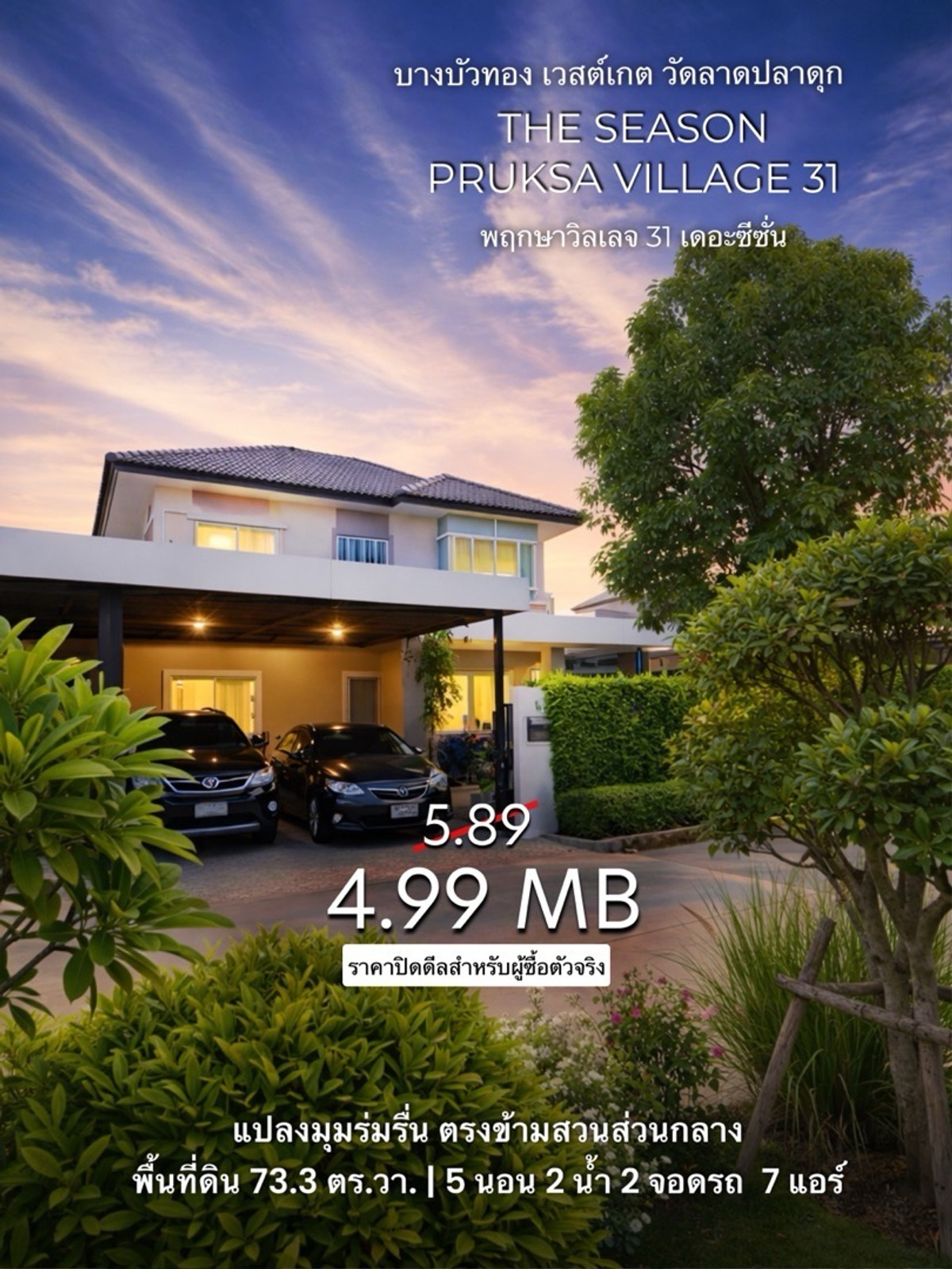 🏡 Large 5-bedroom, 300 sq.m. detached house in Bang Bua Thong, near Westgate – Great value! 💥 Original price 5.89 million baht, now only 4.99 million baht. 💰 Cheaper than the market – detached houses in this area normally cost 80,000–100,000 baht per sq.wah. This one is now only 68,000 baht per sq.wah, with all the features you need! ✨ Unique features: • Large living space of 300 sq.m. • 5 bedrooms + multipurpose room Perfect for large families. • 73.3 sq wah corner plot adjacent to a central garden. The front of the house is open and airy. • Large kitchen extension + separate laundry area. • 2 fish ponds to enhance feng shui. • 7 air conditioners in every room. • Parking for 4 cars (2 inside the house, 2 in front of the house). 📍 Convenient and attractive location. • Near Central Westgate, IKEA Bang Yai, JAS Green Village. • Convenient transportation via Kanchanaphisek Road, Wat Lat Pla Duk, and Khlong Bang Sai. 🤝 Co-agents and investors welcome. 📊 Free loan consultations, complete process. 📞 Phisan Tel/Line: Contact number #BangYai #BangBuaThong #SingleHouse #NonthaburiHouse #PruksaHouseForSale #SecondhandHouseForSale #FindSecondhandHouse #Wat Lat Pla Duk #Westgate #Central Westgate #IKEA #IKEA Bang Yai #Kanchanaphisek #Pruksa Village #Westgate
