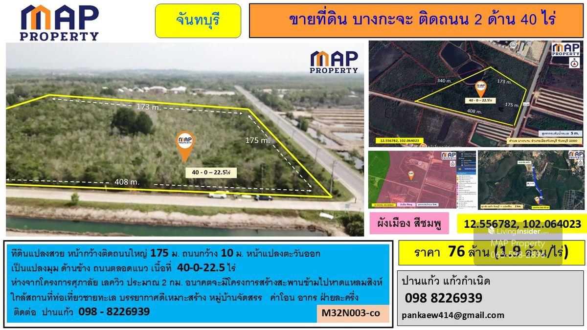 - Beautiful plot of land with a wide frontage on the main road of 175 m. - 10 m wide road facing the eastern side of the plot - Corner plot with a road along the side - Area 40-0-22.5 rai - Approximately 2 km from the Supalai Lakeview project - In the future, there will be a project to build a bridge to Laem Sing Beach - Near the beach tourism area - Good atmosphere, suitable for building a housing estate - Transfer fee, stamp duty, half each - Contact Pankaew 098 .822.6939