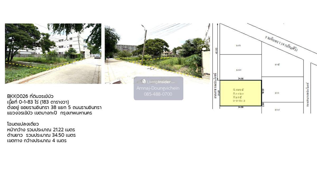 BKK0026 Crocodile Land Area 0-1-83 rai (183 square wah) Located on Soi Ram Inthra 38, Ram Inthra Road One title deed Width of approximately 21.22 meters Long side, approximately 34.50 meters Selling p